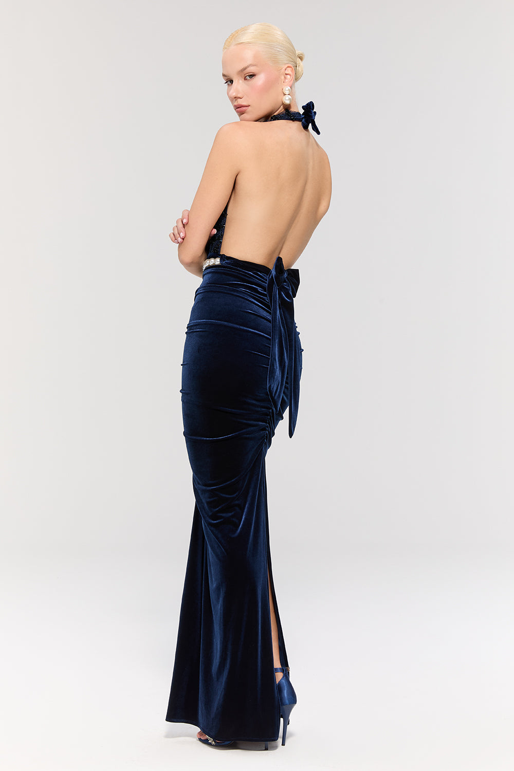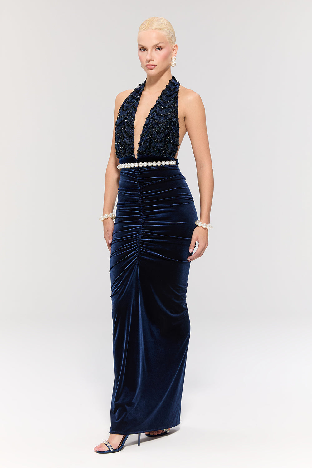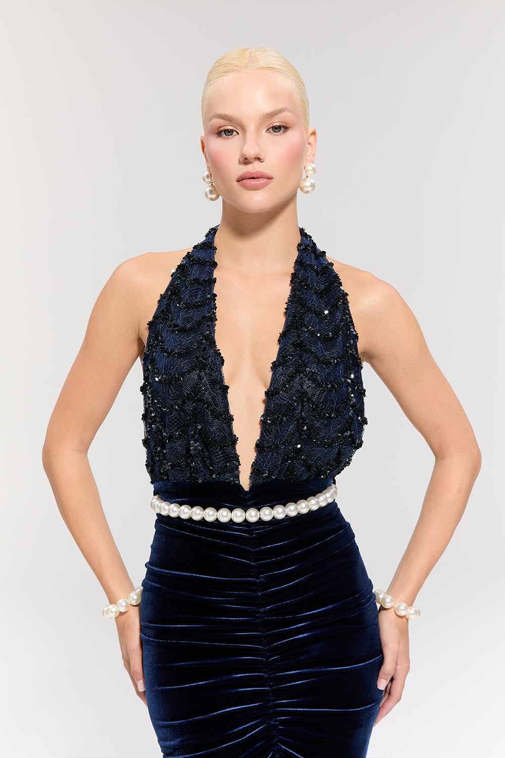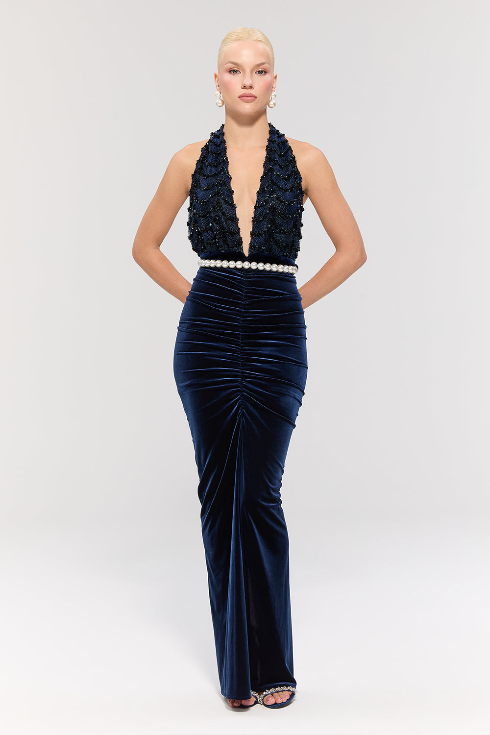 • Lacivert kadife dokusu asil bir şıklık sunarken, belindeki inci kemer zarif bir ışıltı katar.