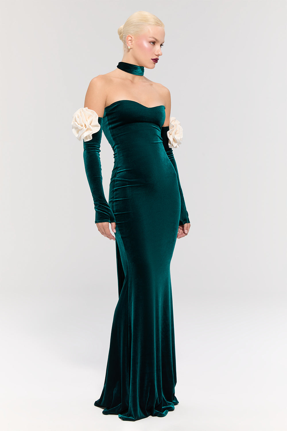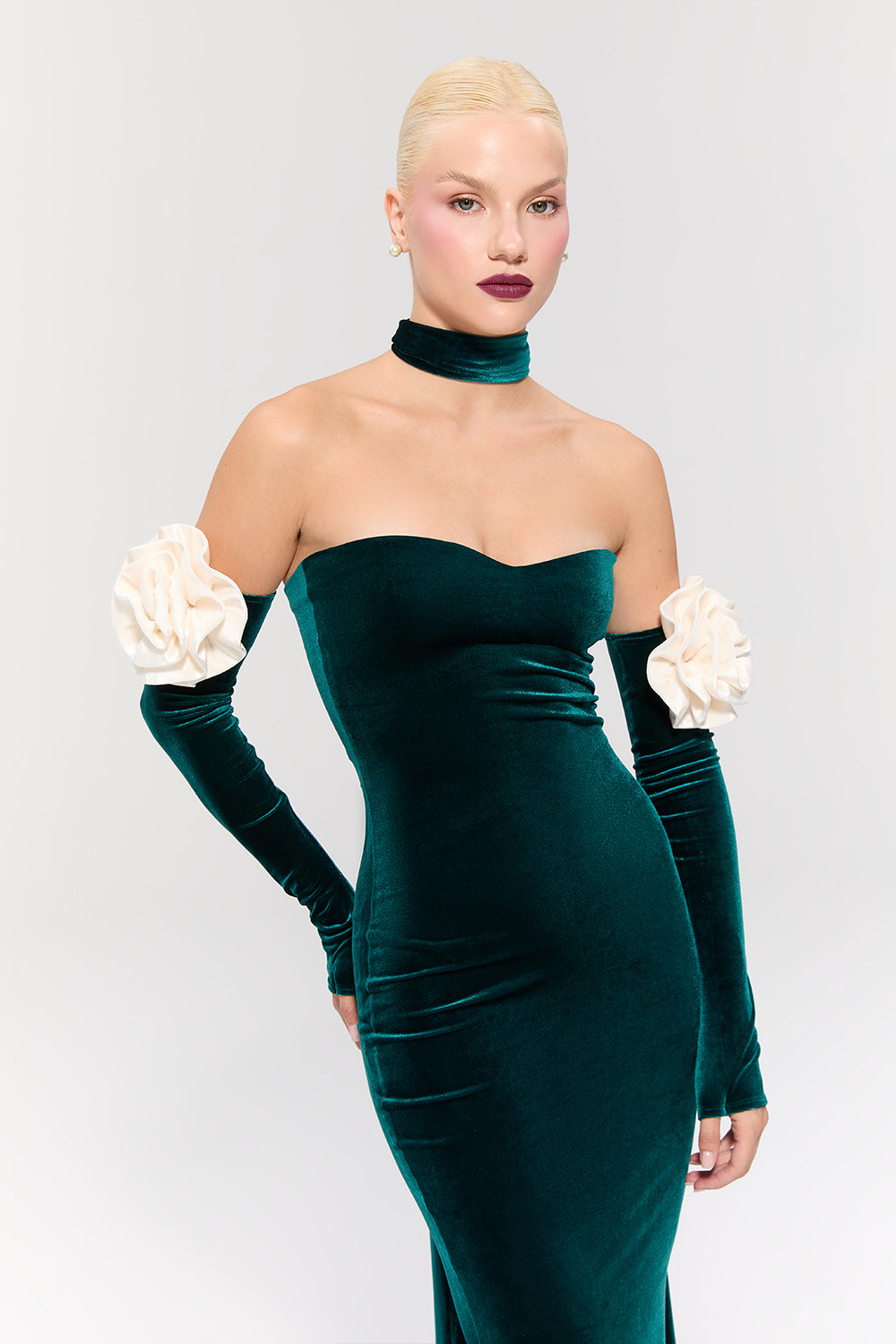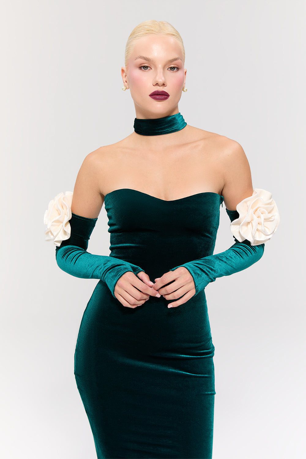 • Elbise, yeşil kadife dokusuyla sofistike bir görünüm sunarken, balık model kesimi zarif bir silüet oluşturur.