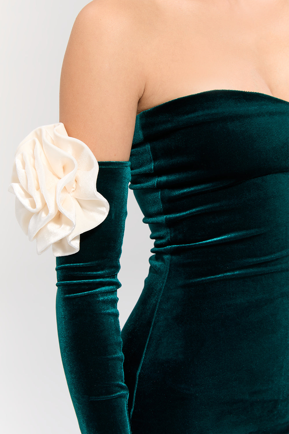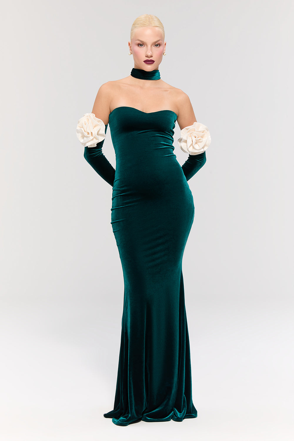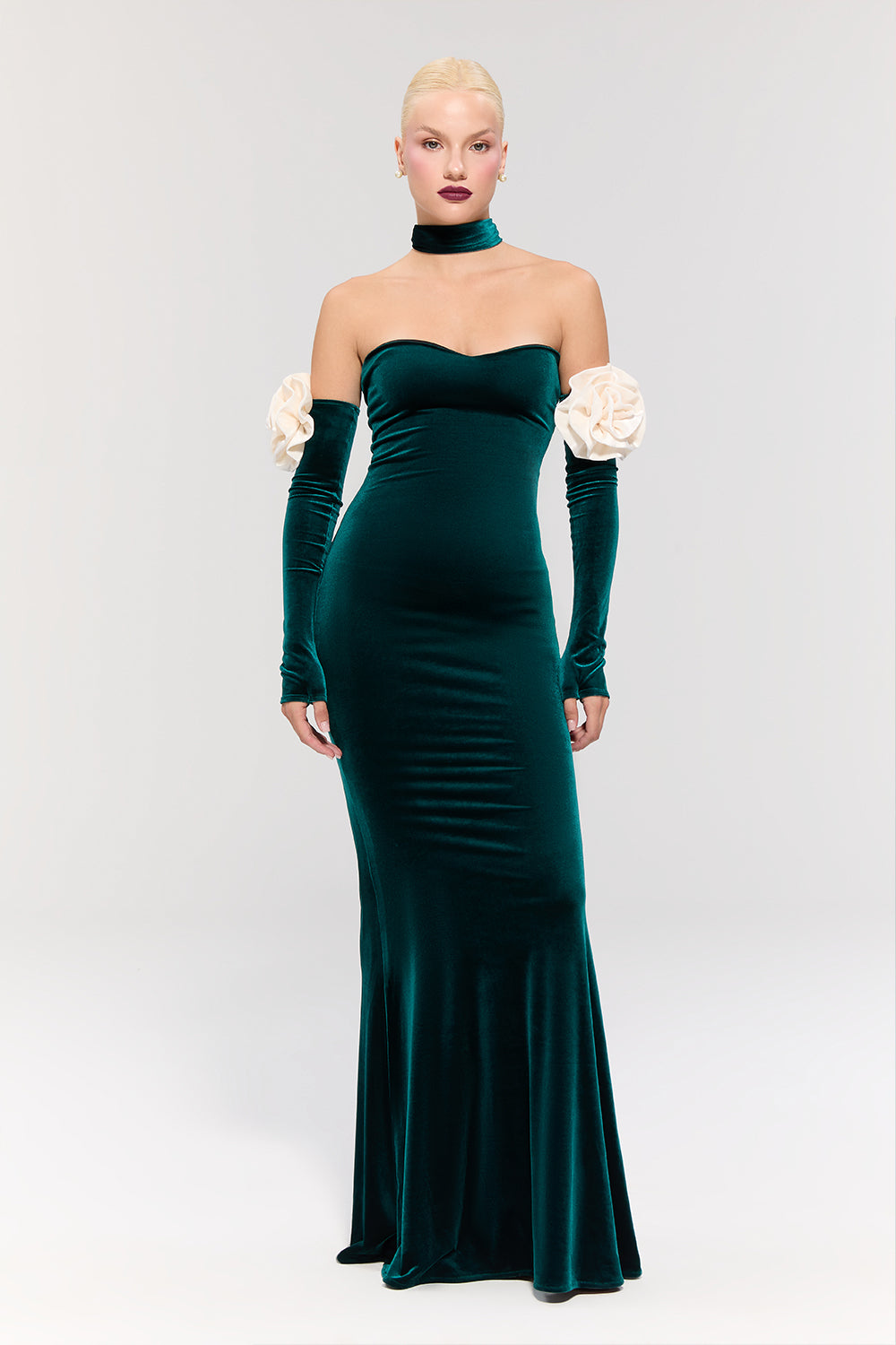 • Elbise, yeşil kadife dokusuyla sofistike bir görünüm sunarken, balık model kesimi zarif bir silüet oluşturur.