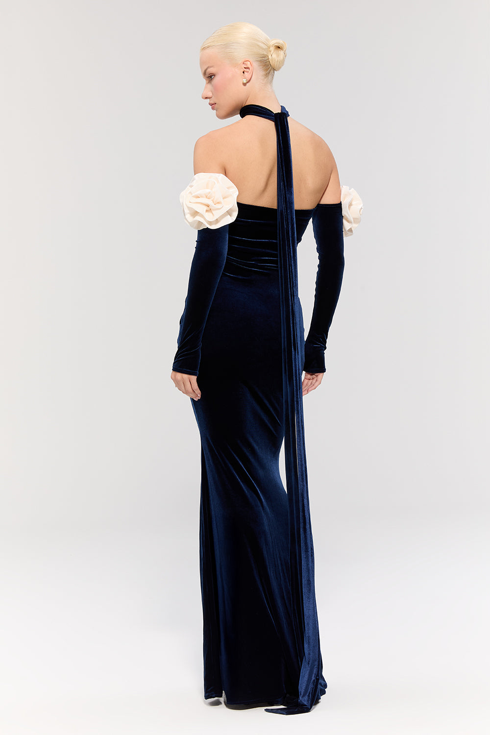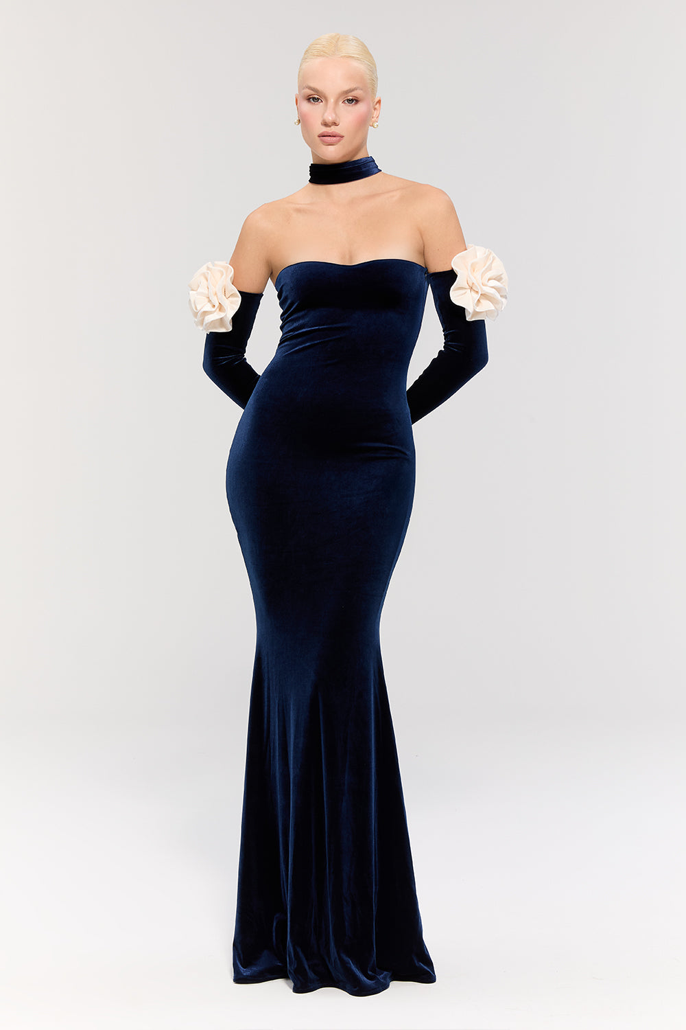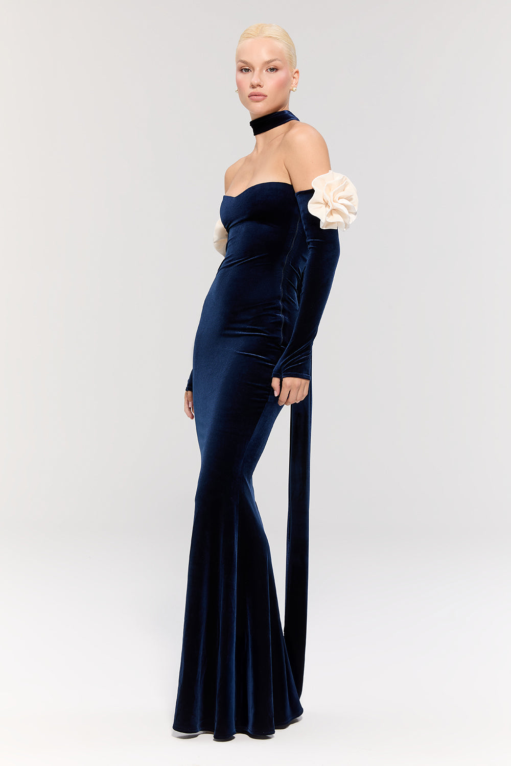 - Elbise, lacivert kadife dokusuyla sofistike bir görünüm sunarken, balık model kesimi zarif bir silüet oluşturur.