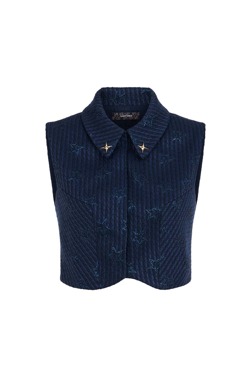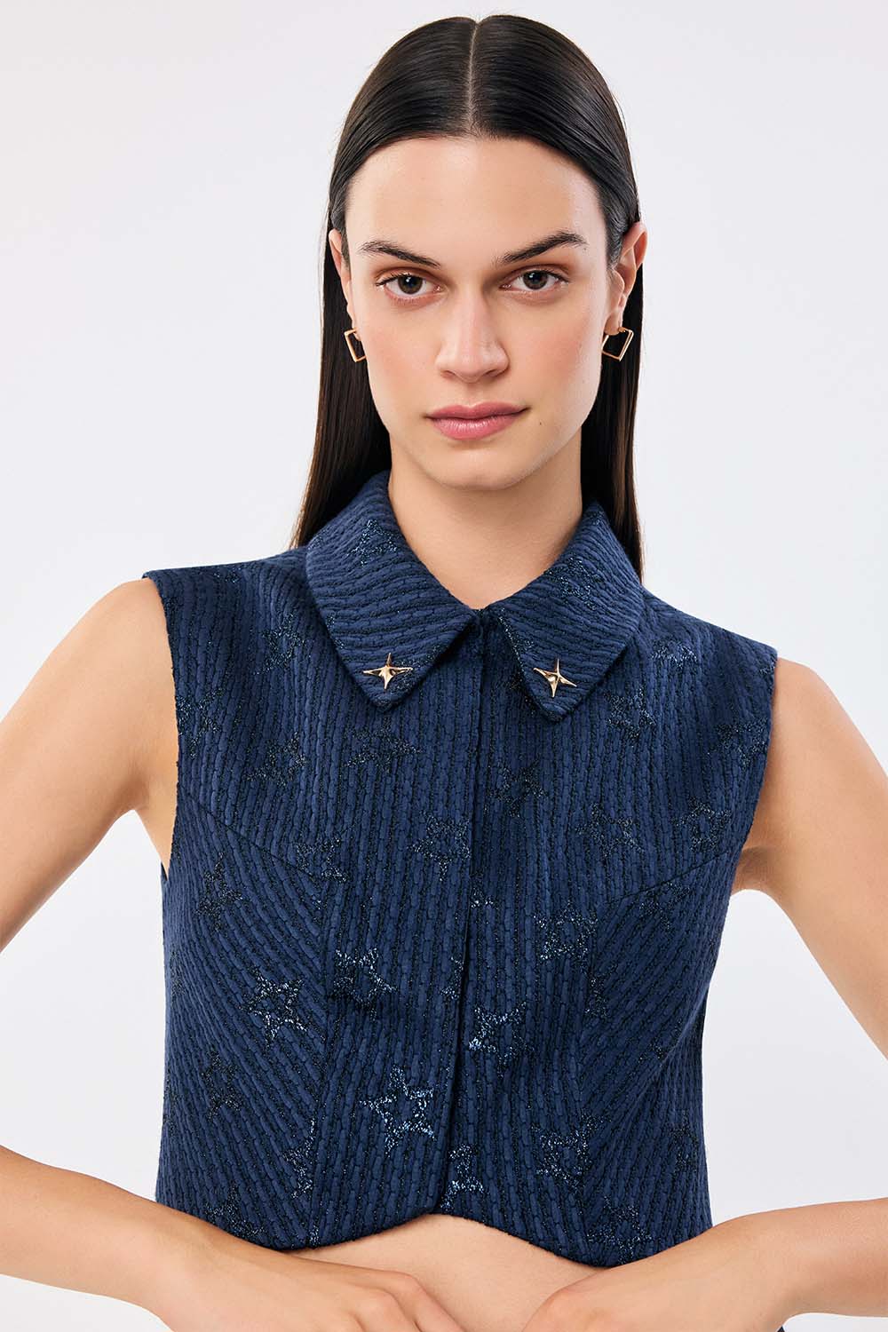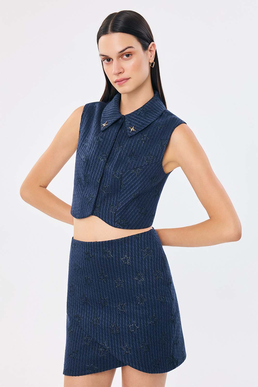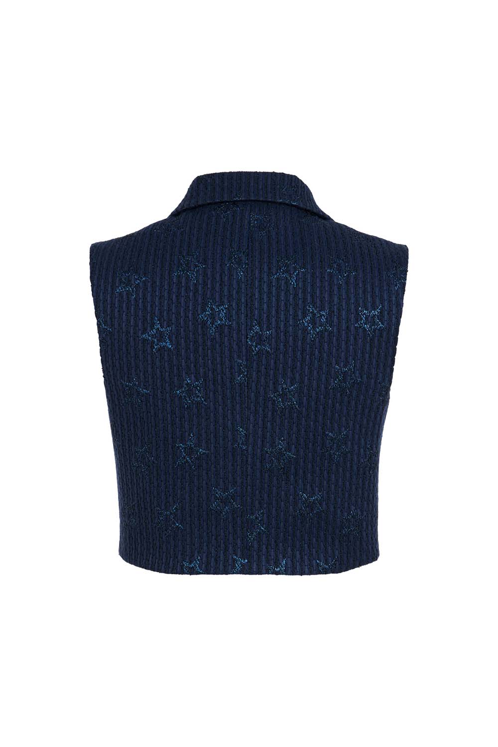 A refined nod to cosmic elegance, the Astra Top is crafted from a textured navy jacquard subtly woven with tonal stars. Its sculpted hem and sharp collar give it a polished silhouette, while the gold star embellishments at the collar tips add a signature celestial touch. Tailored yet playful, this piece captures quiet confidence with a hint of wonder.
