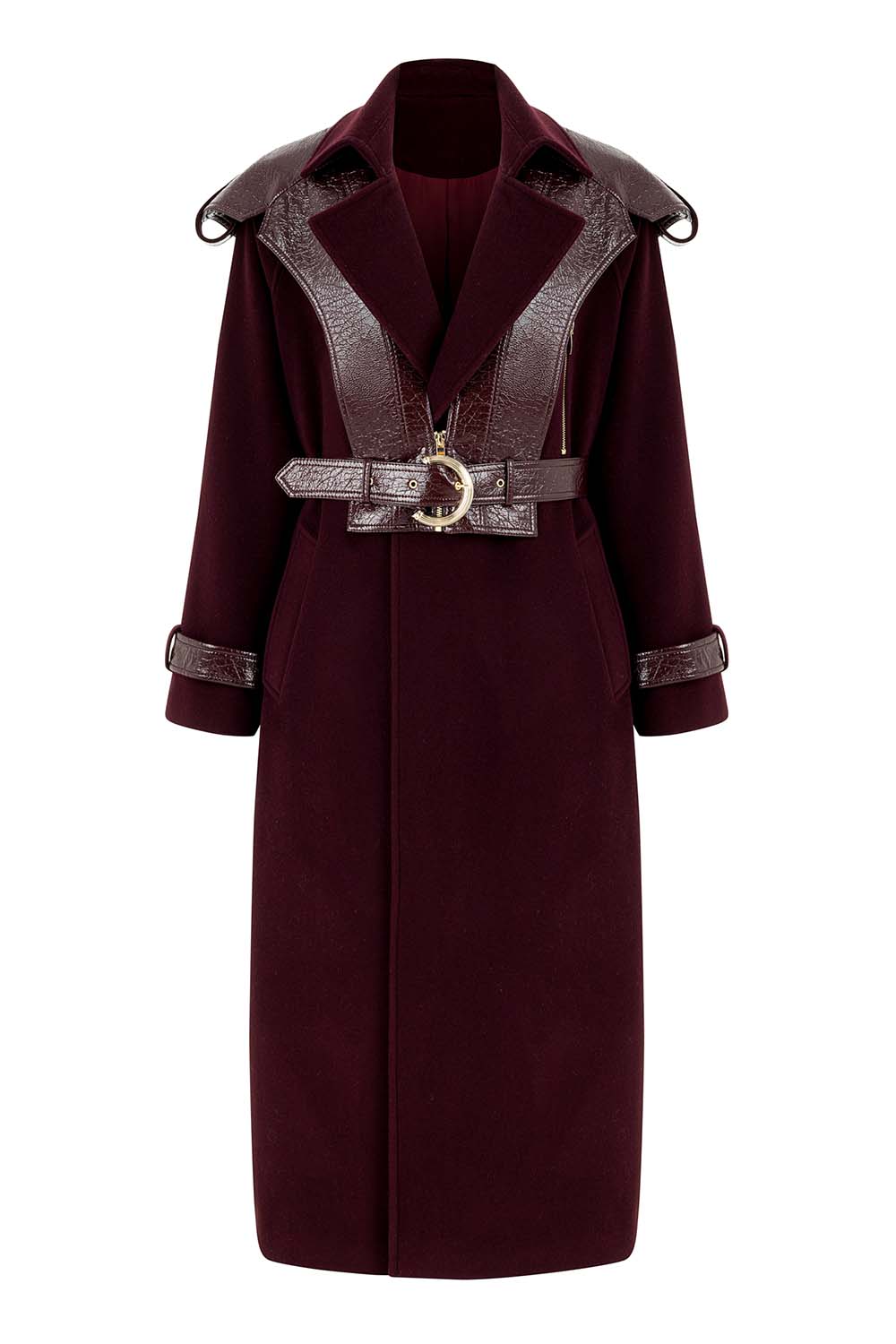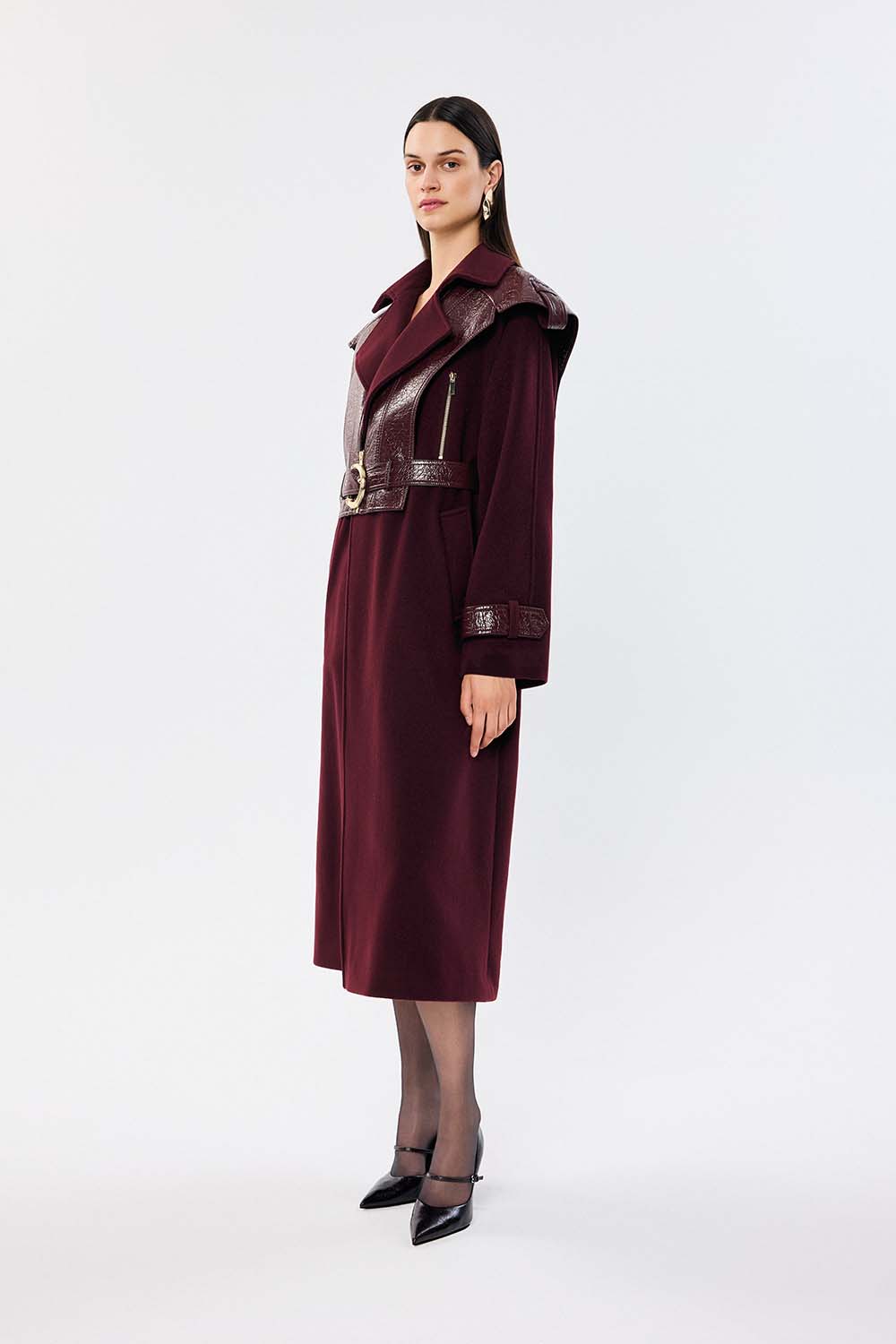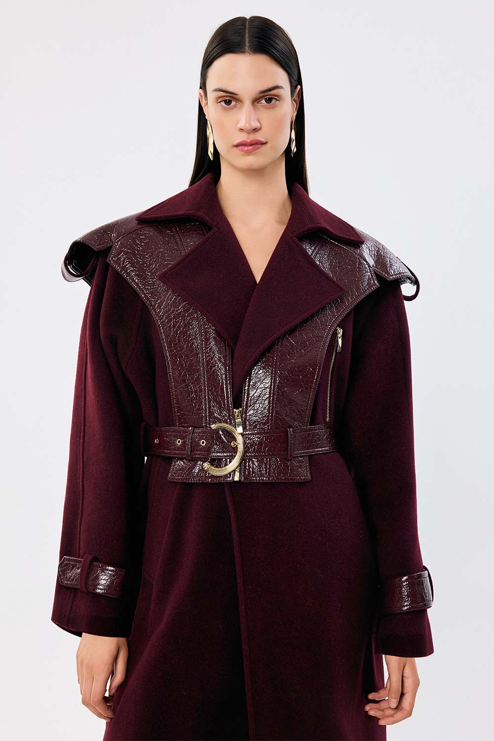 Strong and sophisticated, the Bhemis Coat reimagines classic outerwear with a modern, structured twist. The combination of rich wool and textured leather paneling, along with bold shoulder accents, creates an undeniably powerful silhouette. A cinched waist and gold-tone buckle detail elevate this piece to new levels of refinement.