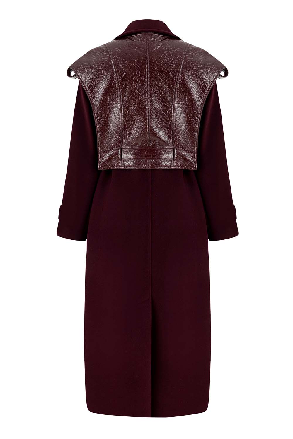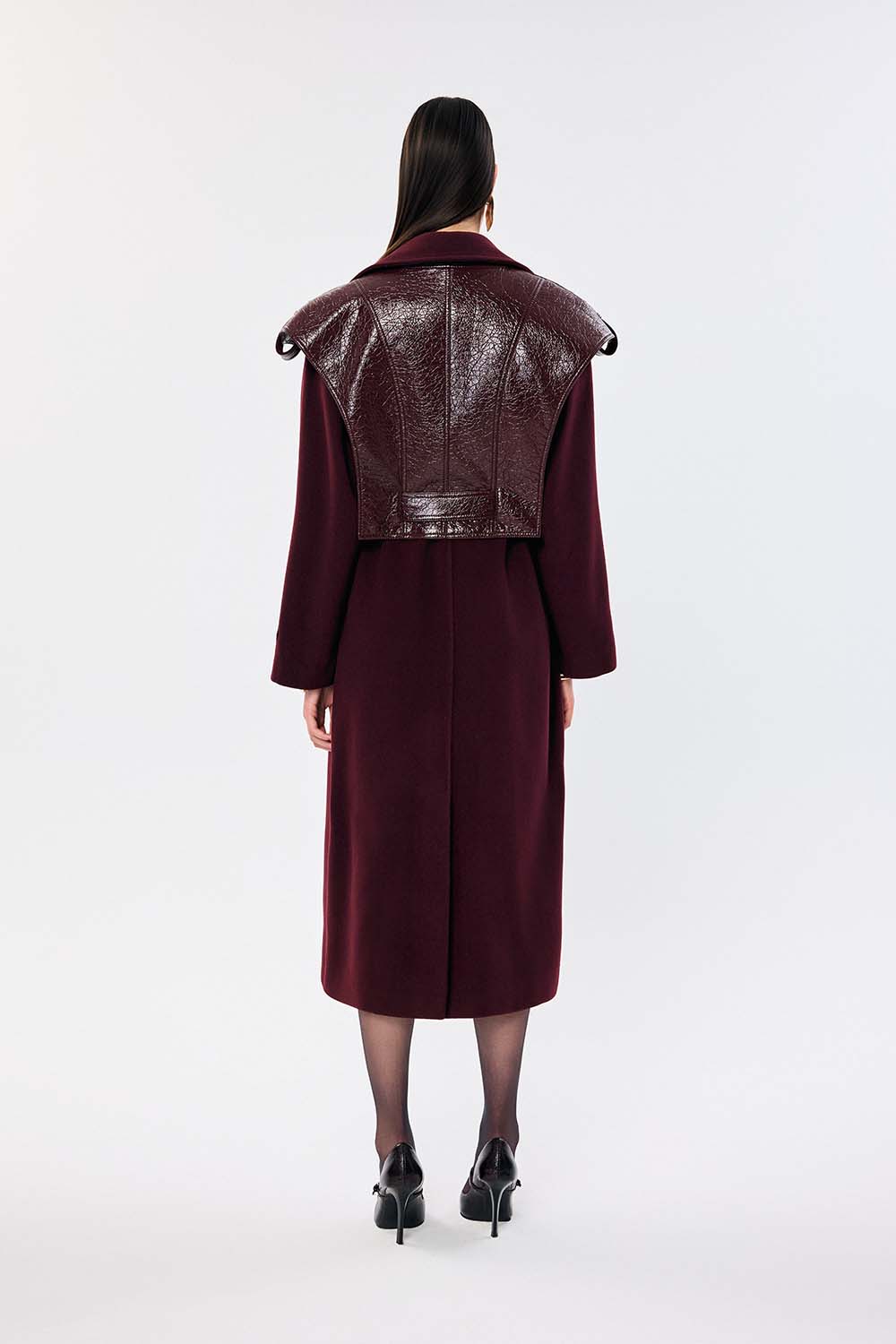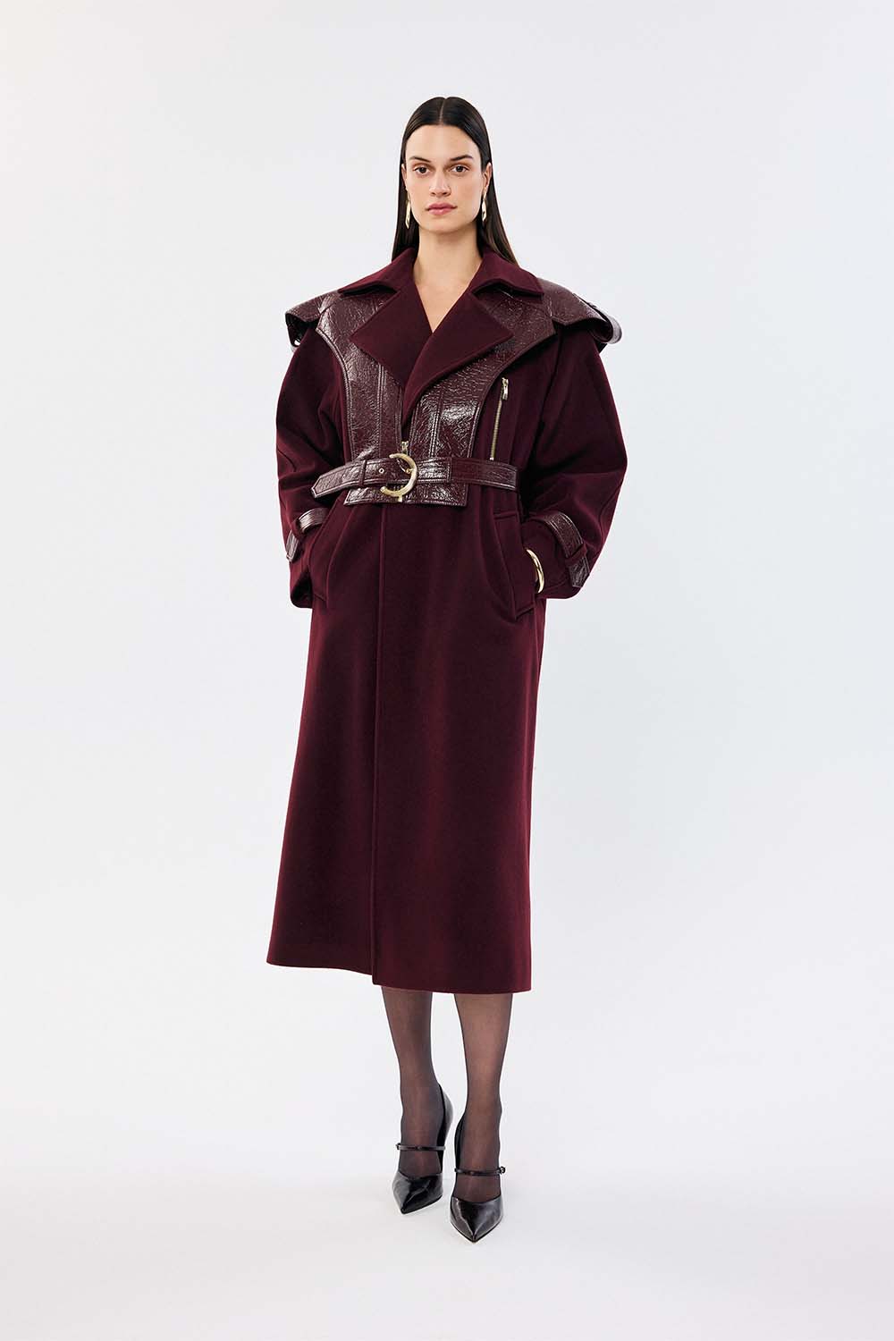 Strong and sophisticated, the Bhemis Coat reimagines classic outerwear with a modern, structured twist. The combination of rich wool and textured leather paneling, along with bold shoulder accents, creates an undeniably powerful silhouette. A cinched waist and gold-tone buckle detail elevate this piece to new levels of refinement.