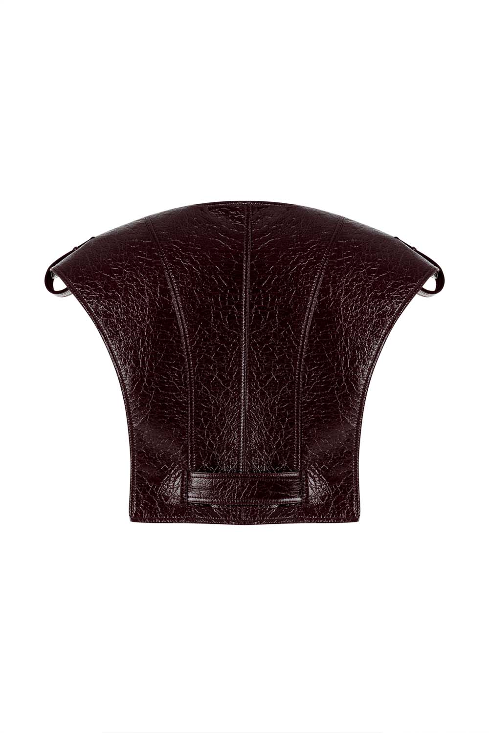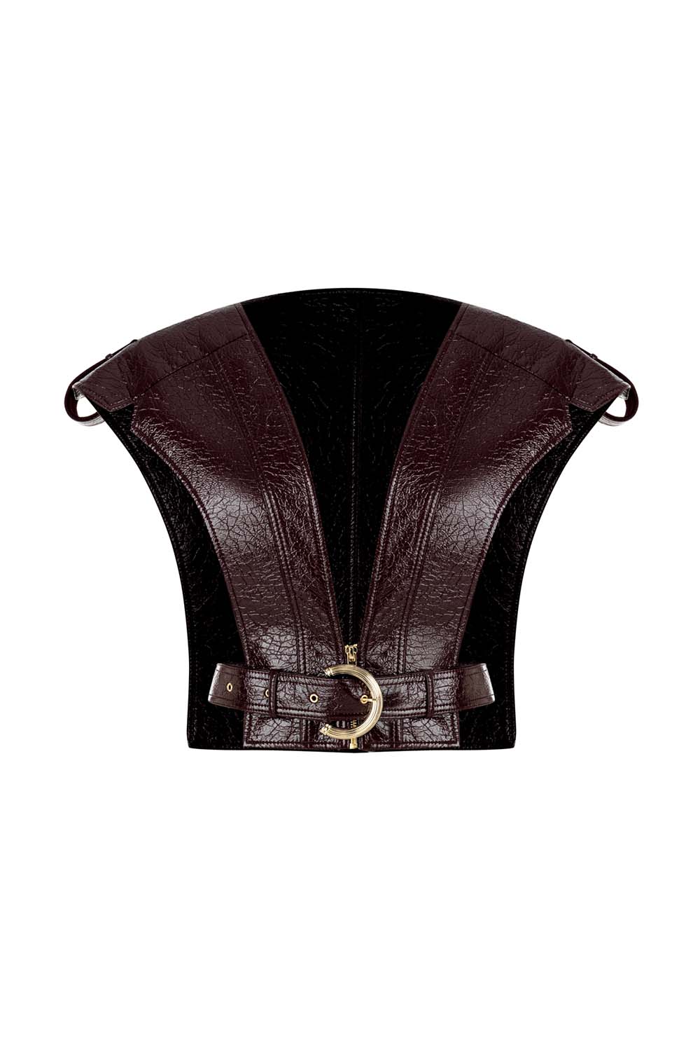 Bhemis Vest transforms layering into a statement of strength. Crafted from deep burgundy faux patent leather, its sculptural cut and sharp shoulder lines reshape the silhouette with architectural precision. A cinched waist and gold-tone buckle add definition, while the textured panels echo power and refinement.