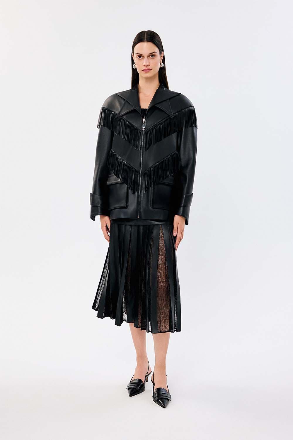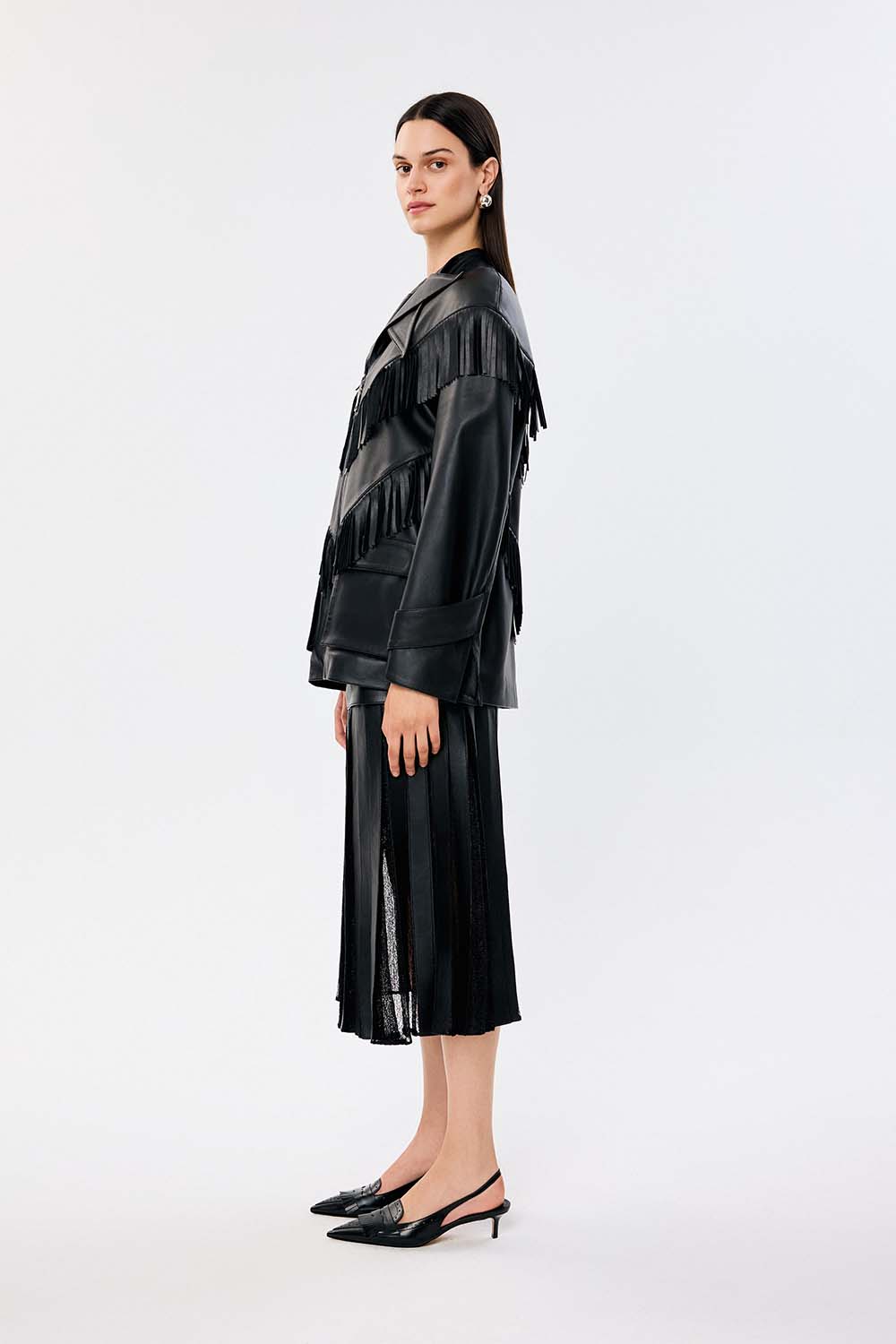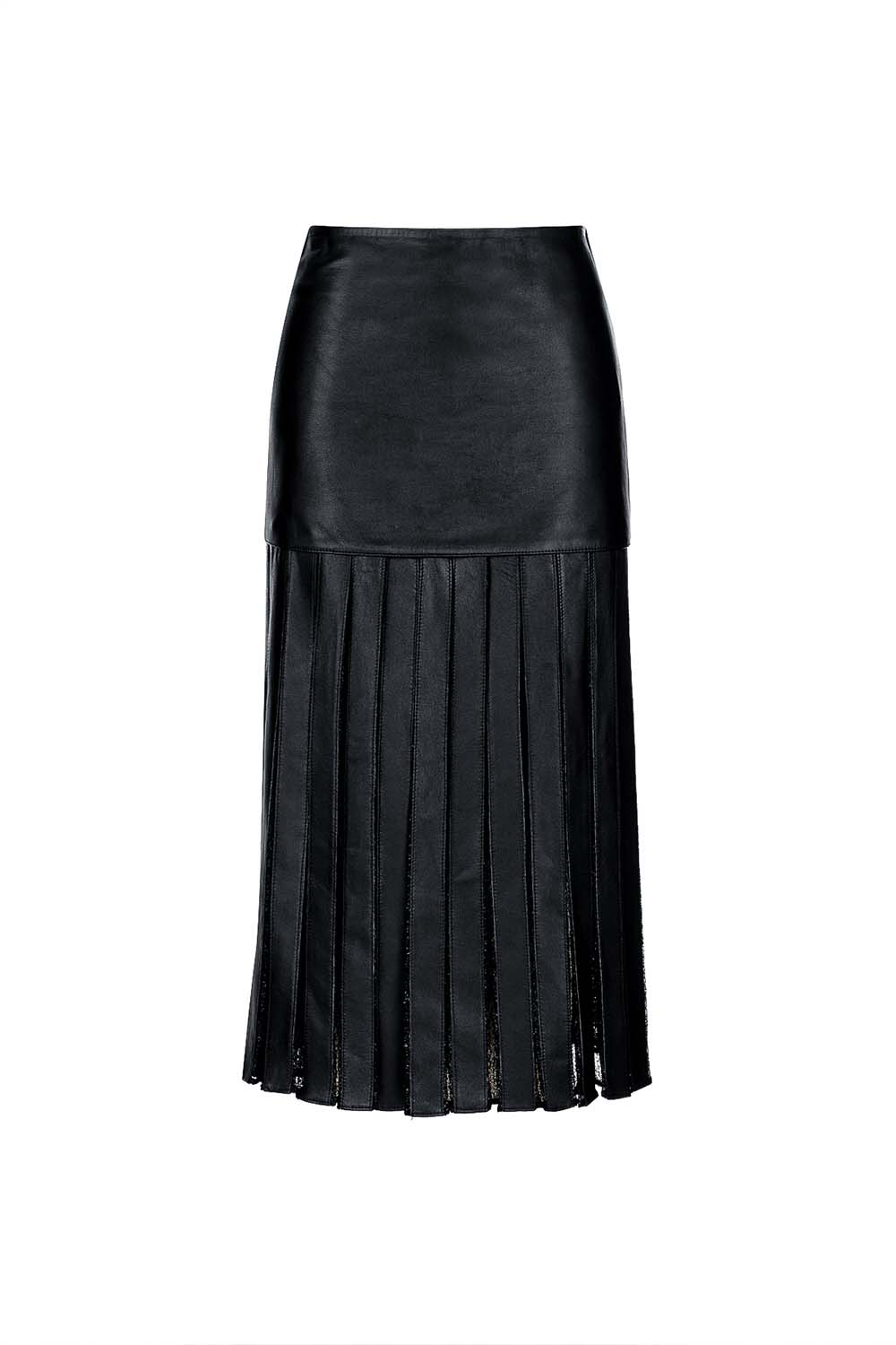 Dakota Skirt is a pleated midi skirt that redefines classic with an edge. The matte leather-look waistband contrasts beautifully against the sheer structured pleats that create a subtle movement and shadow play. Versatile and assertive, Dakota transitions from day to night with ease and elegance.