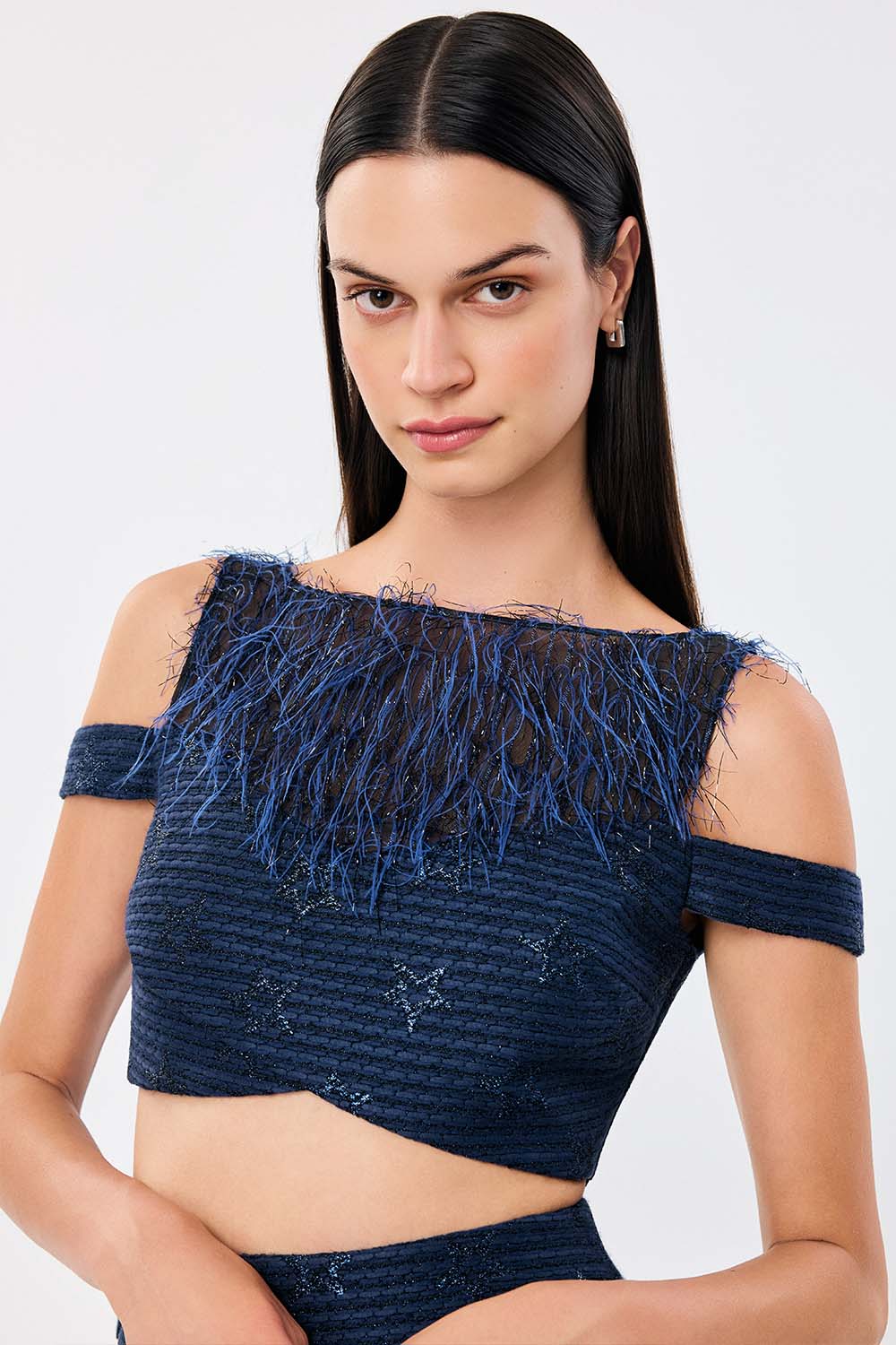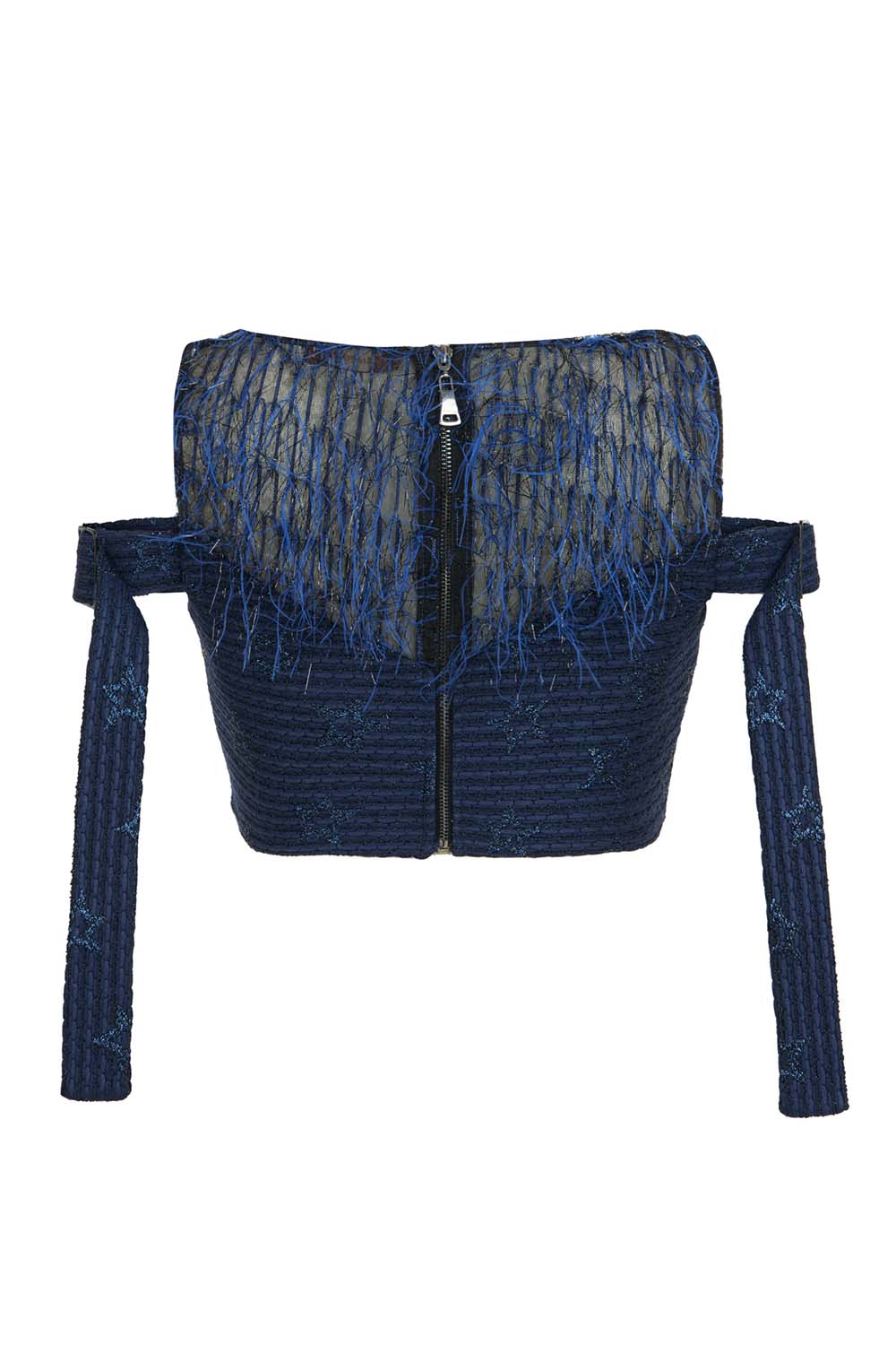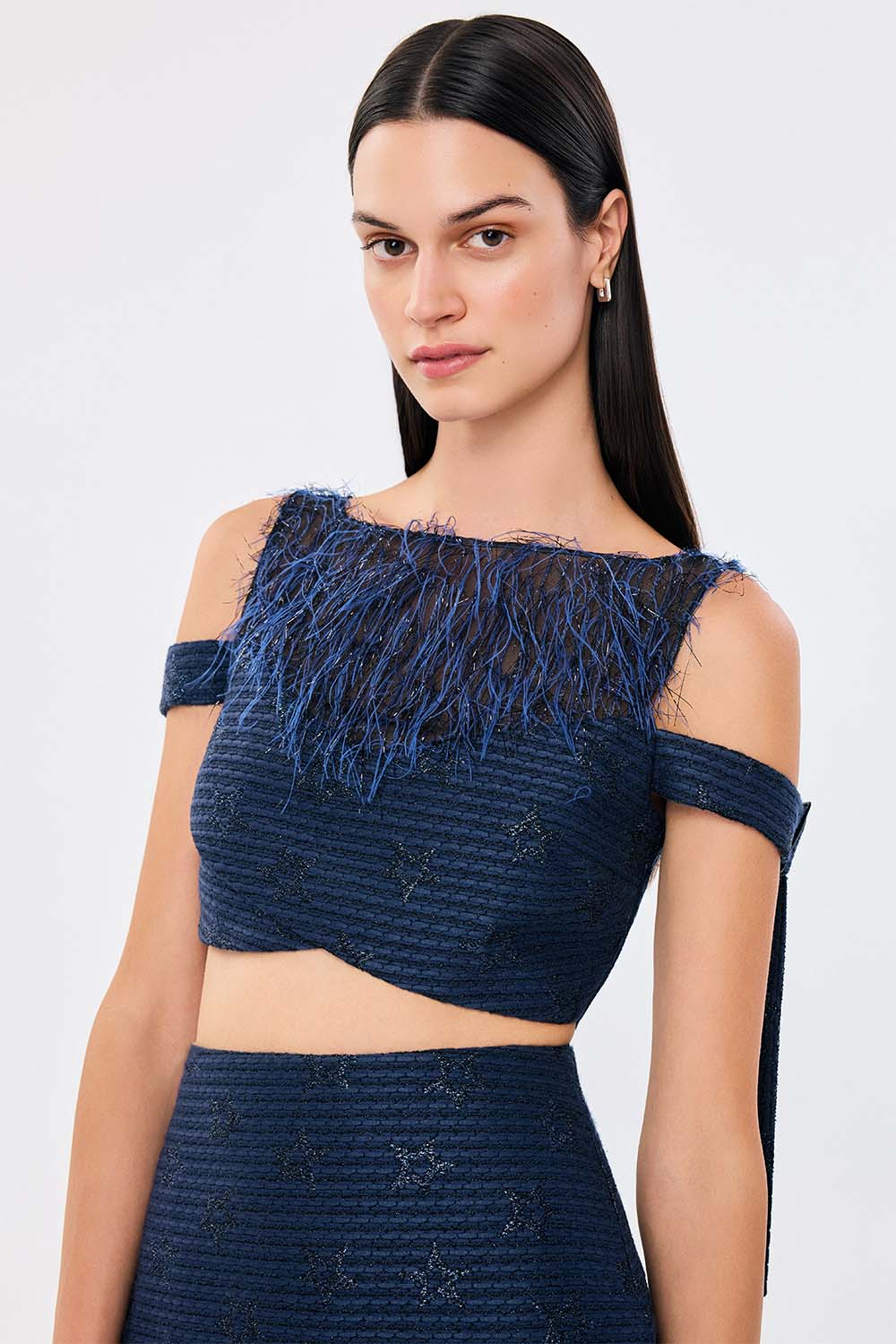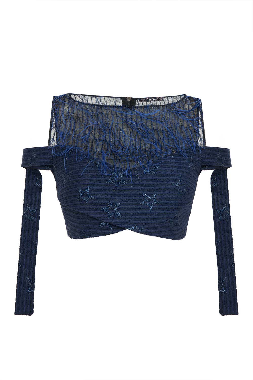 The Luma Top offers a cropped silhouette that fuses softness with structure. Its off-shoulder neckline is adorned with wispy fringing that contrasts the starry embroidery of the bodice. Long, straight sleeves and adjustable straps give a tailored yet experimental finish. Pair it with the matching skirt or clash it with denim for a touch of unexpected glam.