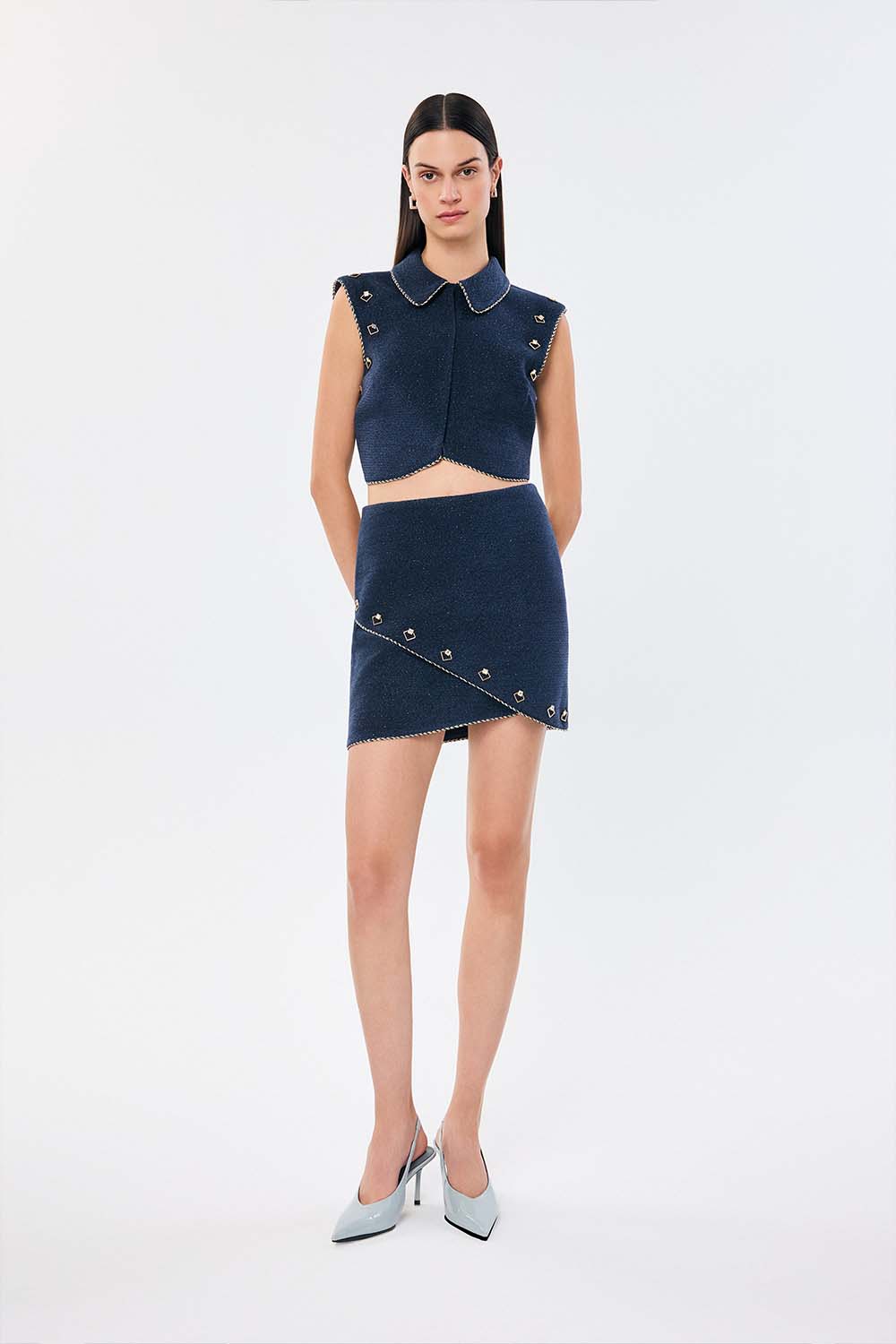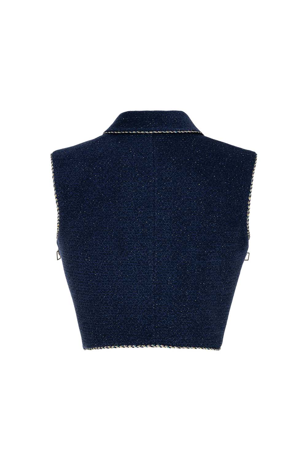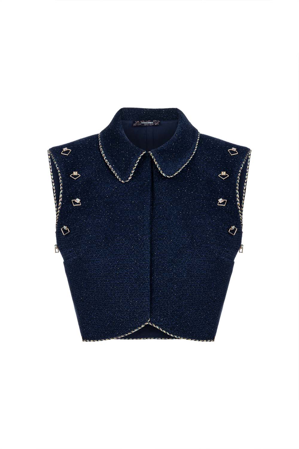 Refined and sophisticated, the Meissa Top features a cropped fit with intricate chain details along the edges. The deep blue fabric exudes a celestial charm, making it the perfect piece to layer or wear as a standout statement.