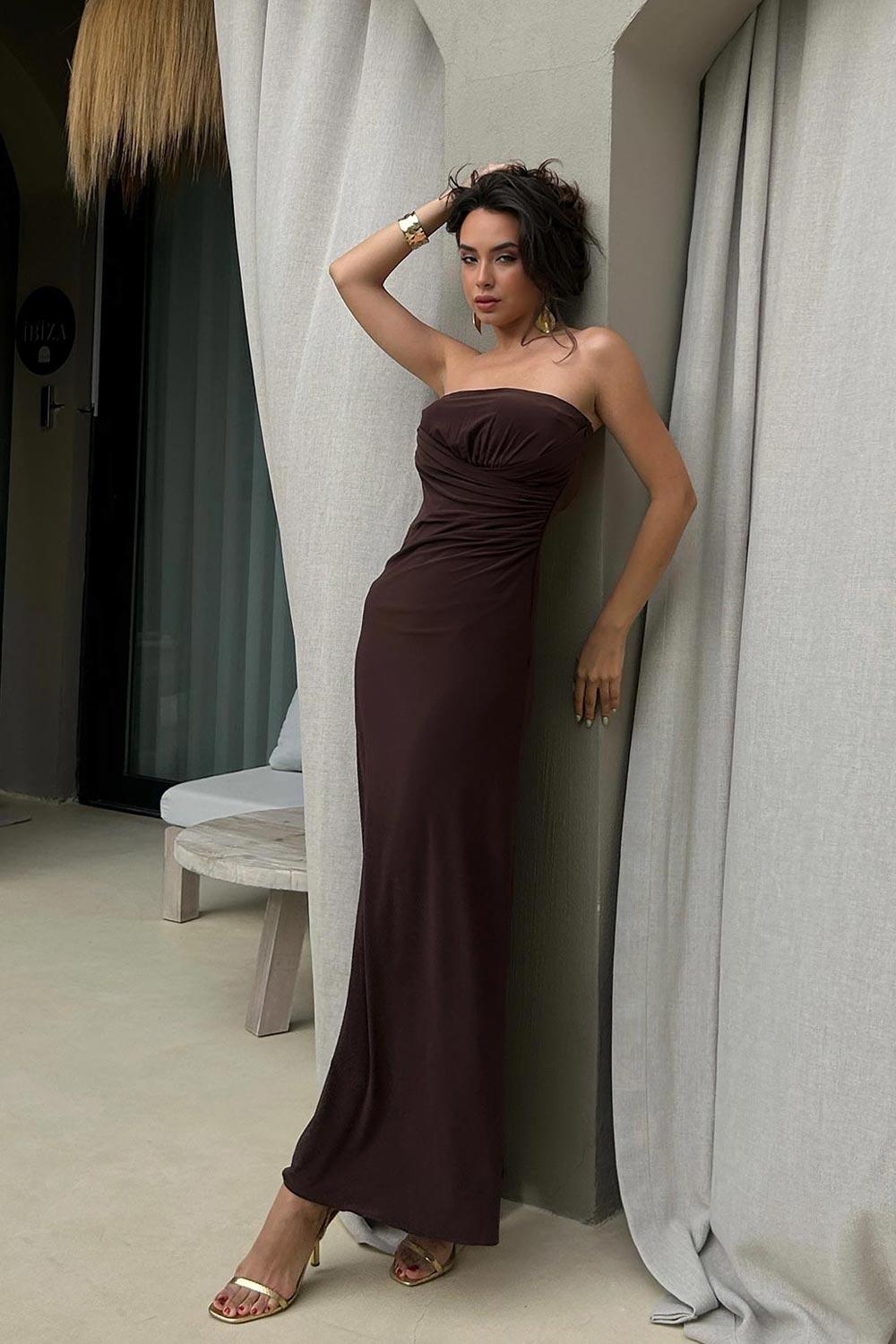 Straplez Yaka Jarse Maxi Elbise Kahverengi