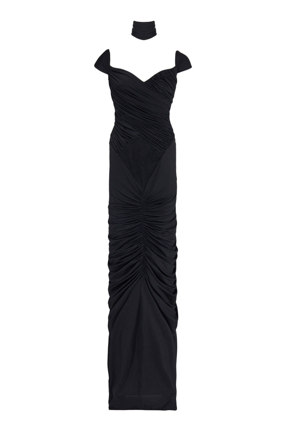 Siyah, dantel detaylı, drapeli uzun jarse elbise, çıkarılabilir boyun şalı.