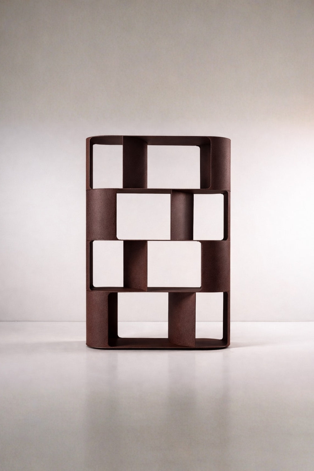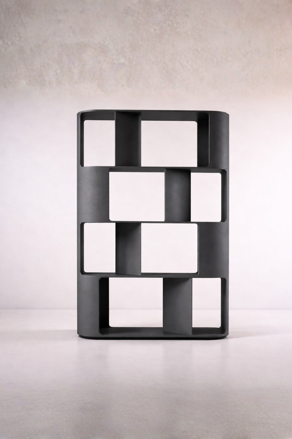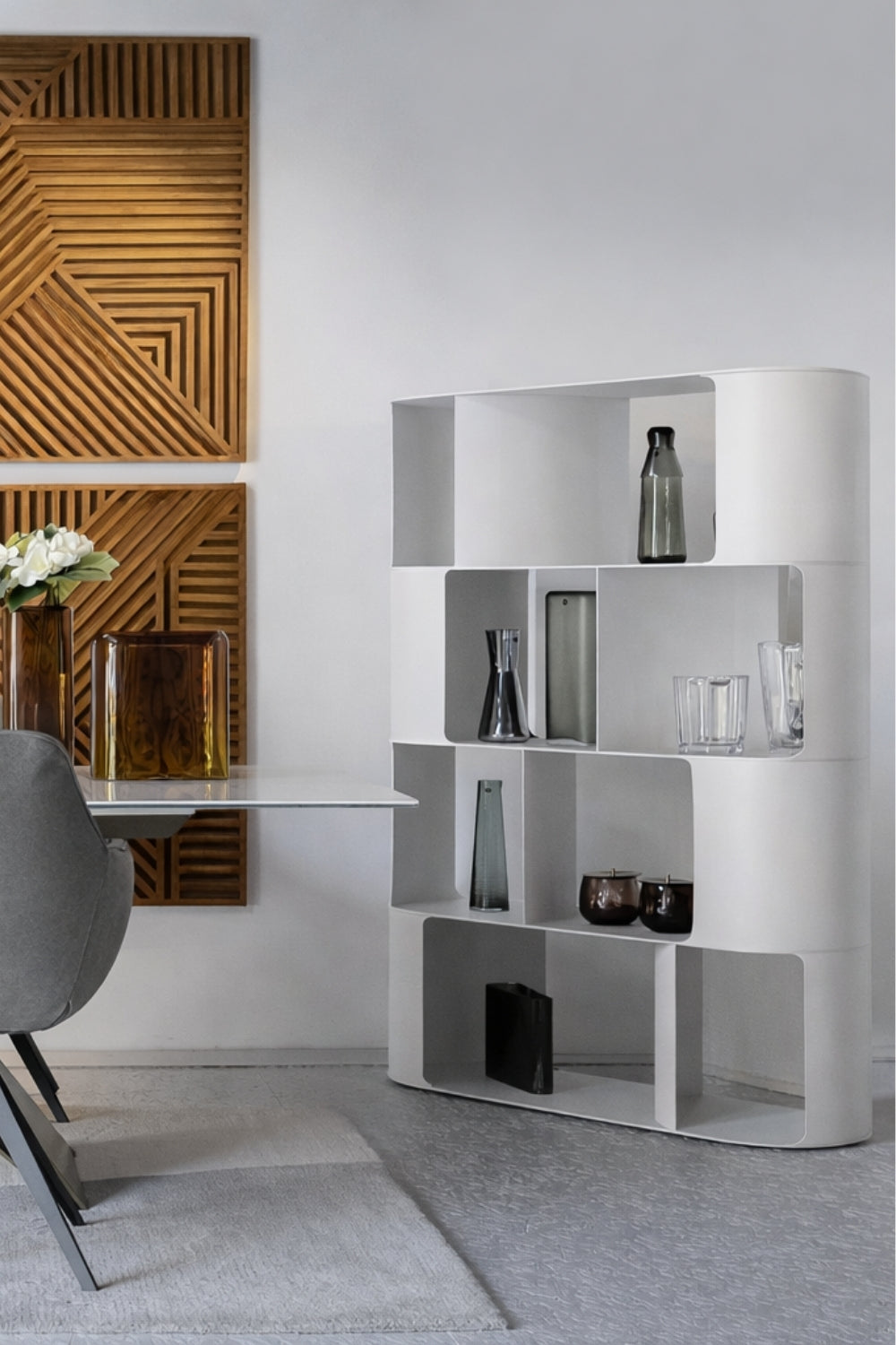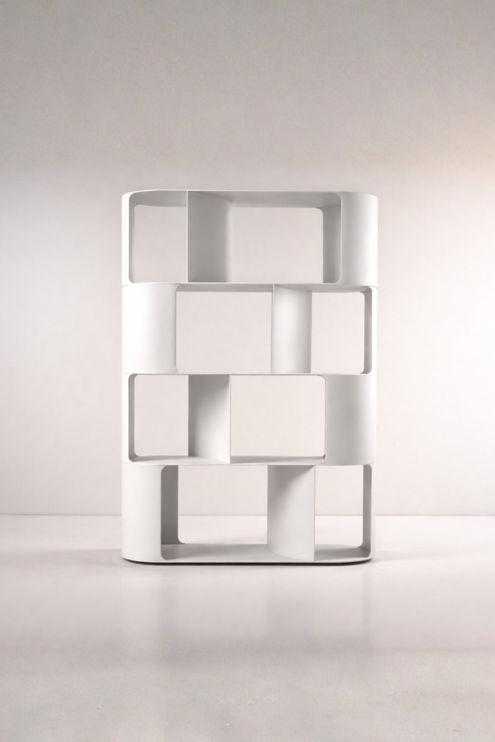 Round Raf, heykelsi formu ve akıcı hatlarıyla yaşam alanlarına zarif bir estetik kazandırır. Tek parça metal yapısıyla güçlü bir duruş sergiler ve hem kitaplık hem de dekoratif obje alanı olarak kullanılabilir.
