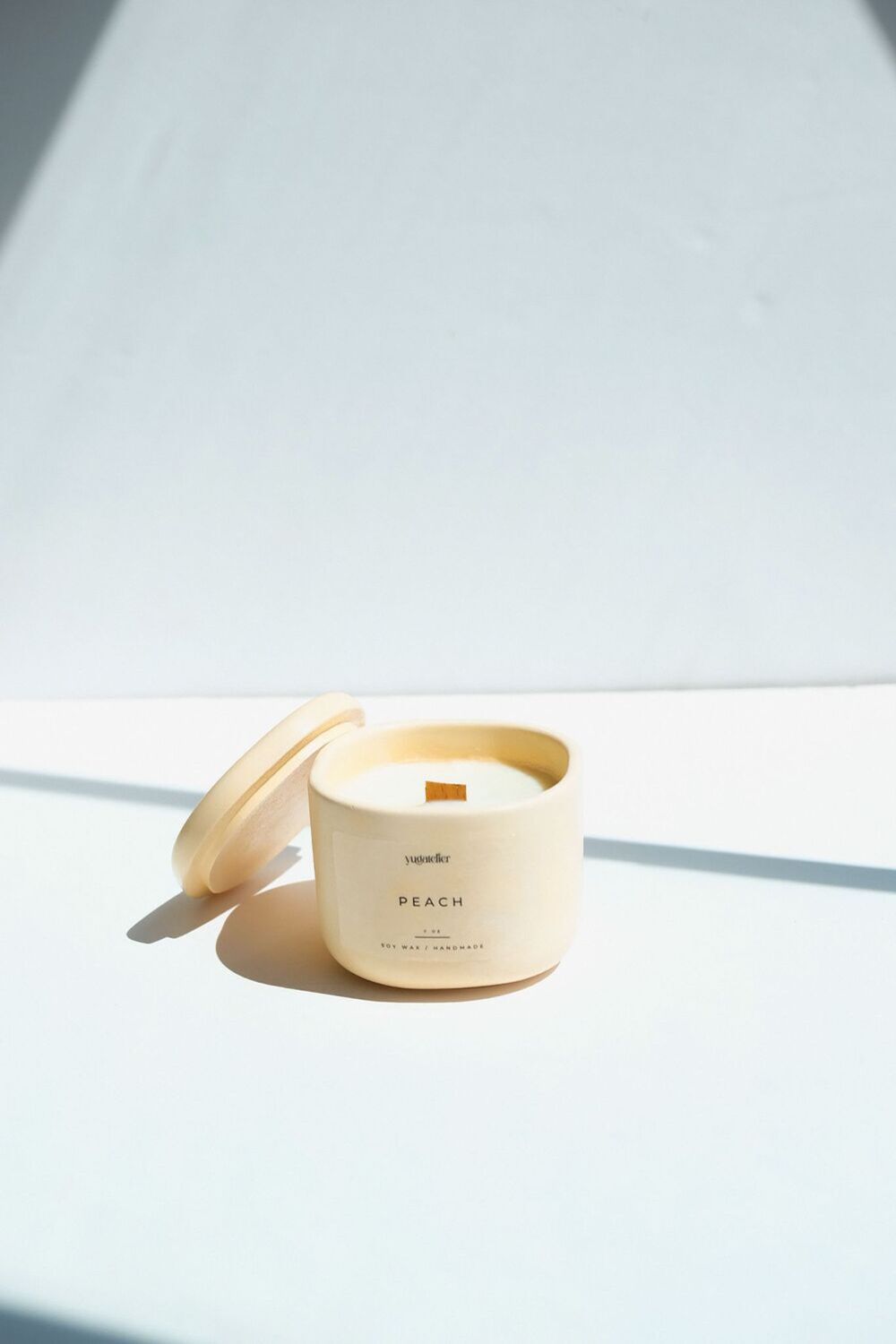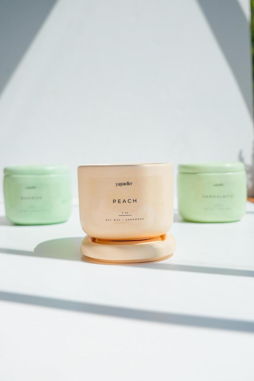 Şeftali kokusu tatlı ve meyveli bir tazelik ve hafif misk tonları taşır. Bu koku sıcak ve tatlı bir aroma sunar. Bu mum %100 soya mumundan ve elle döküm tekniği kullanılarak yapılmıştır. Fitil tercihi olarak ahşap fitil tercih edilmiştir. Mumlarımızda kullanılan kokular IFRA sertifikalı olup, toksik madde içermeyen kaliteli kokulardır. Mum kapları benzersiz ve özeldir. Dökümlü olduğundan her model kendine özgü bir desenle karşımıza çıkar.