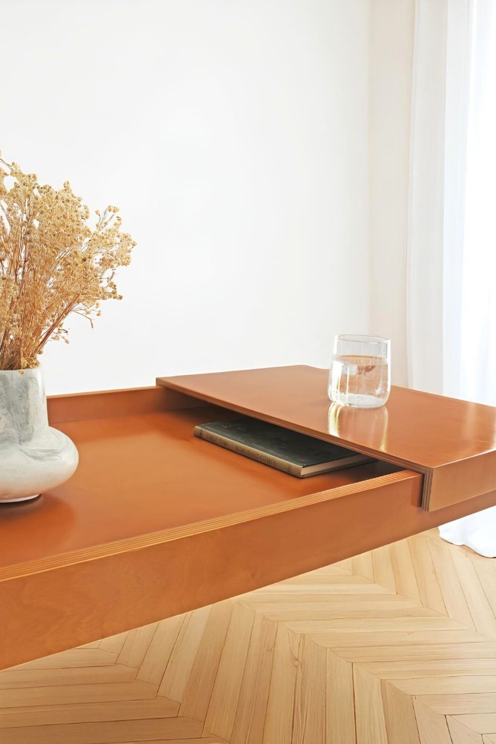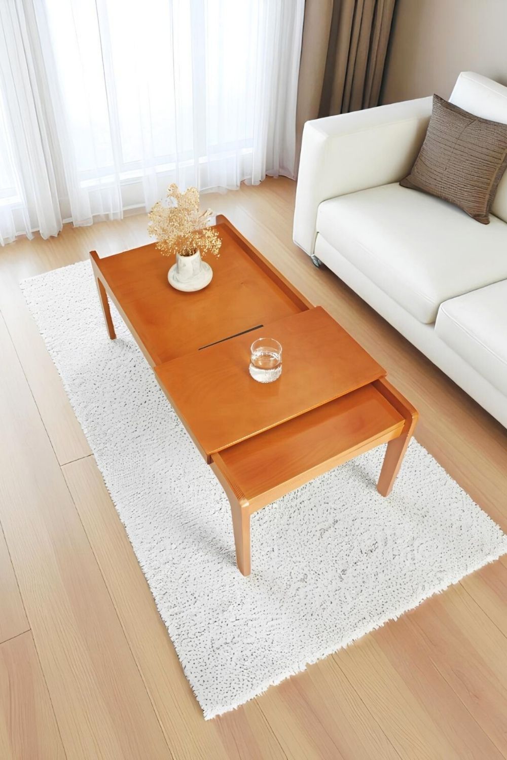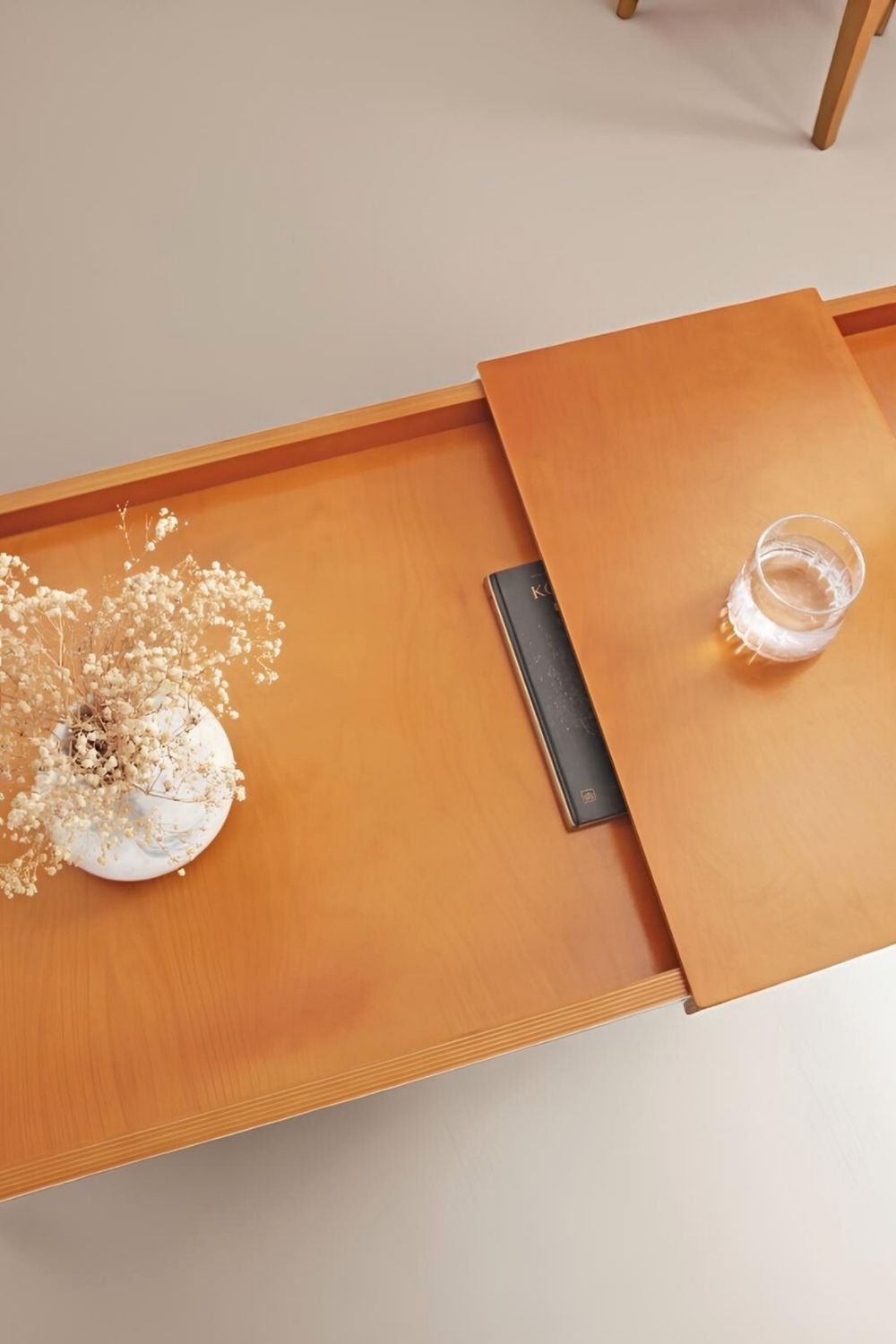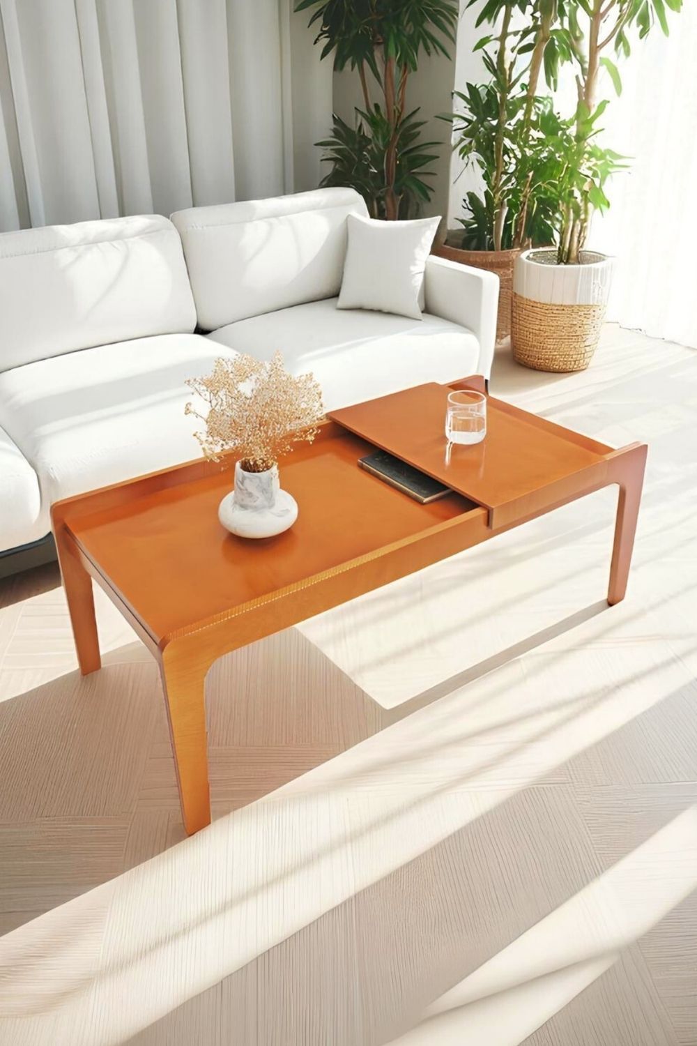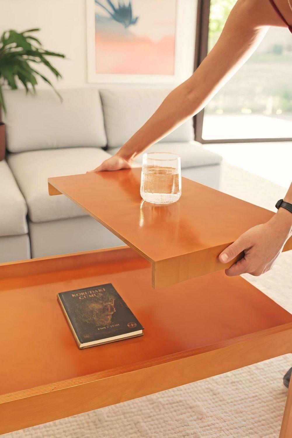 - Sehpanın en öne çıkan özelliği, kayar tepsi mekanizmasıdır. Bu hareketli üst yüzey, altında yer alan gizli bölmeye pratik bir erişim sağlar.