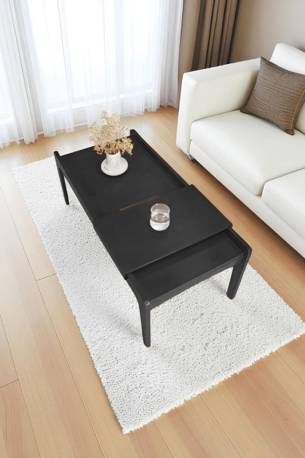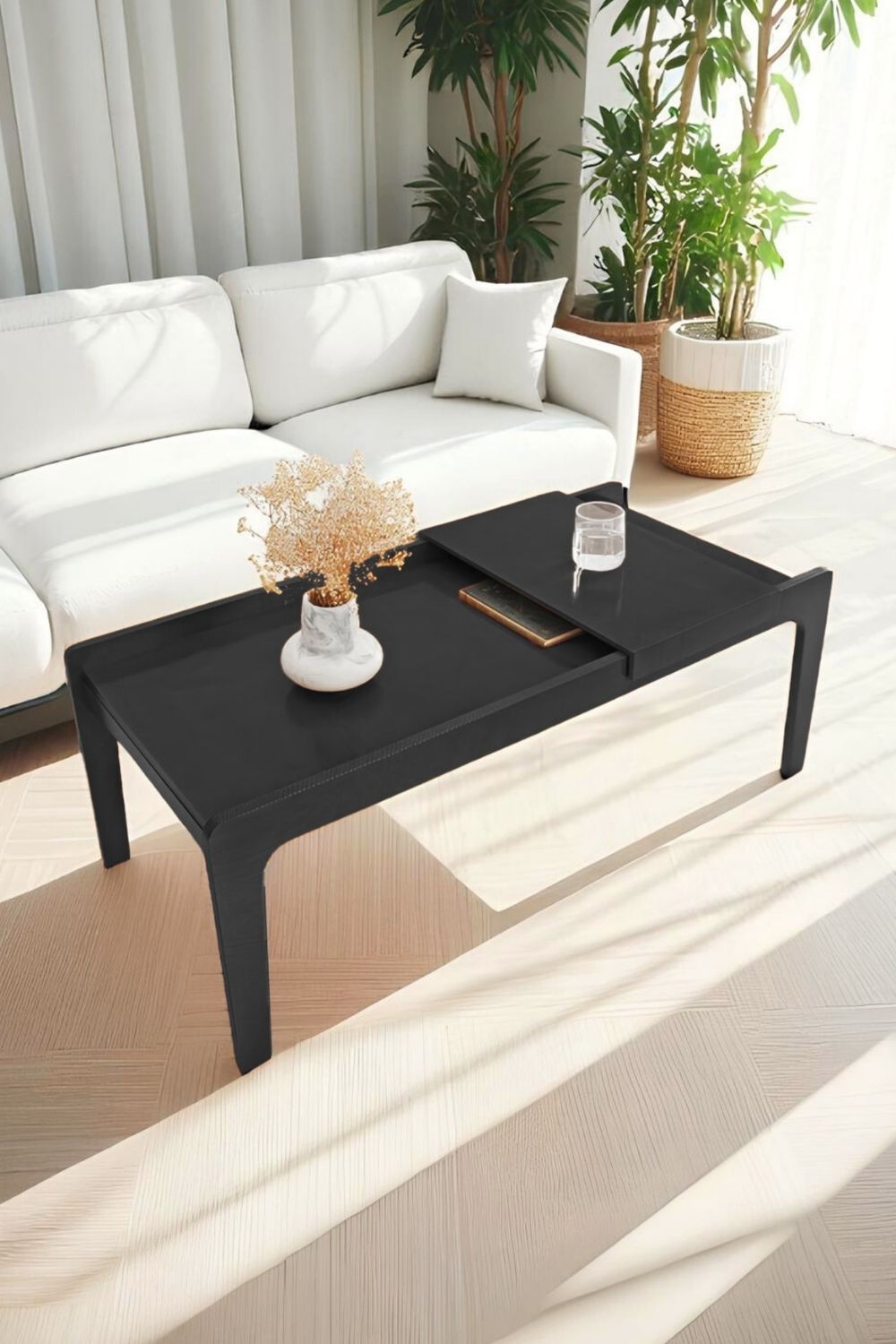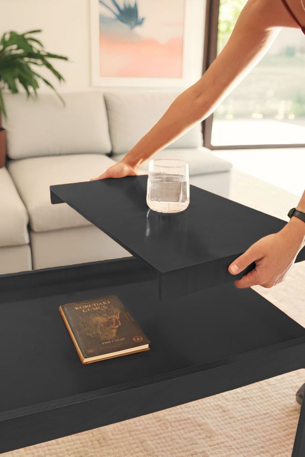 - Sehpanın en öne çıkan özelliği, kayar tepsi mekanizmasıdır. Bu hareketli üst yüzey, altında yer alan gizli bölmeye pratik bir erişim sağlar.
