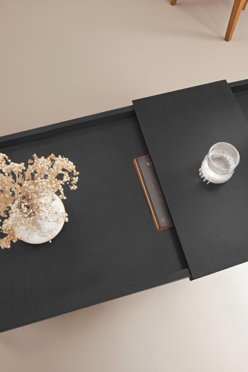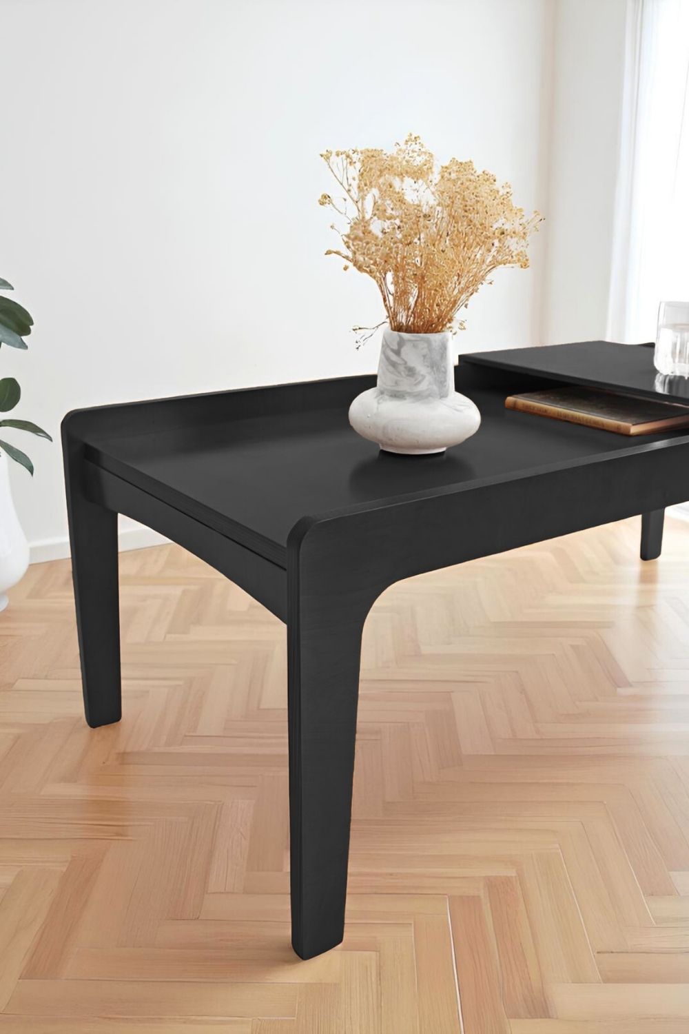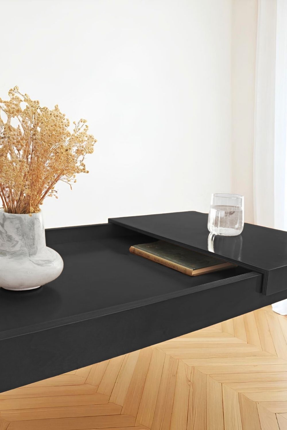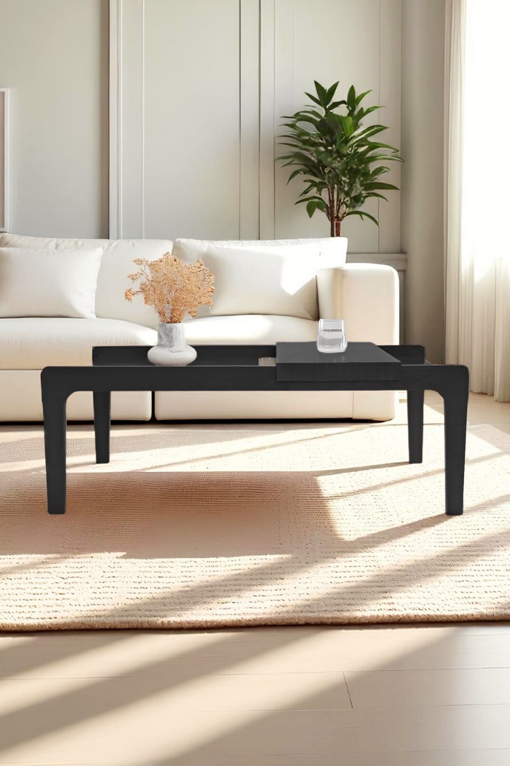 - Sehpanın en öne çıkan özelliği, kayar tepsi mekanizmasıdır. Bu hareketli üst yüzey, altında yer alan gizli bölmeye pratik bir erişim sağlar.