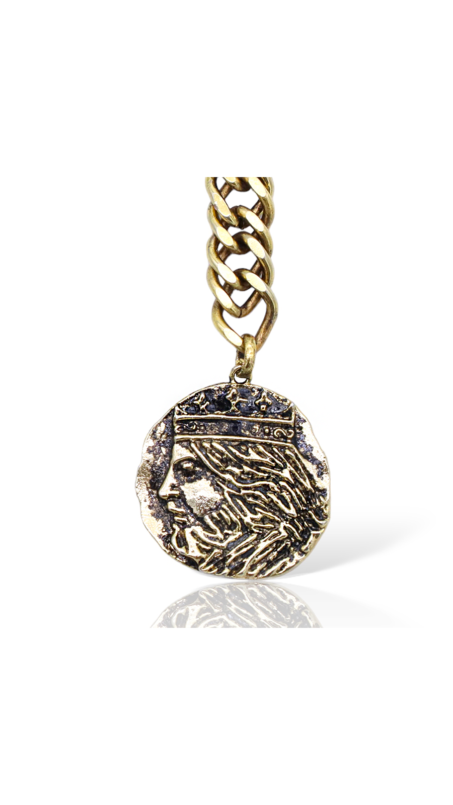 Bayemeyc'in Napoleon Madalyon Kolyesi, tarihin büyük hükümdarlarının ihtişamını ve kudretini çağrıştıran, olağanüstü bir tasarımdır. 22 ayar altın kaplama pirinç zincir, bu zarif kolyenin dayanıklı ve gösterişli temelini oluştururken, kolyenin bir ucu mükemmel bir halka şeklinde tasarlanmıştır. Napoleon Madalyon Kolye'nin diğer ucu, halkanın içinden geçerek, bir asalet sembolü olan para sembolüne uzanır. Bu para sembolü üzerinde yer alan kral figürü, hem zenginliğin hem de gücün simgesidir ve altın kaplamanın antika görünümüyle tarihi bir dokunuş kazanır.