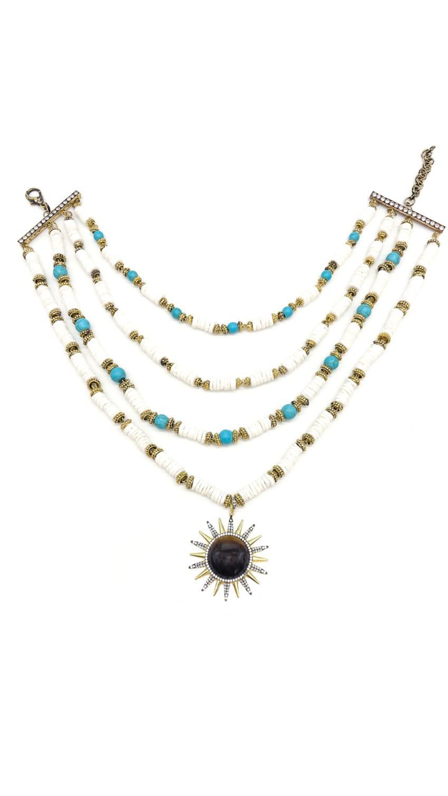 Üretim Şekli : El YapımıMateryal : Pirinç üzeri 22 ayar altın kaplama, 6 mm turkuaz mercan taş, 8 mm turkuaz mercan taş, kaplan gözü taşı, sedef taşUzunluk : 35 cm + 5 cm uzatma zincir