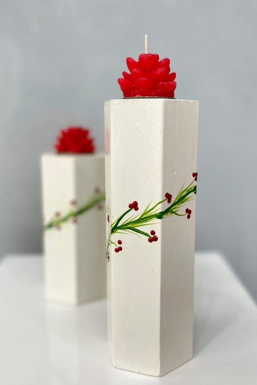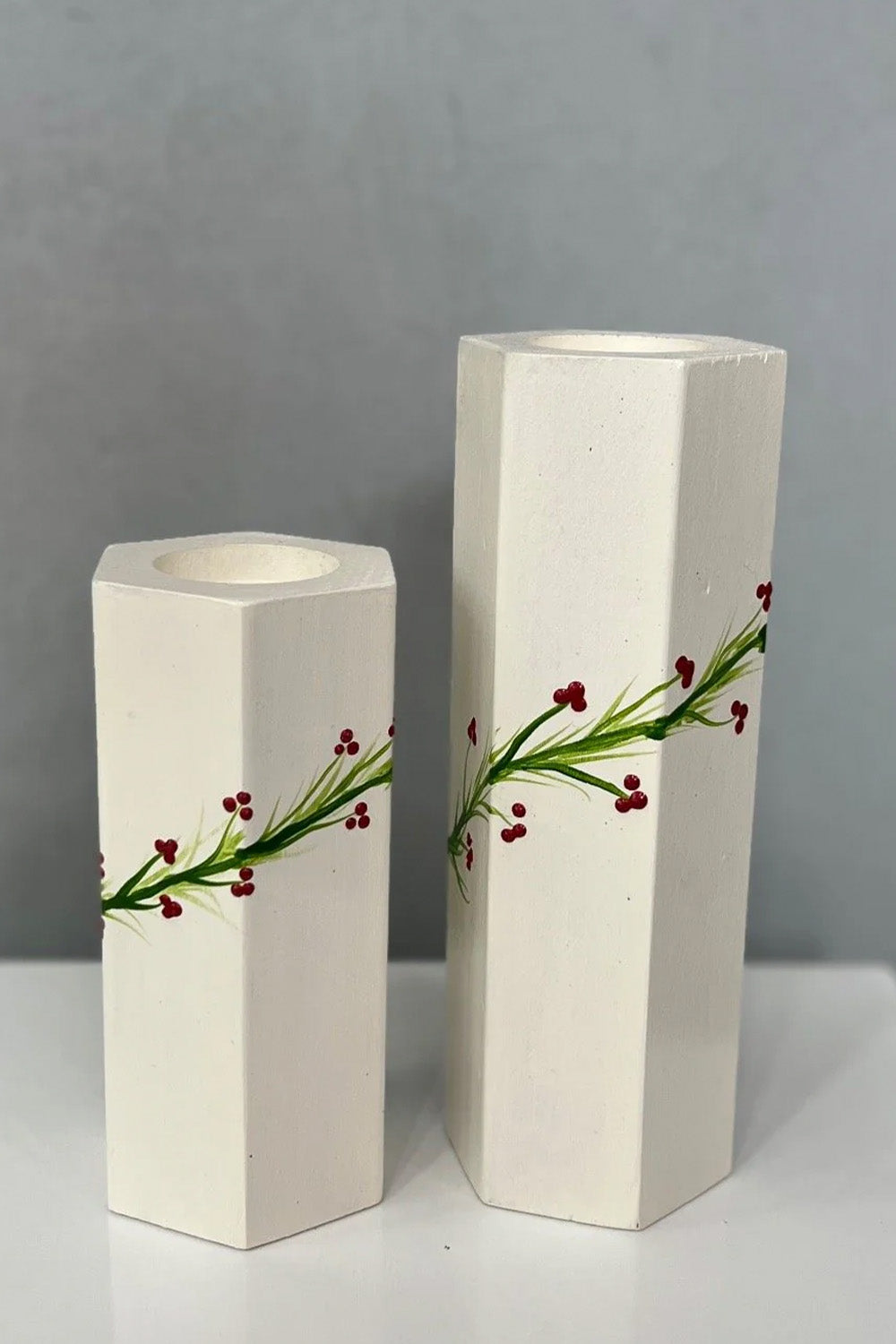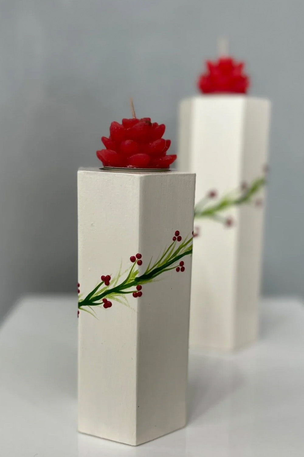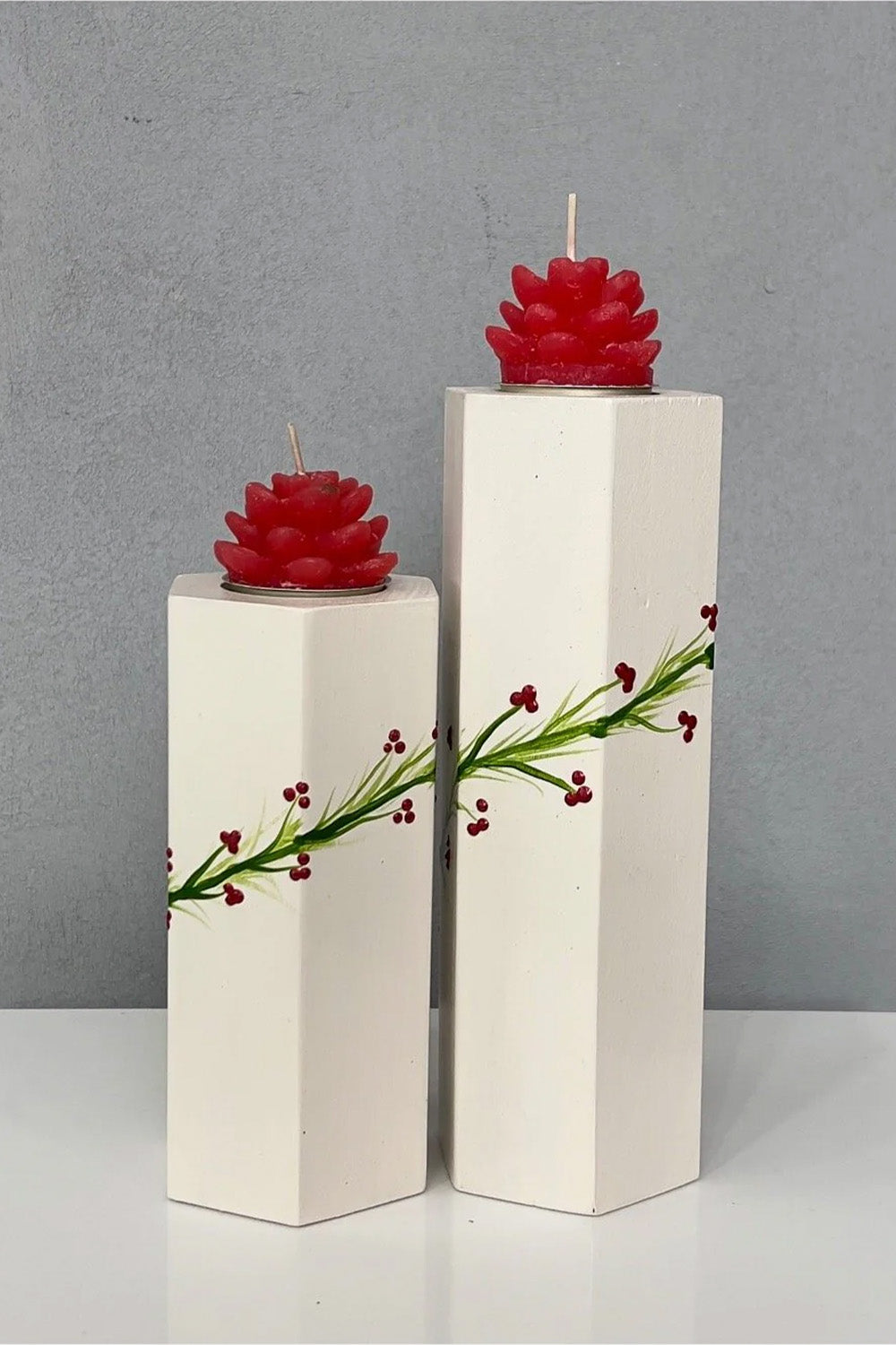 Ev dekorasyonunuzu şık ve doğal bir dokunuşla taçlandırmak için ideal olan bu özel ikili masif ahşap mumluklar, tasarımcı Derya Kurdoğlu'nun elinden çıkmadır. Her biri özenle tek tek el boyaması yapılan bu mumluklar, krem rengi zemin üzerinde ince detaylı yeşil dallar ve kırmızı kabartma çiçeklerle süslenmiştir. Doğanın ilham verici güzelliklerini yansıtan bu motifler, evinizin atmosferine sıcaklık ve huzur katacak.