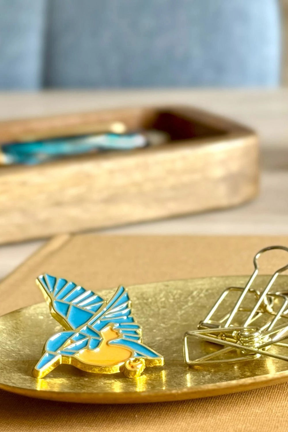 Esterbrook x BUNGUBOX Kingfisher Rozet, yalıçapkını kuşunun canlı renklerinden ilham alan zarif bir tasarımdır. Minimal görünümüyle hem modern hem de sofistike bir tarz sunan bu özel rozet, ceketten çantaya kadar pek çok yüzeye kolayca takılabilir.