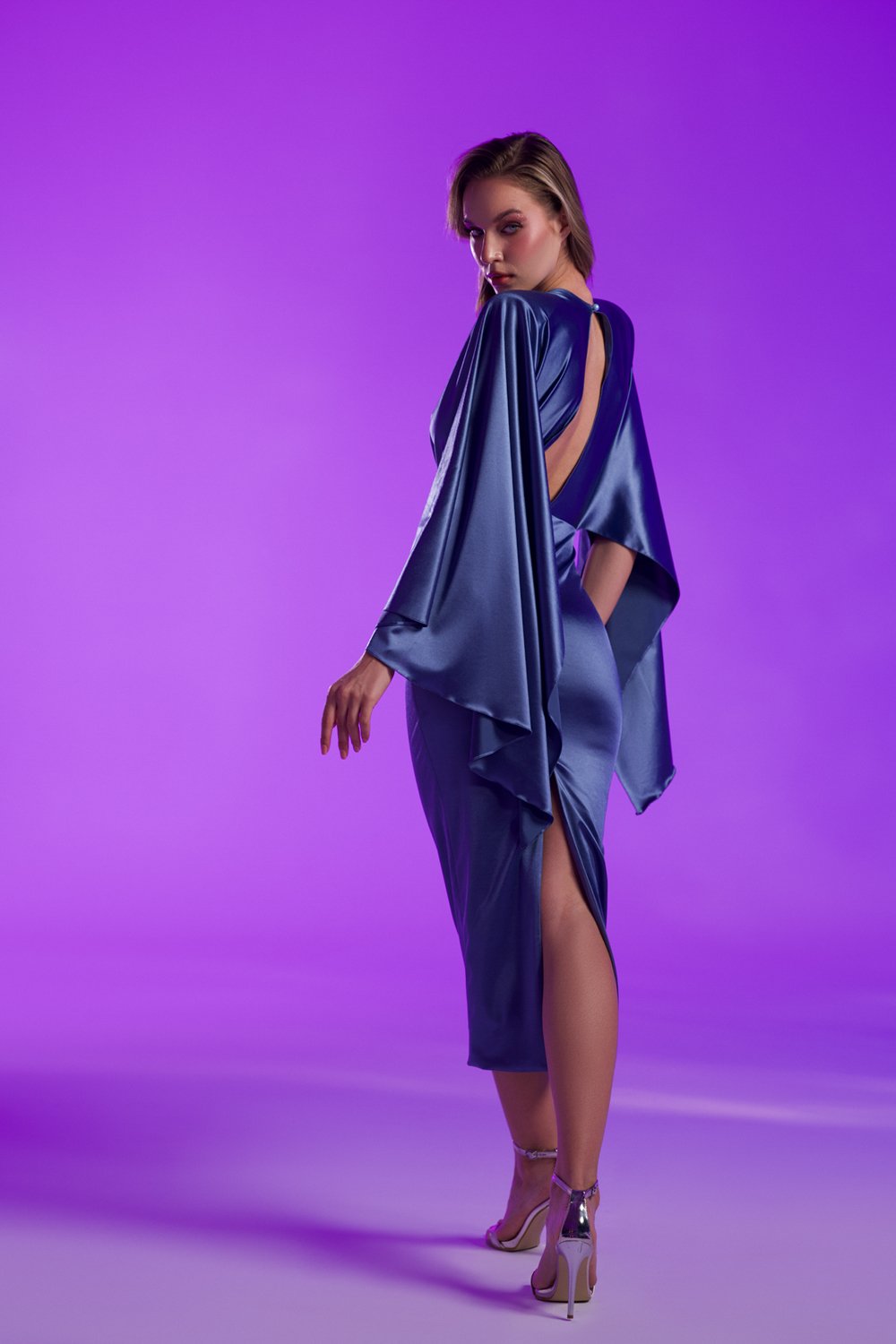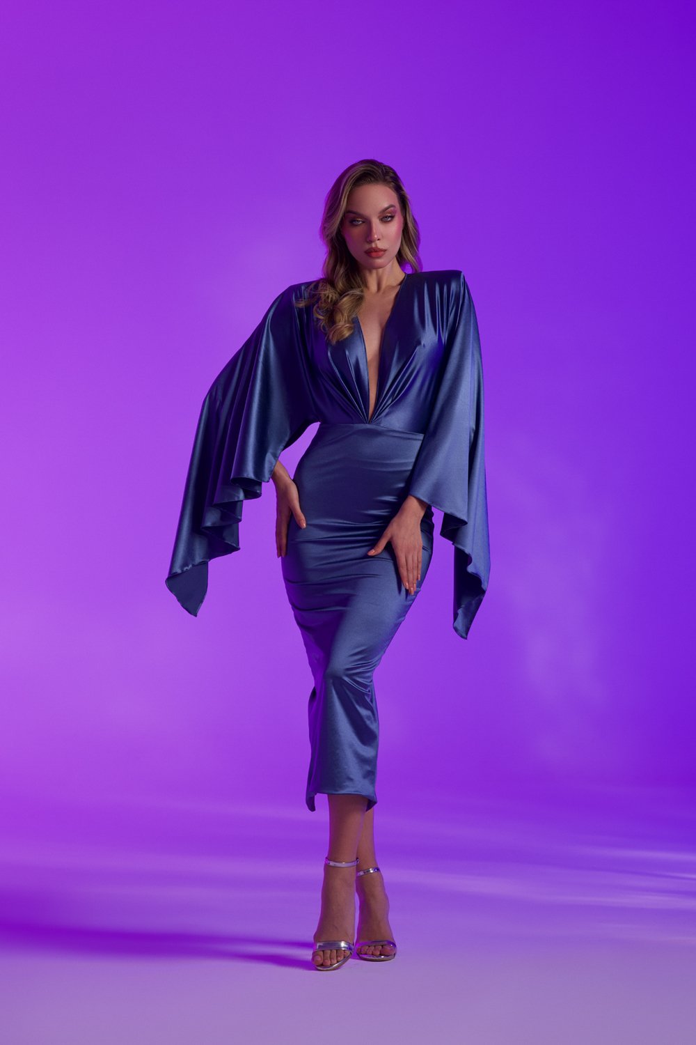 Koyu Mavi Saten Geniş Kollu Midi Elbise