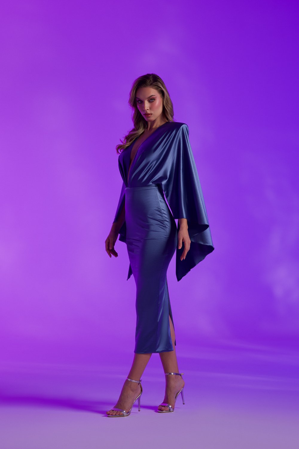 Geniş kol tasarımı ve midi boy kesimi ile zarif ve akıcı bir siluet sunar.
