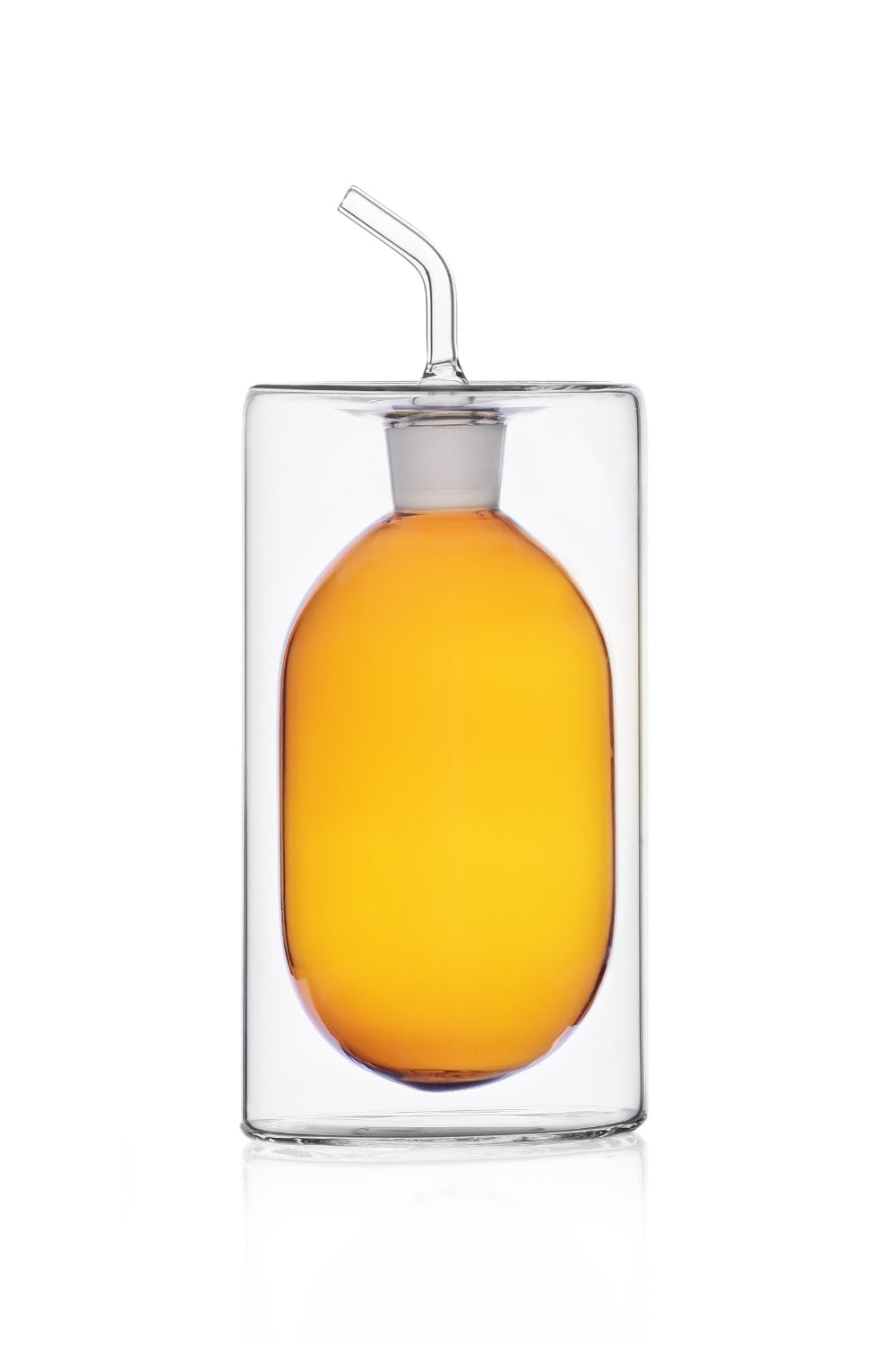 Cilindro Koleksiyonu’na ait bu amber renkli yağdanlık, iç içe geçmiş çift cam katmanıyla hem görsel derinlik hem de işlevsellik sunuyor. Dış yüzeyin şeffaflığı ile içteki amber tonun yarattığı zarif kontrast, sofralara sofistike bir karakter kazandırıyor. İnce eğimli boru formundaki ağız kısmı, sıvıyı dengeli ve damlatmadan servis etmeye olanak tanırken, borosilikat cam malzeme sayesinde yüksek ısı dayanımı ve uzun ömürlü kullanım sağlanıyor. Zeytinyağı, aromatik yağlar veya özel karışımlar için tasarlanan bu yağdanlık, sunumlarınıza modern bir dokunuş katmak isteyenler için ideal bir tercihtir.
