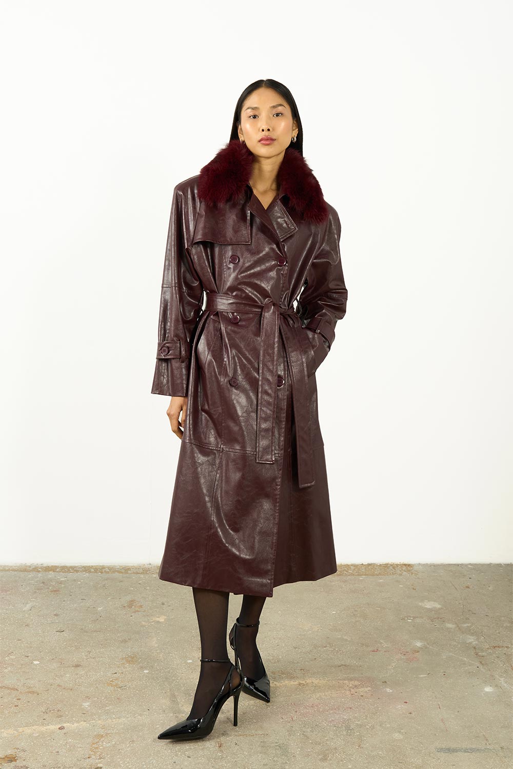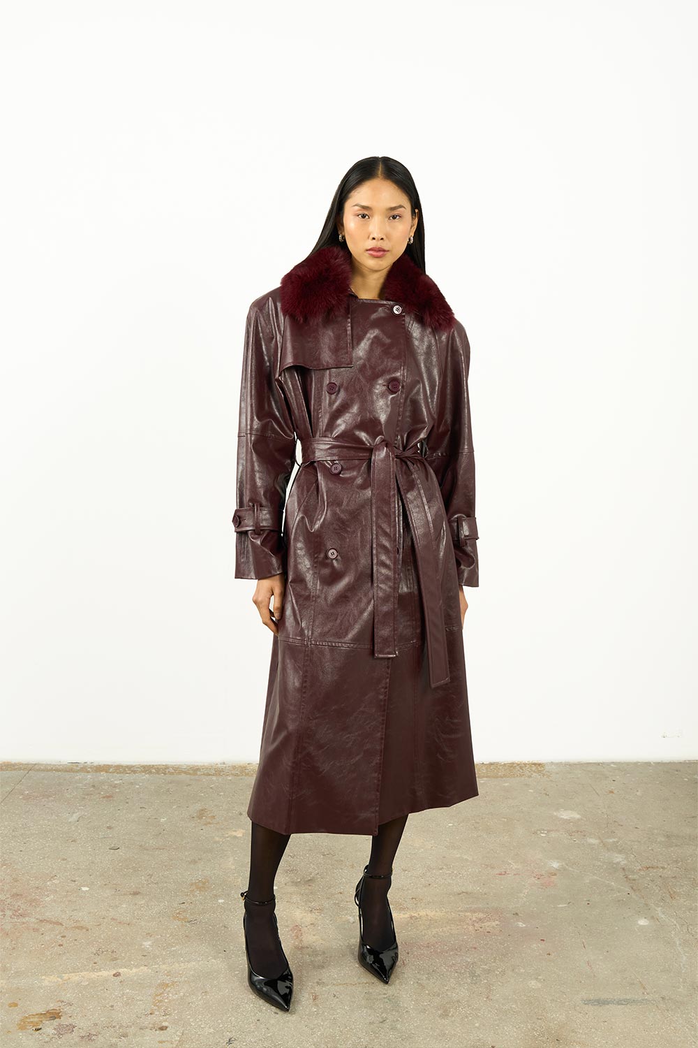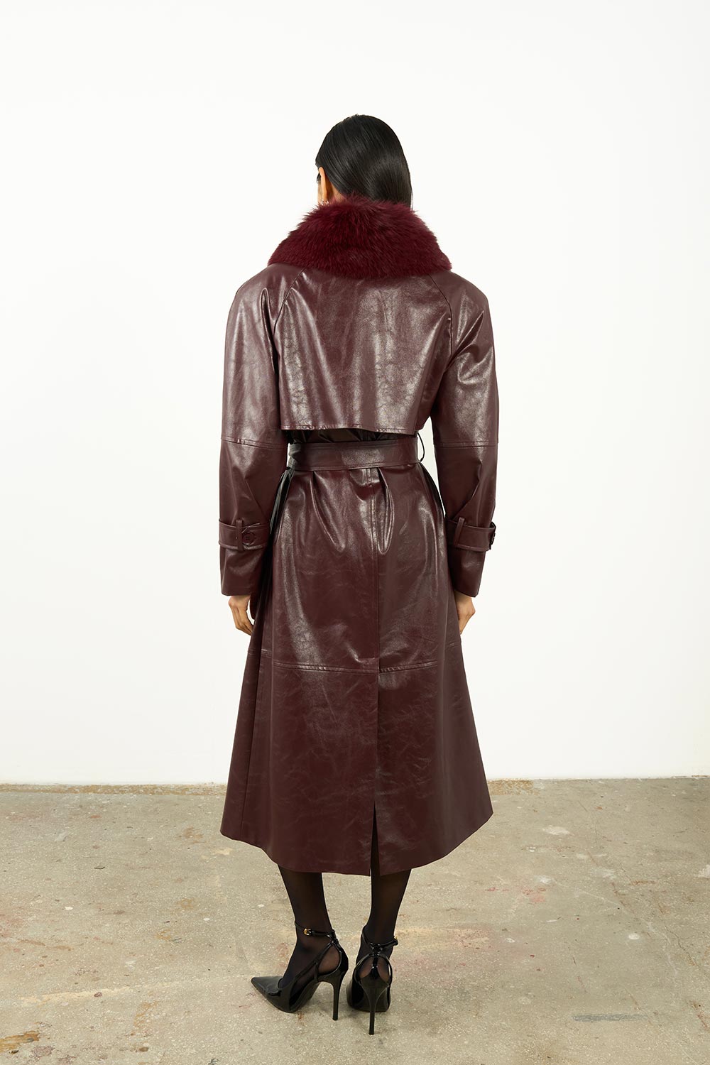 Kürk yaka detayıyla zenginleşen bu bordo deri trençkot, güçlü ve zarif bir siluet sunuyor. Şıklık ve karakteri bir araya getiren iddialı bir parça.
