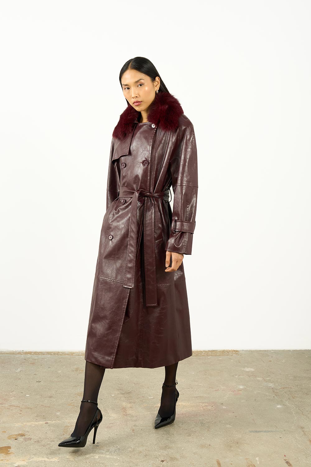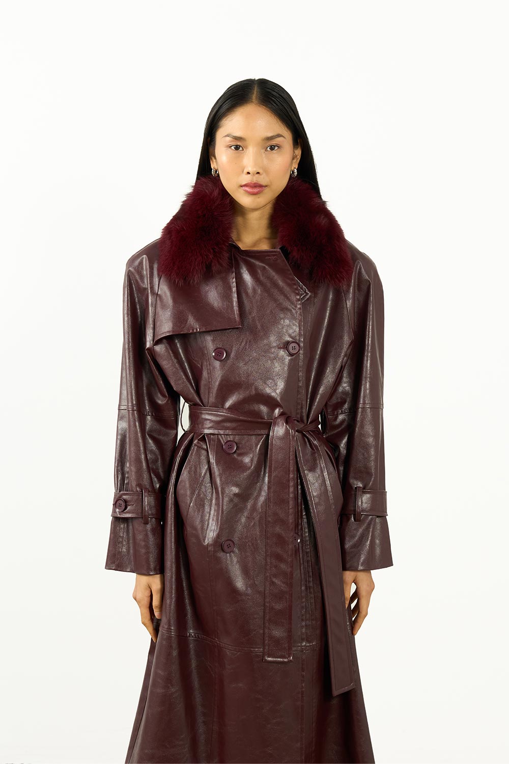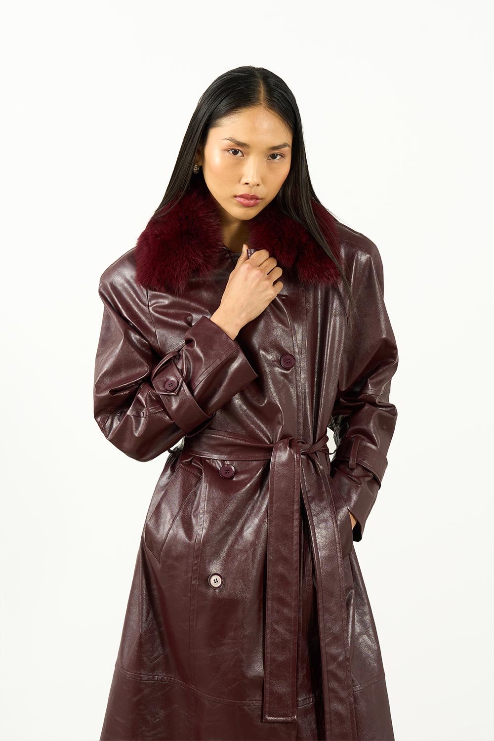 Kürk yaka detayıyla zenginleşen bu bordo deri trençkot, güçlü ve zarif bir siluet sunuyor. Şıklık ve karakteri bir araya getiren iddialı bir parça.