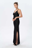 Derin V yakalı, arkası çapraz bağlı, iki yanında yırtmacı olan saten kumaştan uzun elbise.