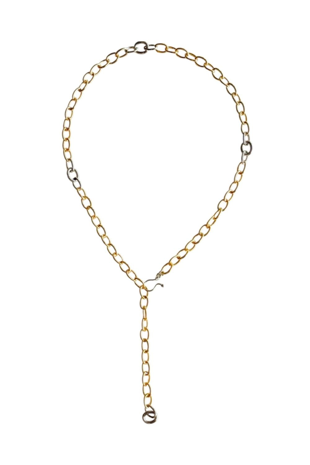 Two Tone Sienna kolye, altın ve gümüş tonlarındaki zincir detaylarıyla öne çıkan bir modeldir. 55 cm uzunluğundadır ve istenirse daha kısa şekilde ayarlanarak da kullanılabilir. Pirinç üzeri altın kaplama yapıya sahip olup silver tonlu halkalarla kontrast bir görünüm sunar. Günlük kullanım için uygundur.
