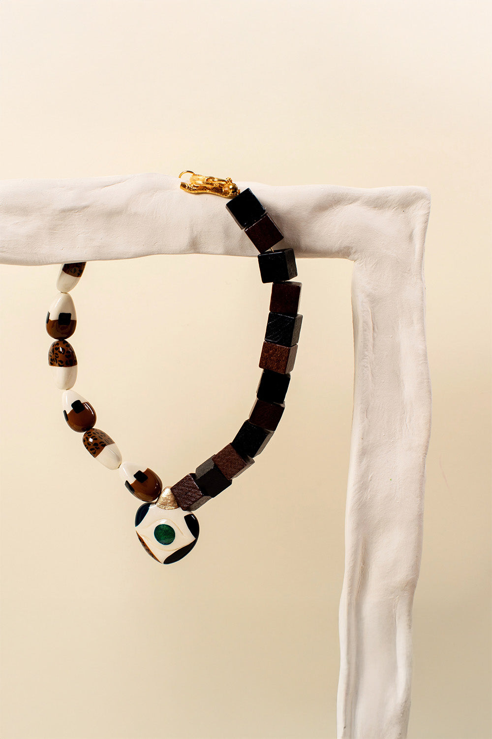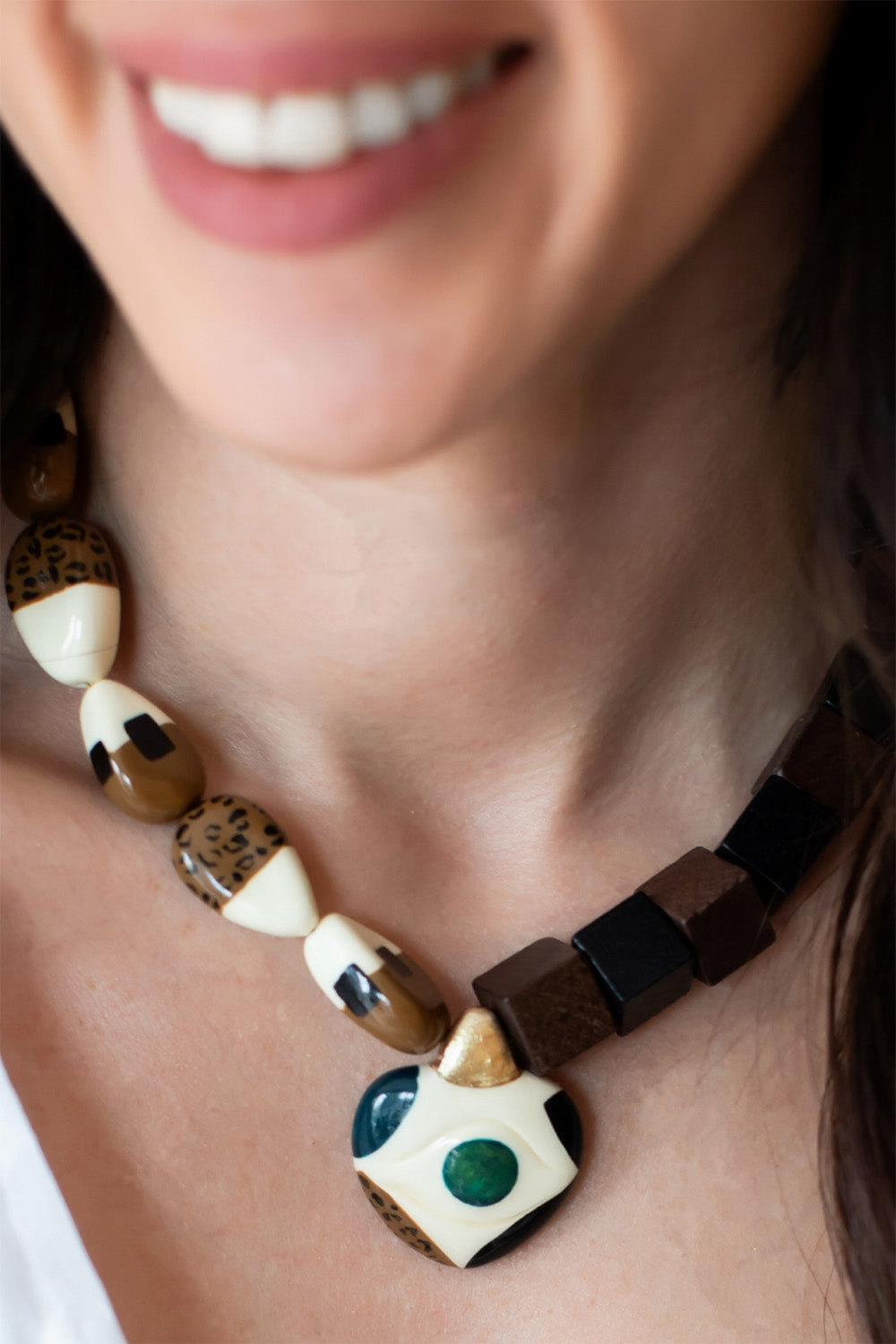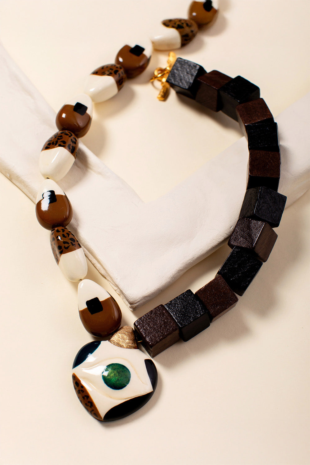 Kalp içi göz ve badem parçalar kilden elde şekillendirilmiştir, desenleri el boyamasıdır. Metal parçalar altın kaplama pirinç, siyah-kahverengi küpler ahşaptır.
