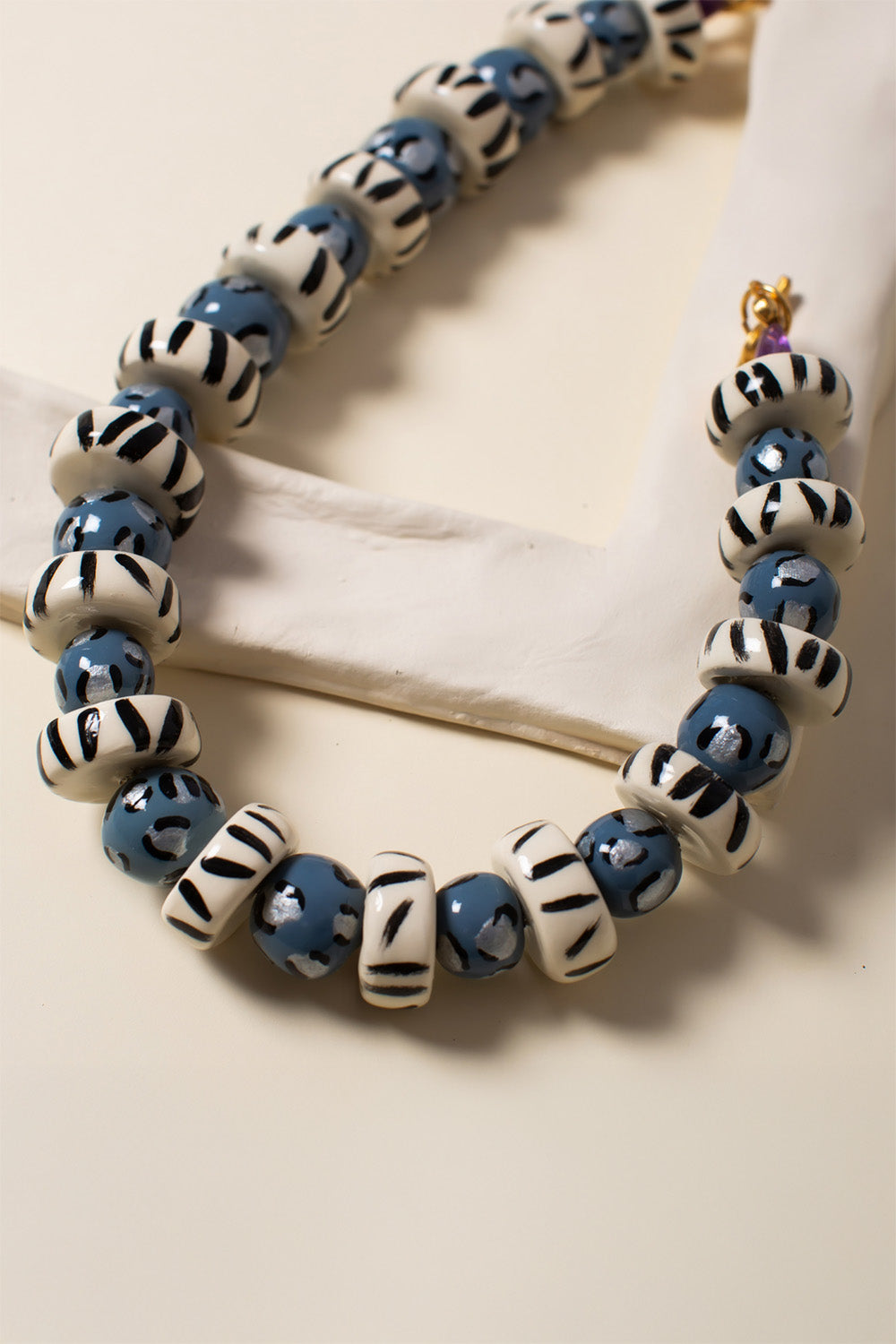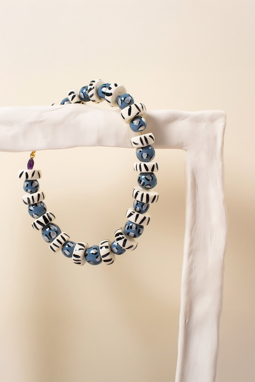 Top ve oval parçalar kilden elde şekillendirilmiştir, desenleri el boyamasıdır. Metal parçalar altın kaplama pirinç, kapama taşları ametisttir.