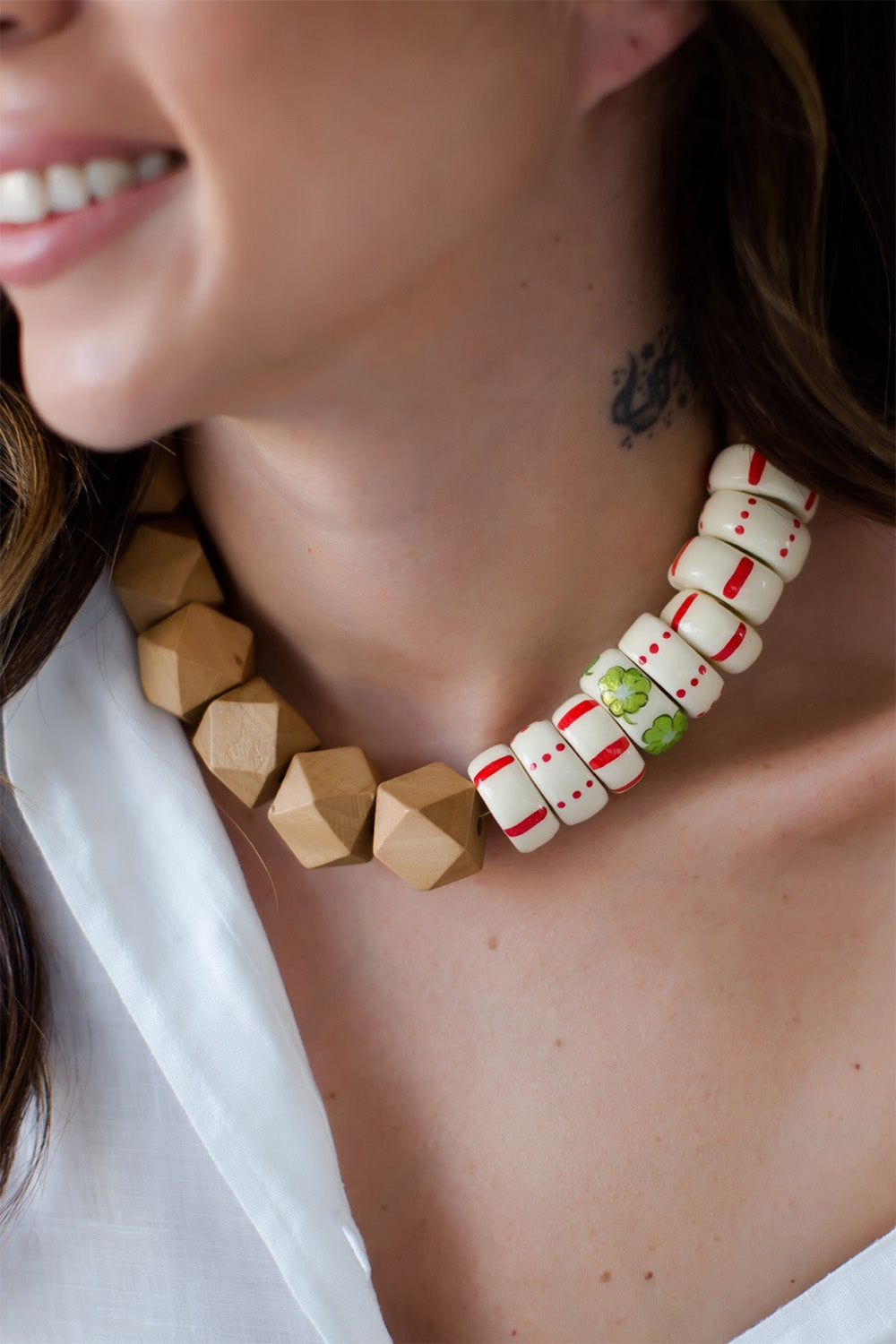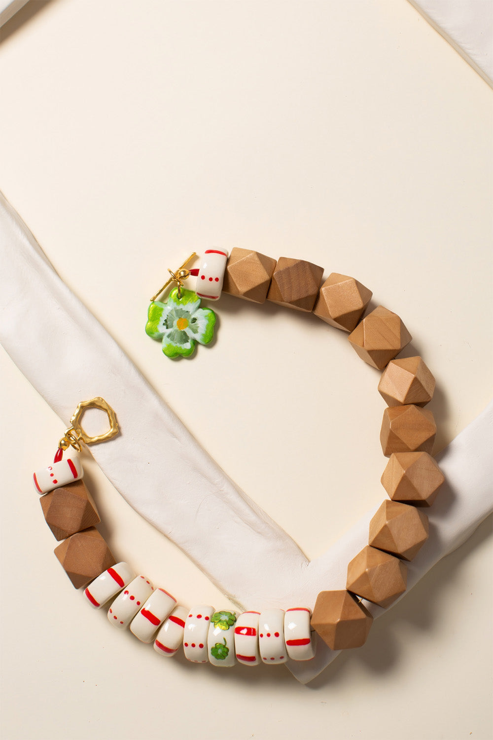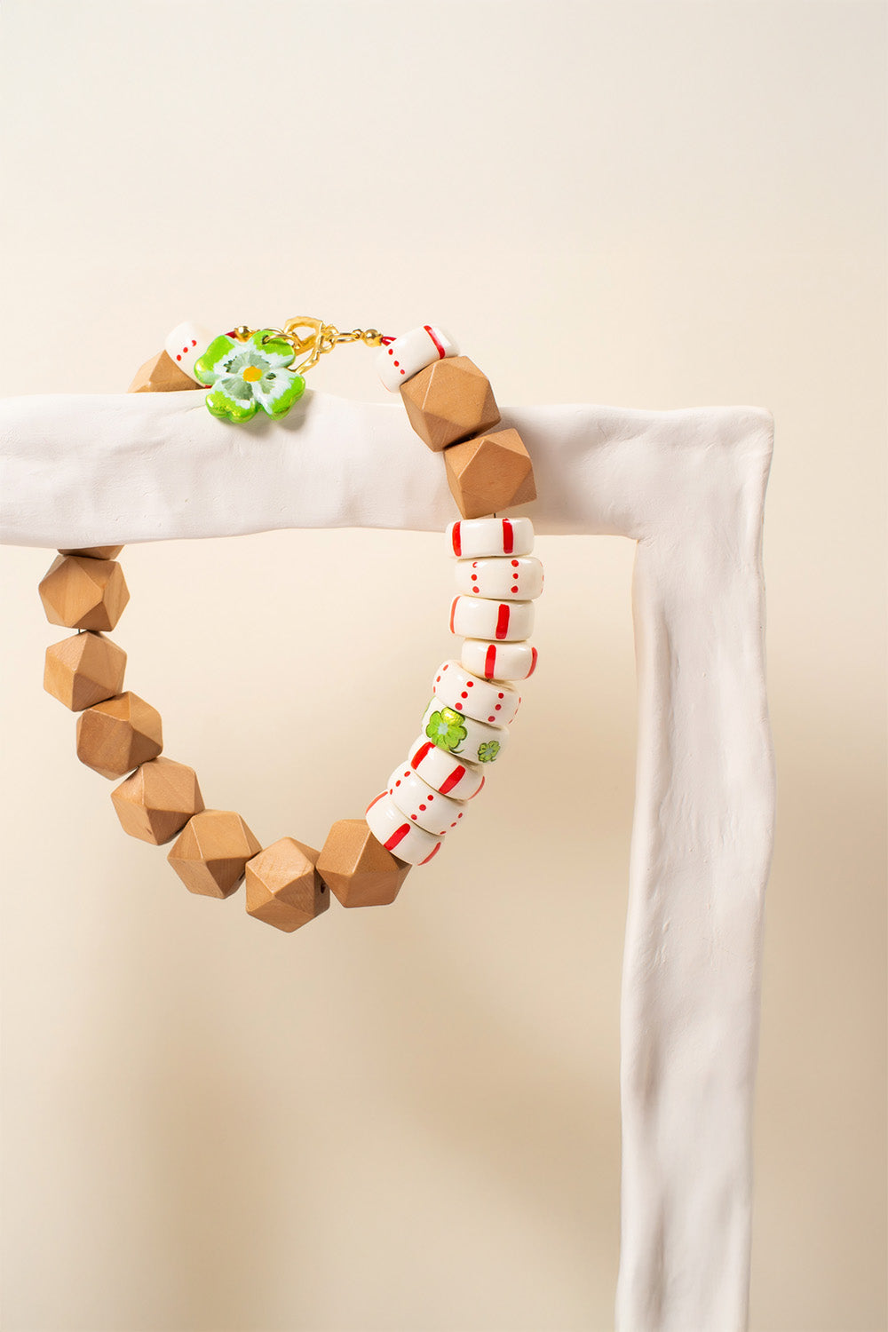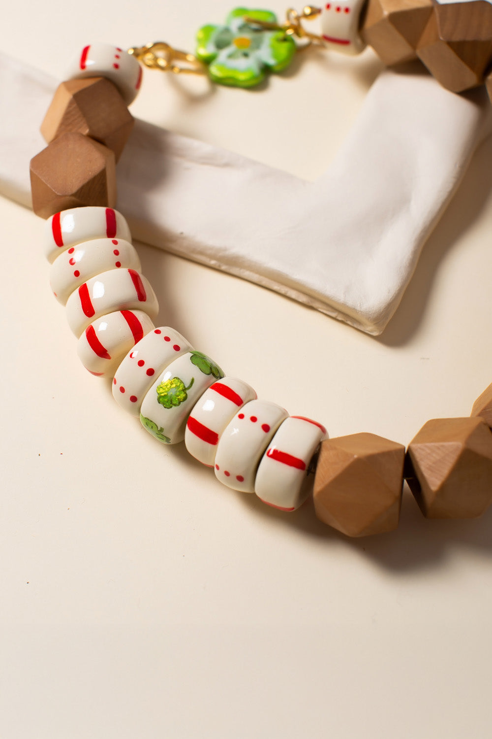 Oval parçalar ve yonca kilden elde şekillendirilmiştir, desenleri el boyamasıdır.Kahverengi geometrik parçalar ahşap, metal parçalar altın kaplama pirinç, kapama taşları mercandır.