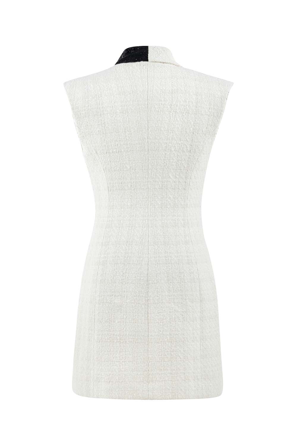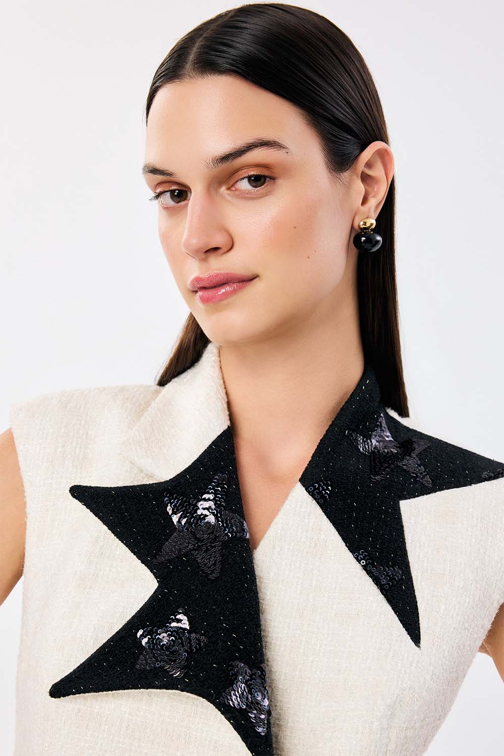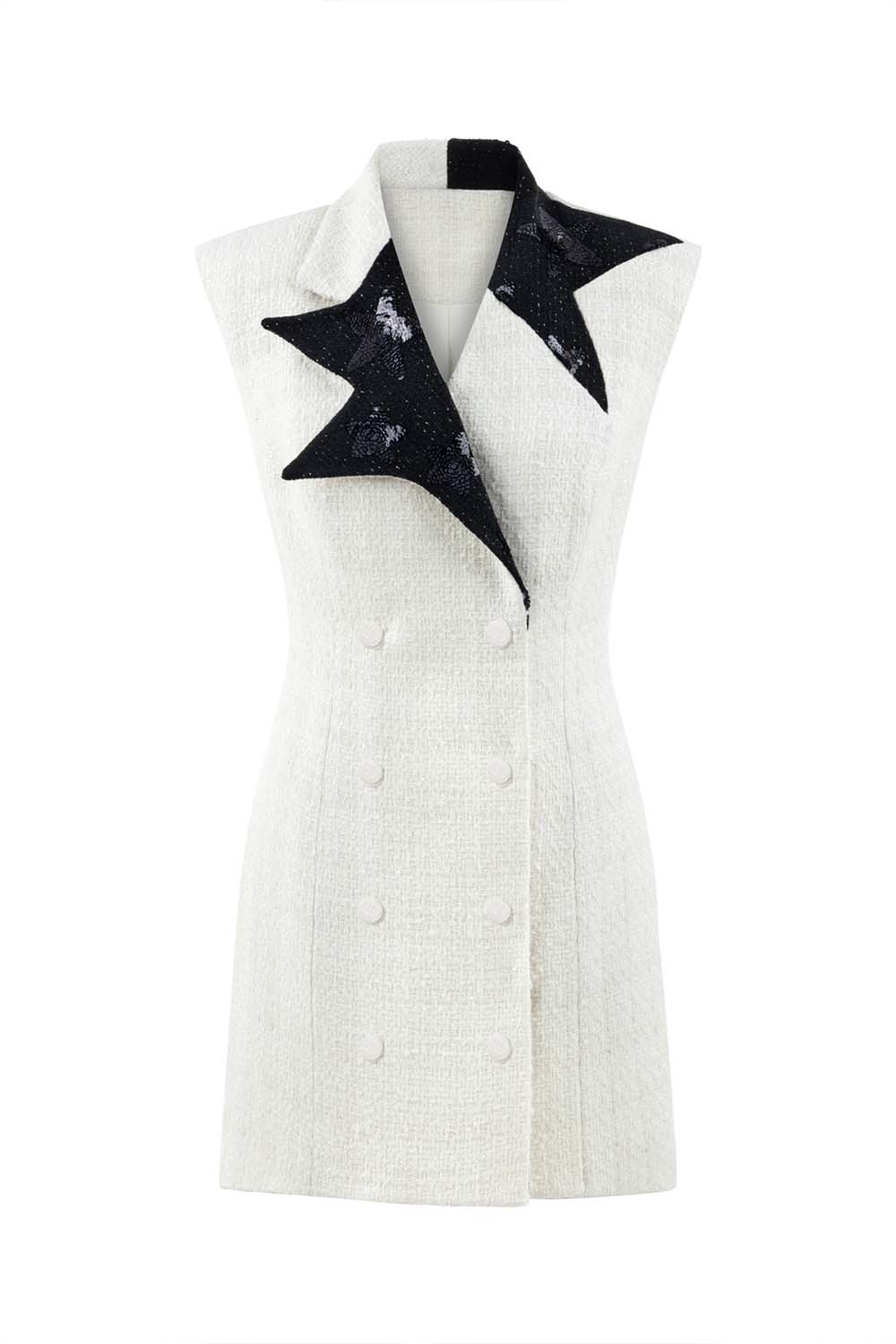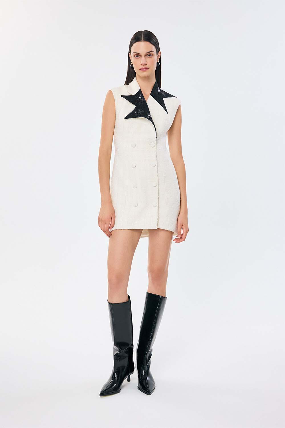A statement of celestial beauty, the Stella Dress shines with its structured fit and sharp star-adorned lapels. Crafted from a refined woven fabric, this sleeveless piece exudes cosmic sophistication, making it a perfect blend of boldness and timeless elegance.