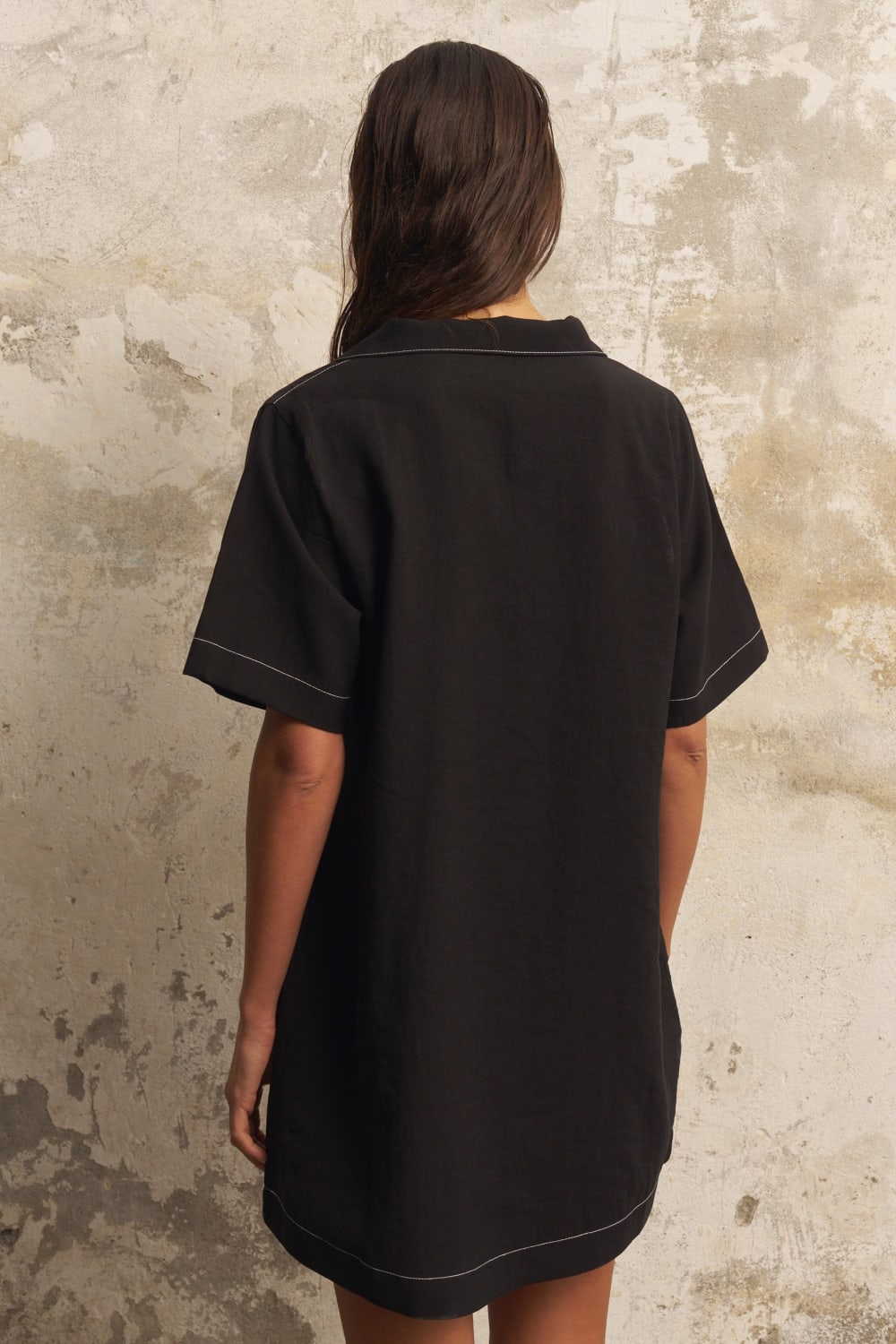 Bu mini elbise, modern bir dokunuş için rahat silüetle birleşen oversize kesimi ve ince kontrast dikiş detaylarıyla öne çıkar. Açık yaka ve kısa kolları, sade cazibesini artırarak günlük kullanıma uygun çok yönlü bir seçenek sunar.