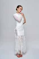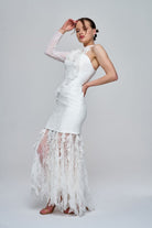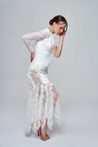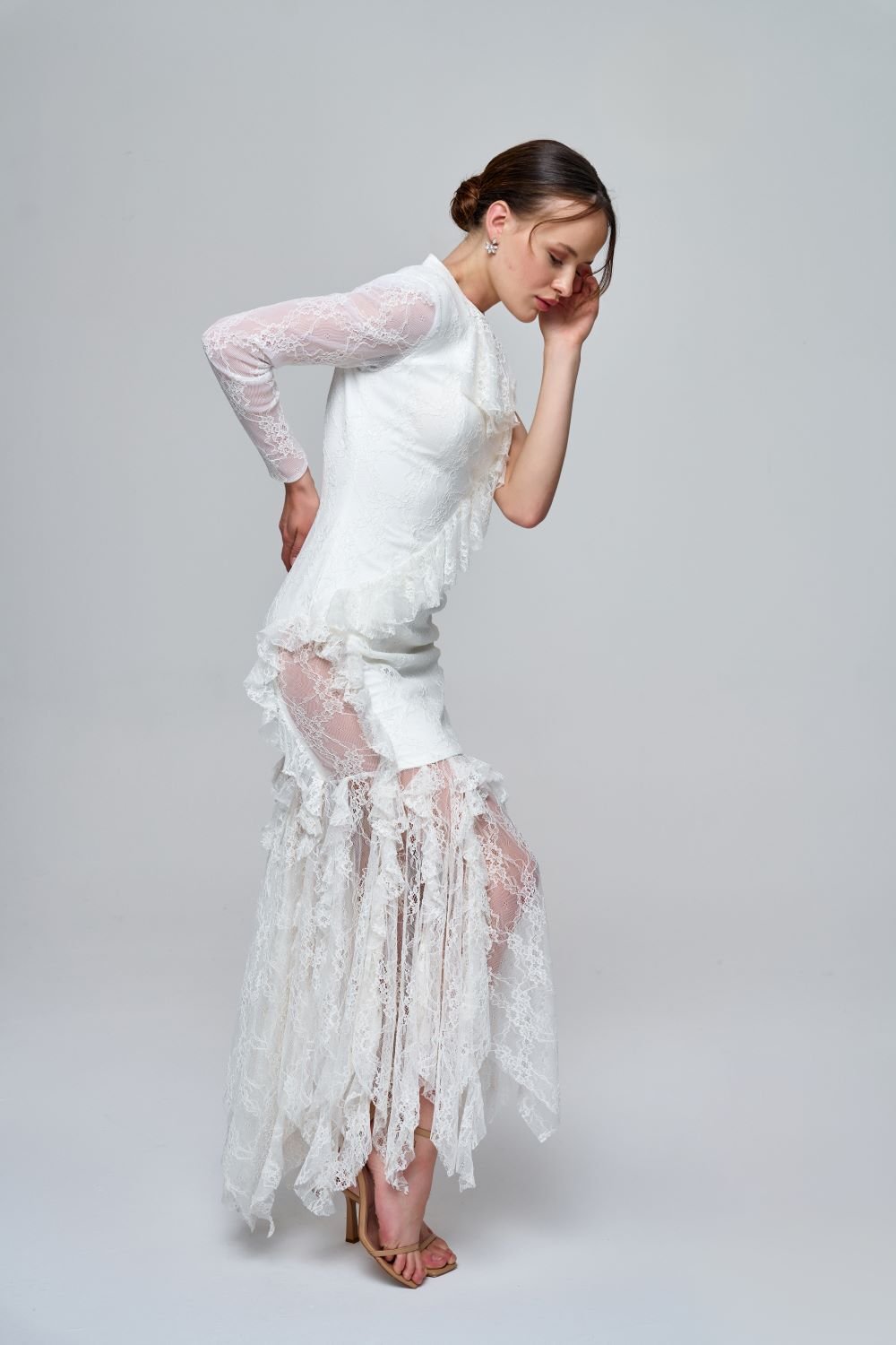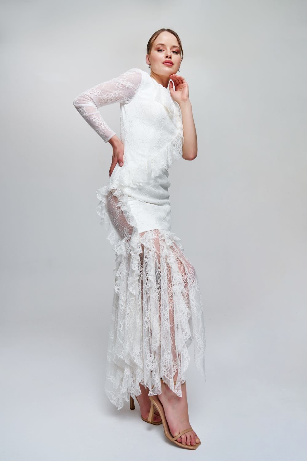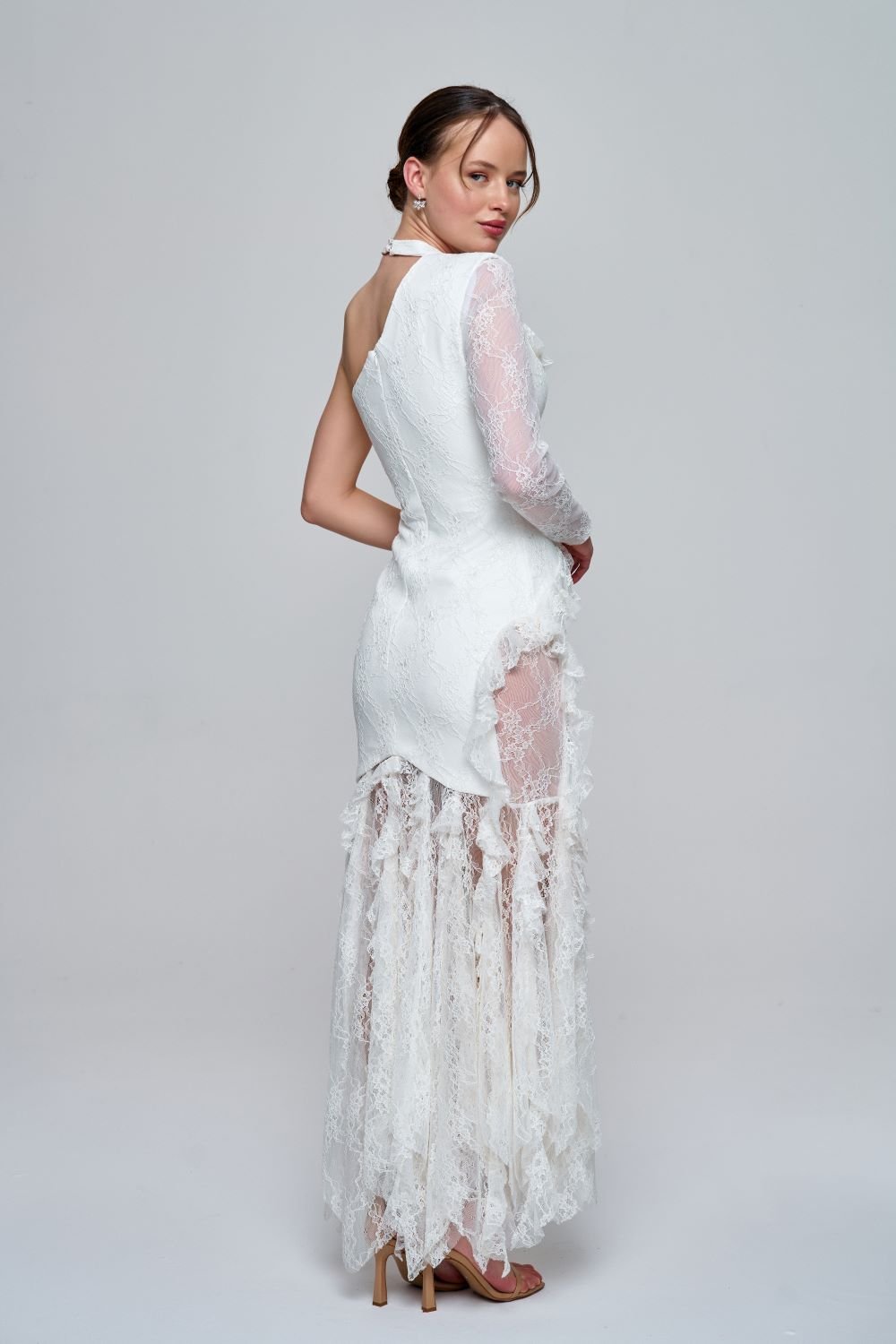 Asimetrik Volanlı Tek Kol Beyaz Dantel Elbise