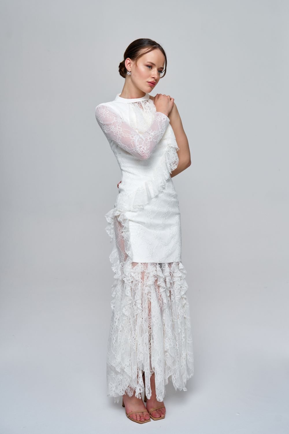 Volanlı dantelli bilezik yaka, tek kol elbise.