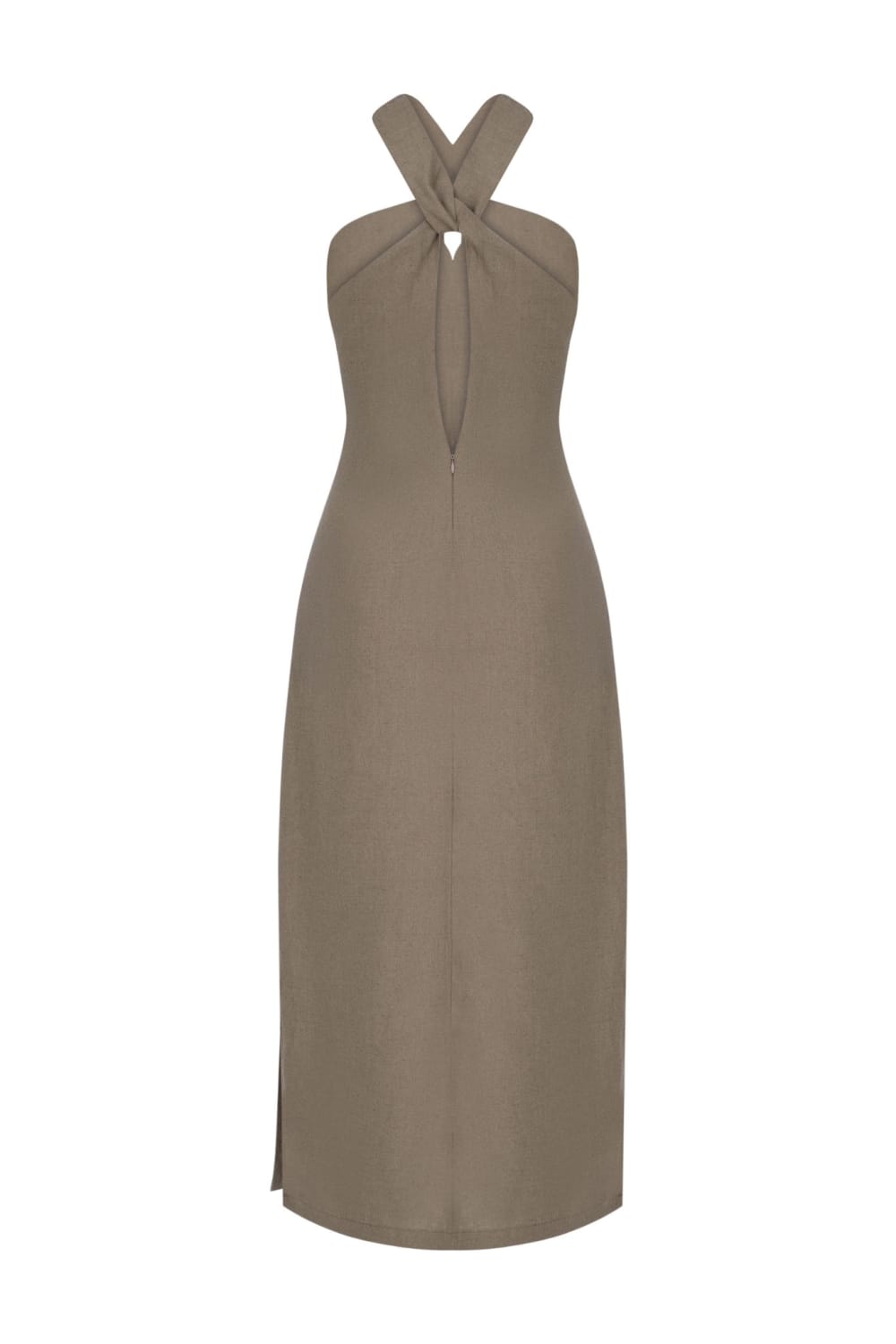 Yakası gold rengi toka detaylı bej renk keten elbise.