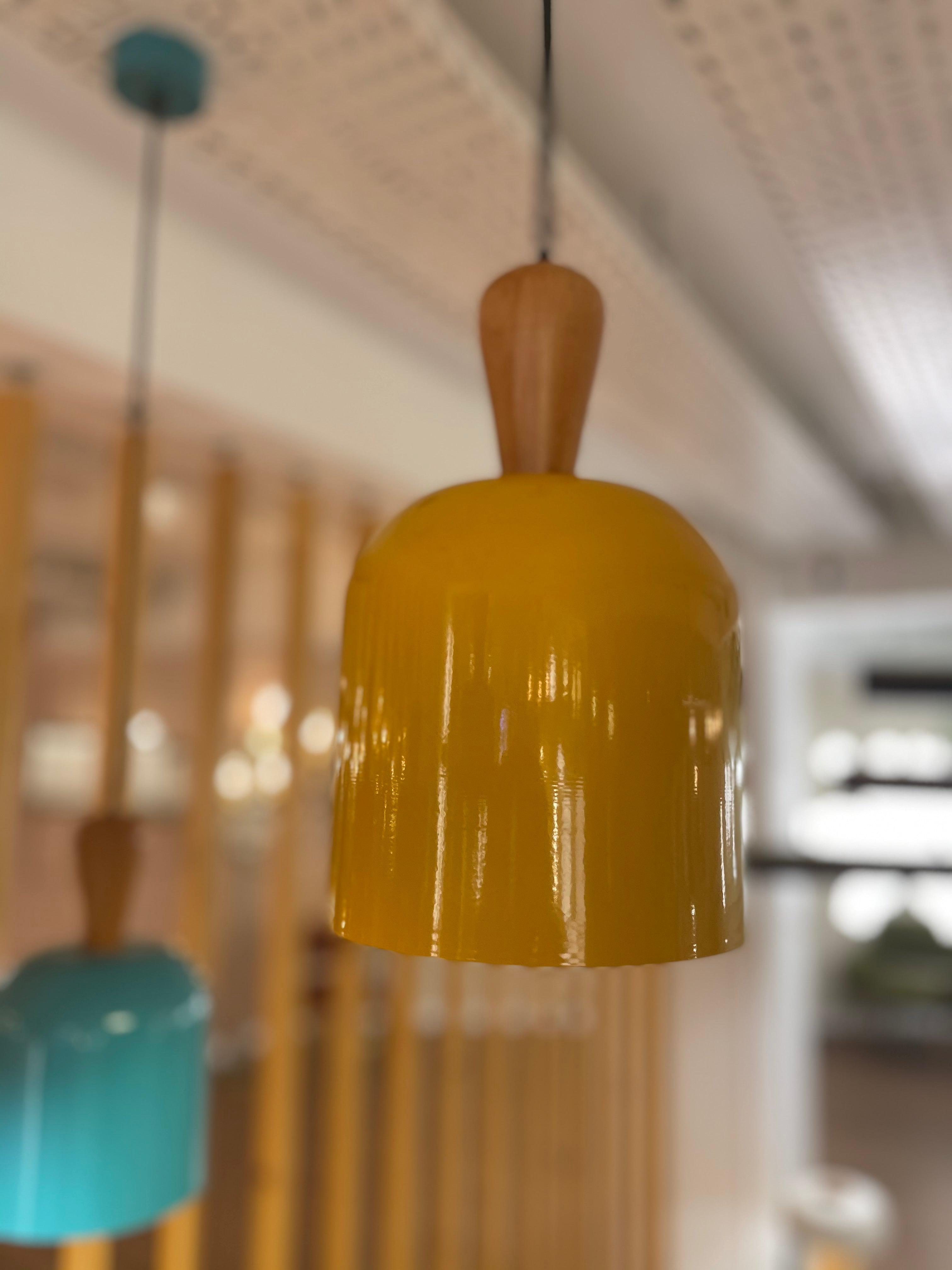 Atolye'nin Rainbow serisi 3 farklı boyda ve onlarca farklı renkte üretilen metal ile ahşap materyalin buluştuğu tekli sarkıtlar serisidir.