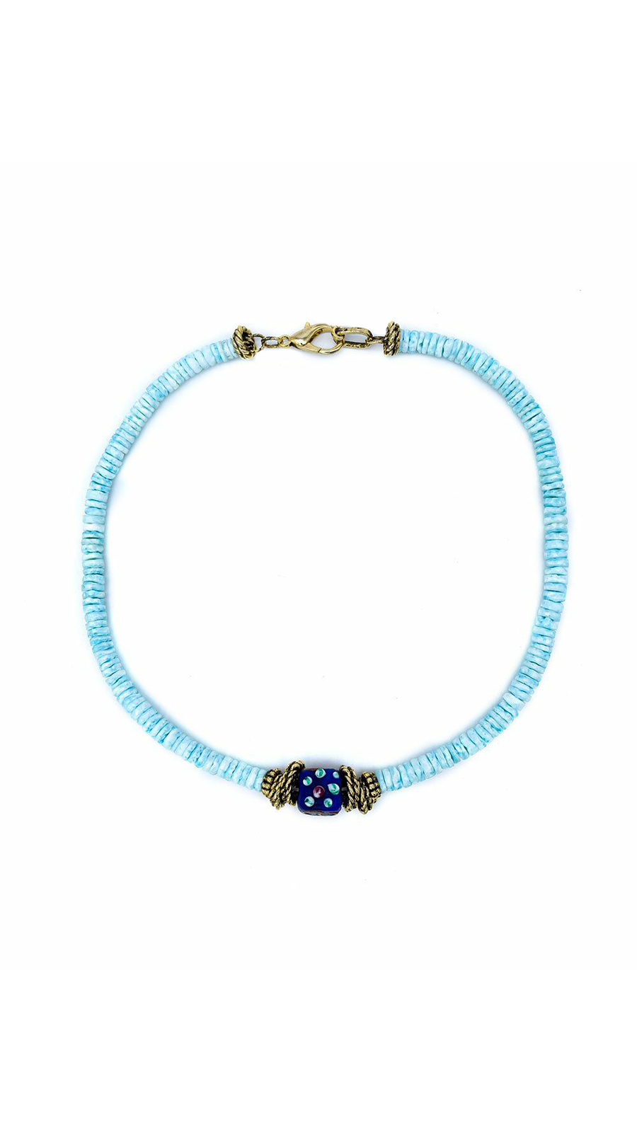 Boska Mavi Kolye, turkuaz renkli sedef taşlarının etkileyici bir sıralama ile birleştirilmesiyle tasarlanmıştır. Kolyenin merkezine yaklaşıldığında, parlak 22 ayar altın kaplama pirinç halkalar göze çarpar ve bu halkaların ortasında mavi renkli cam taşla bütünleşir. Hem yaz aylarına hem de günlük kullanıma mükemmel uyum sağlar. Boska Mavi Kolye, sade ama etkileyici bir şıklığı kolayca yakalamanızı sağlar.