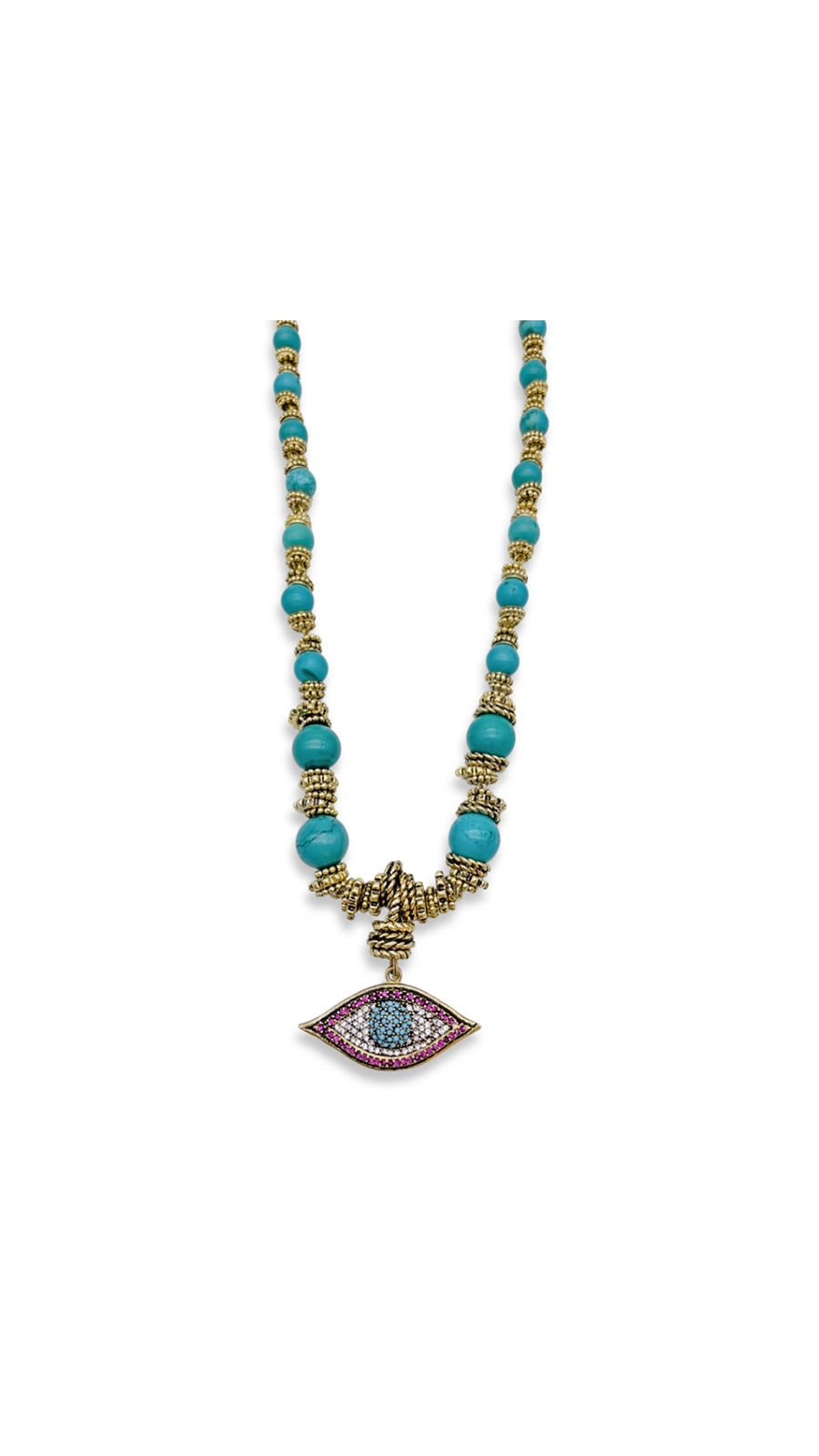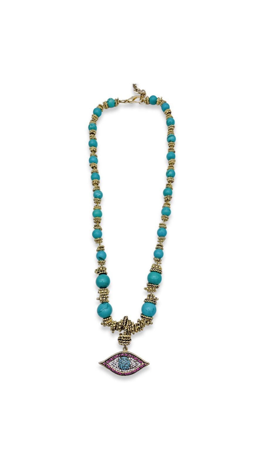 Chans Doğal Taş Kolye, doğanın eşsiz renklerini ve modern tasarımı bir araya getirerek mükemmel bir uyum yakalıyor. Canlı turkuaz doğal taşlarının ve 22 ayar altın kaplama pirinç halkaların birleşimi, kolyeye hem doğal bir güzellik hem de ışıltılı bir parlaklık katıyor. Chans Doğal Taş Kolye'nin ucundaki göz sembolü, 22 ayar altın kaplama pirinç üzerine dikkatlice yerleştirilmiş kristal taşlarla bezenerek, kolyeye hem mistik bir dokunuş hem de sofistike bir zarafet ekliyor. Chans Doğal Taş Kolye, sıradışı bir şıklığı ve anlamlı bir tasarımı tek bir aksesuarda buluşturarak, her giyim tarzına özgün bir dokunuş katar.