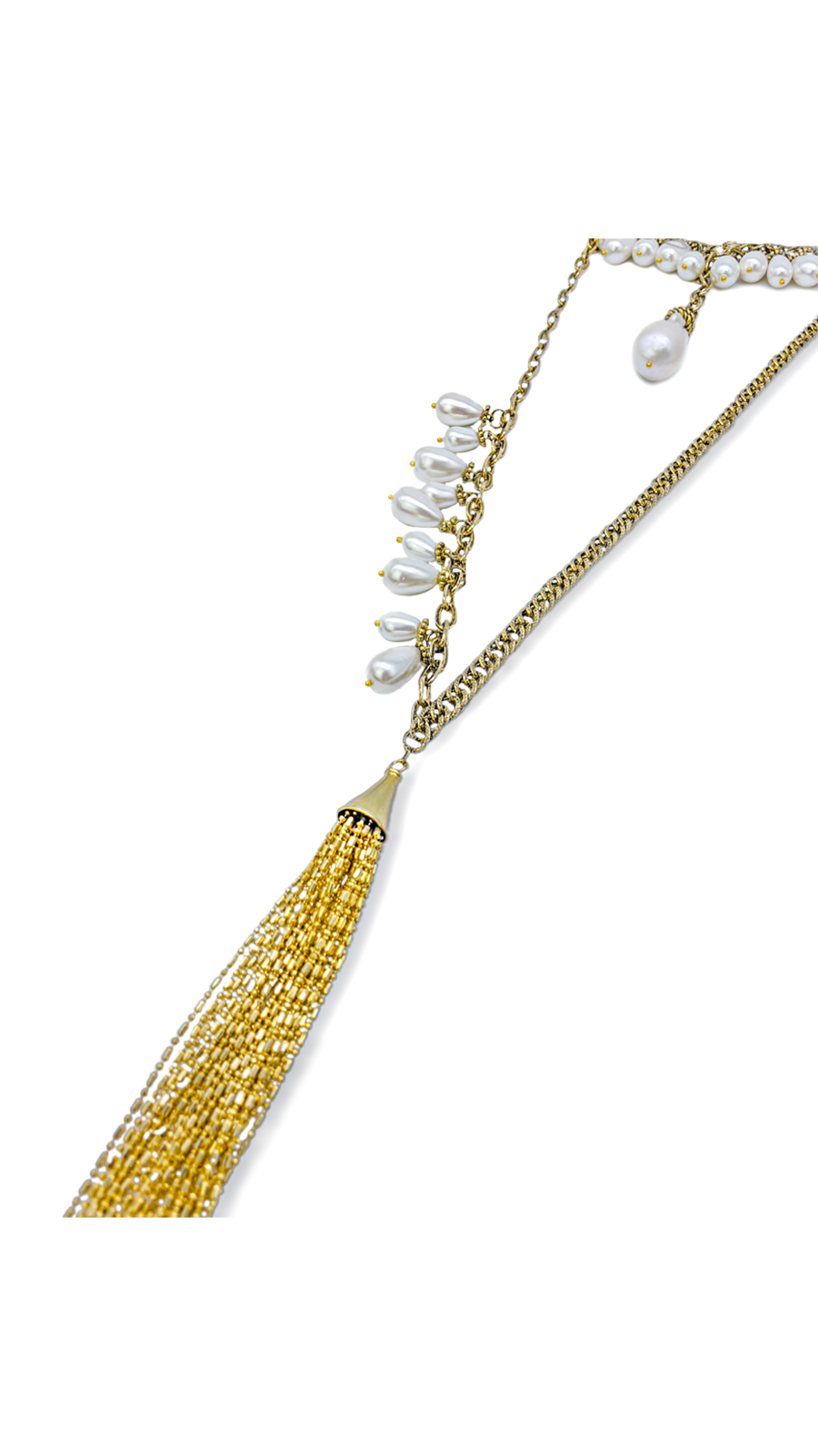 Croga İnci Kolye, 22 ayar altın kaplamayla parlatılmış pirinç zincirlerin çift sıralı düzenlemesi, bu kolyeyi hem modern hem de zamansız kılan bir aksesuar haline getirir. Boynu nazikçe saran üst sıra zincir, üzerine dikkatlice yerleştirilmiş parlak incilerle süslenmiş ve onlardan bir tanesi merkezi bir barok inci olarak sarkarak göz alıcı bir detay sunar. Altın ve incilerin bu lüks kombinasyonu, ikinci sıra zincirde devam eder. Daha uzun olan bu zincir, yine incilerle bezeli ve her biri Croga İnci Kolye'ye farklı bir derinlik katıyor. Croga İnci Kolye'nin ikinci sırası, bir uçtan diğerine akıcı bir hareketle zenginleştirilmiş, kolyenin bu kısmı zarif bir dengede asılı dururken, diğer uç, yine bir barok incinin güzellikle sarkmasını sağlar.