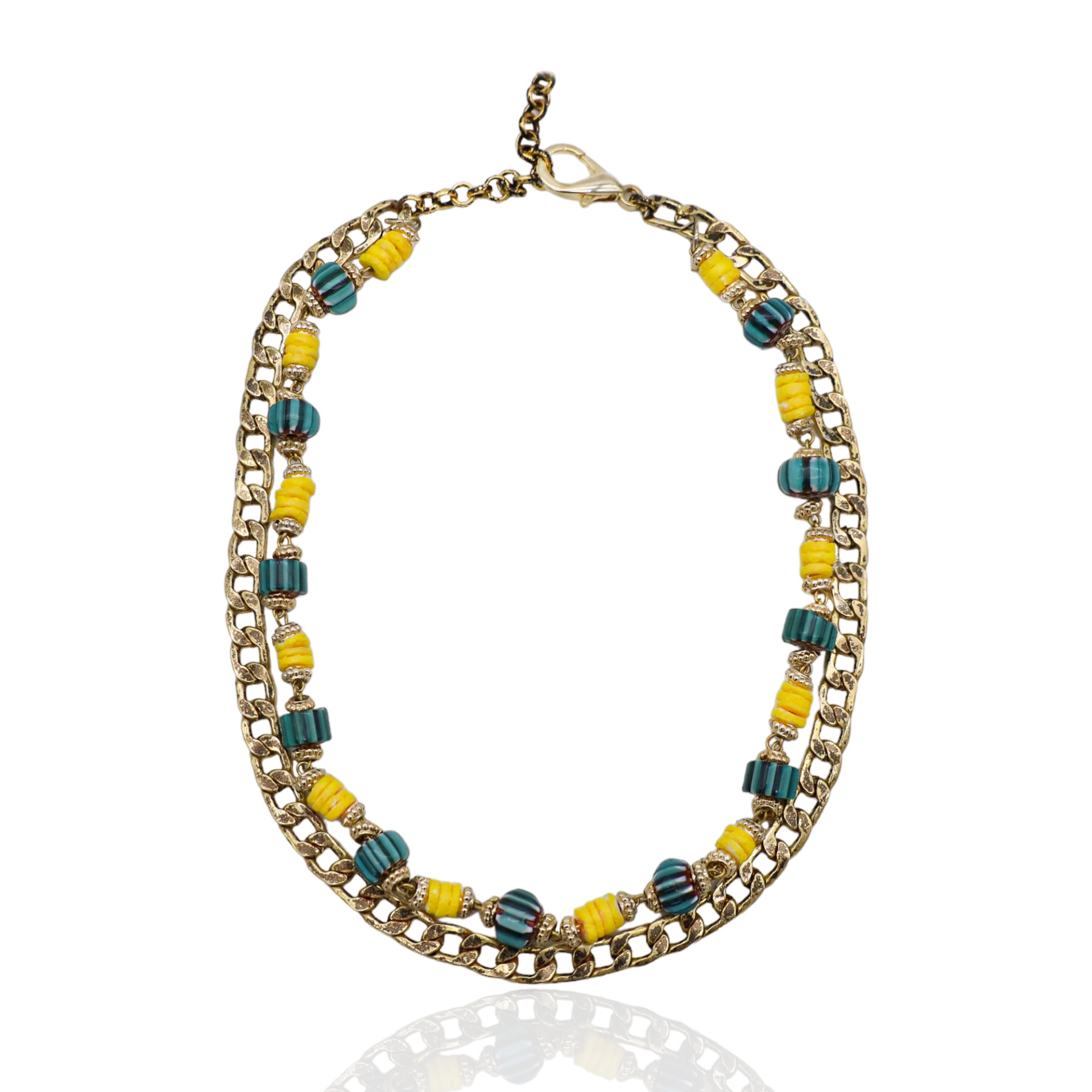 GIALLO Doğal Taş Kolye, zengin kültürel mirası ve doğanın canlı renklerini yansıtan bir eserdir. İlk sırasında Afrika taşının sıcak tonları, sedef taşının doğal parlaklığı ve 22 ayar altın kaplama pirinç halkaların antik çağları anımsatan ihtişamı bulunuyor. Bu sıra, geleneksel el sanatlarının modern tasarım anlayışıyla buluşmasını simgeler. İkinci sıra ise, altının asaletini modern bir çizgiyle sunan 22 ayar altın kaplama pirinç zincirle tamamlanıyor. Bu sıra, GIALLO Doğal Taş Kolye'nin şıklığını minimal bir çizgiyle vurgularken, ilk sıranın canlılığı ile mükemmel bir kontrast oluşturuyor.