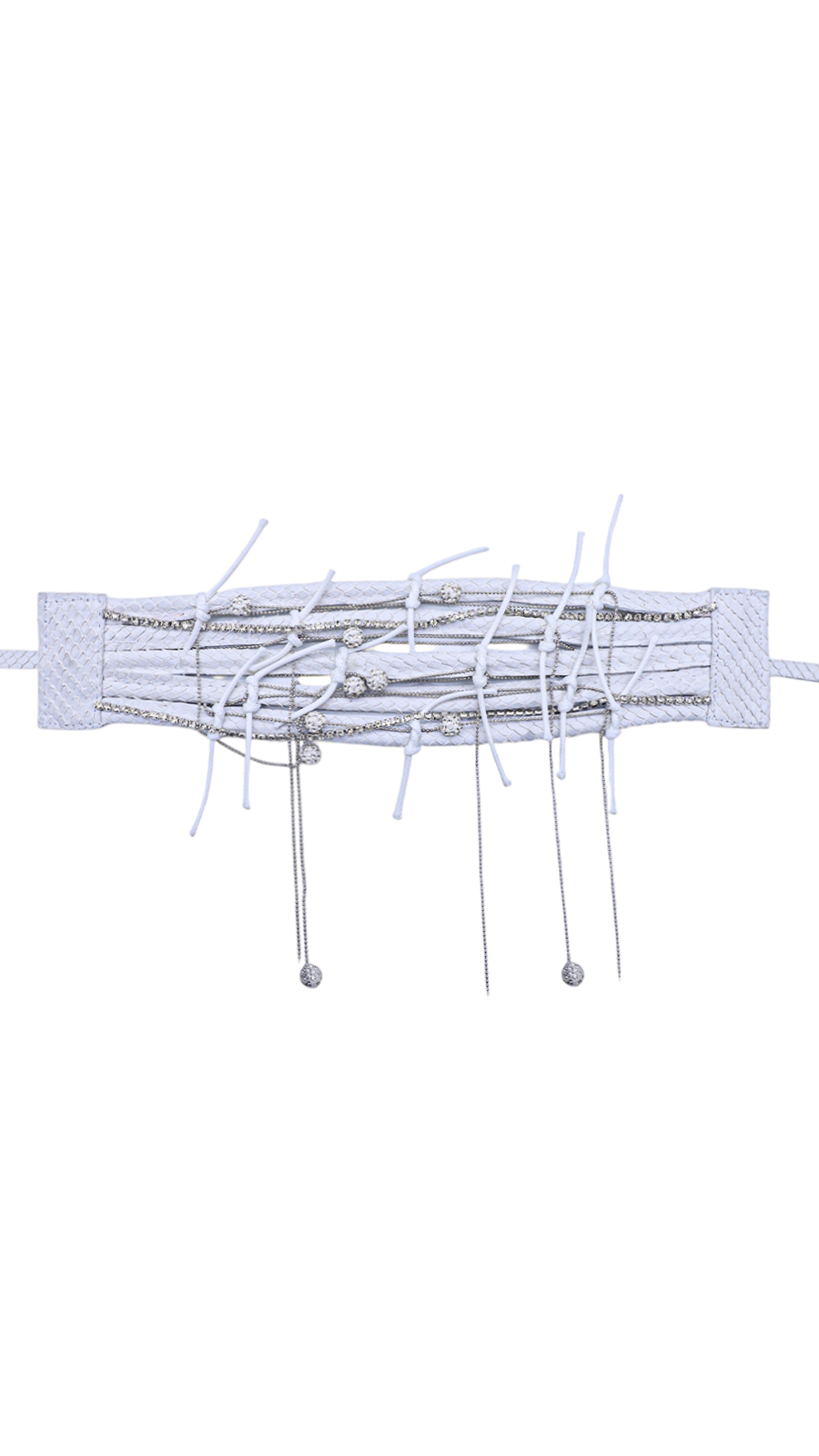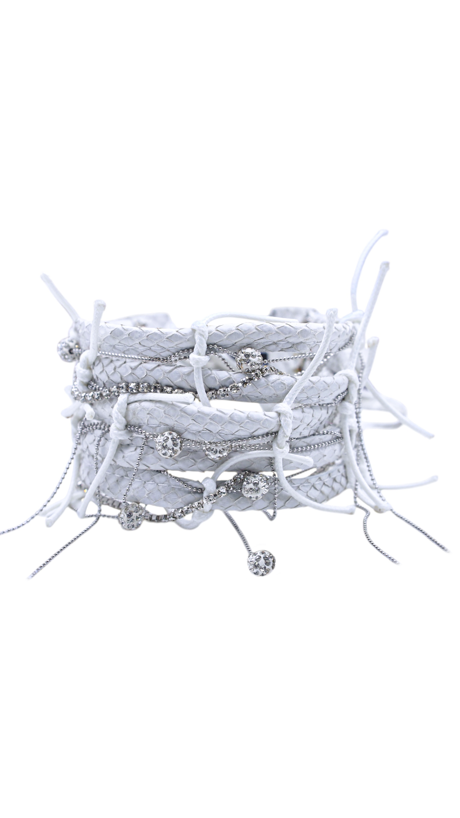 MateryalHakiki yılan derisi, pirinç zincir, kristal taş, markazitli top
