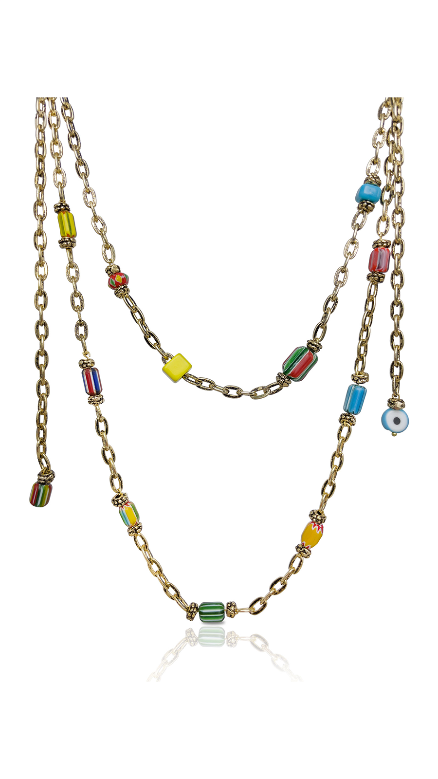 SUIL Altın Kaplama Çoklu Kolye, dünya döndükçe değişen ve yenilenen doğanın renklerini yansıtan bir tasarım harikasıdır. 22 ayar altın kaplamalı pirinç zincir üzerine dikkatli bir şekilde yerleştirilmiş Murano, Afrika ve howlite taşları, bu kolyeye eşsiz bir çekicilik katıyor. Her taş, SUIL Altın Kaplama Çoklu Kolye'ye benzersiz bir karakter ve sofistike bir görünüm sunarken, renklerin zarif karışımı her giysiyle uyum sağlar ve giyen kişinin tarzına canlı bir dokunuş ekler.