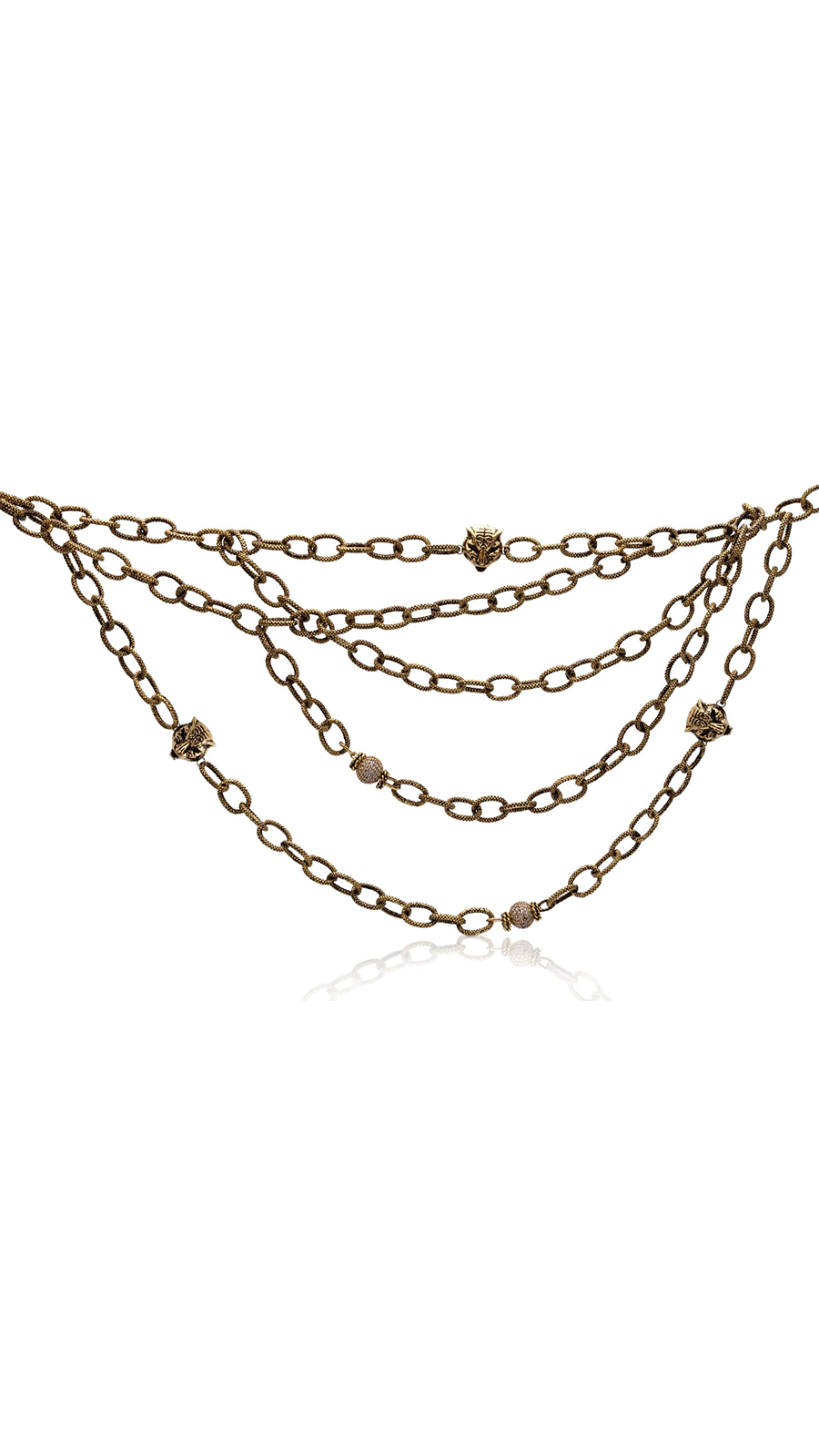 TIGER Zincir Çoklu Kolye, ormanın gizemini ve kaplanın asaletini boynunuzda taşımak isteyenler için tasarlandı. Kaplan motifleriyle vahşi doğanın gücünü, kristal taşlı toplarla da gece gökyüzünün ışıltısını bir araya getiriyor. Her bir zincir, kaplanın adımlarını takip eder gibi sıralanarak kolyeye derinlik katmaktadır. TIGER Zincir Çoklu Kolye, doğanın ve estetiğin mükemmel birlikteliğini yansıtan, baş döndürücü bir tasarım. Bu kolye, takı koleksiyonunuzun vazgeçilmez bir parçası olacak.