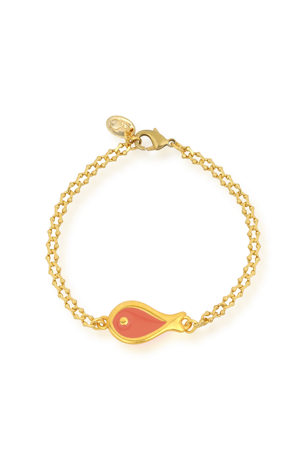 Gold plated chain bracelet with an orange enameled fish charm.