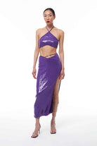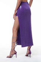 Payetli midi etek. Vegan deri biye ve metal aksesuar detaylı.