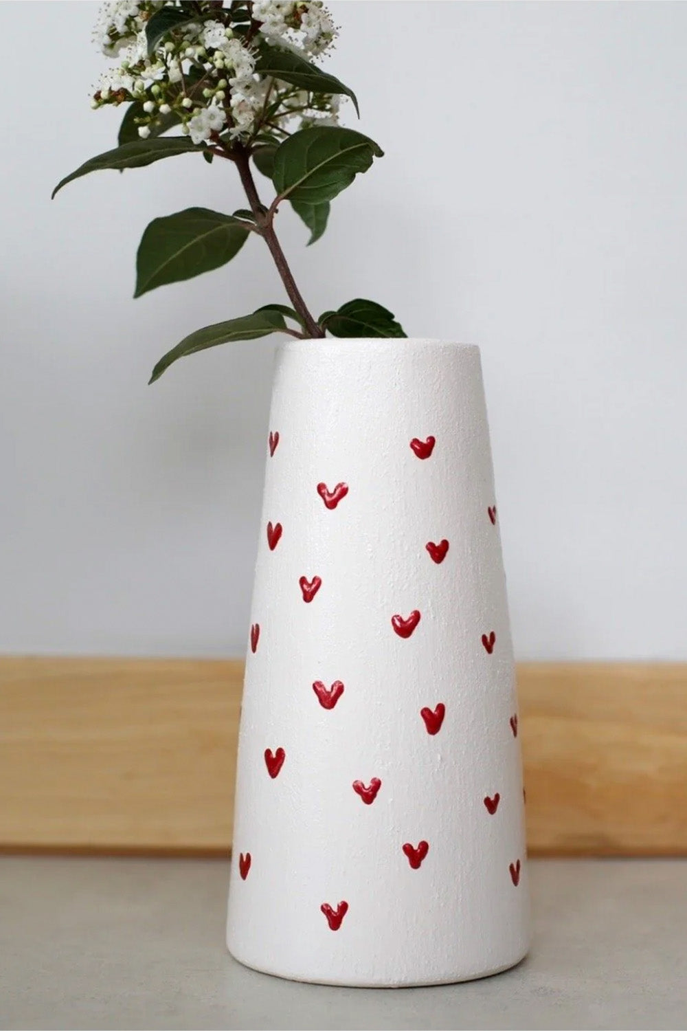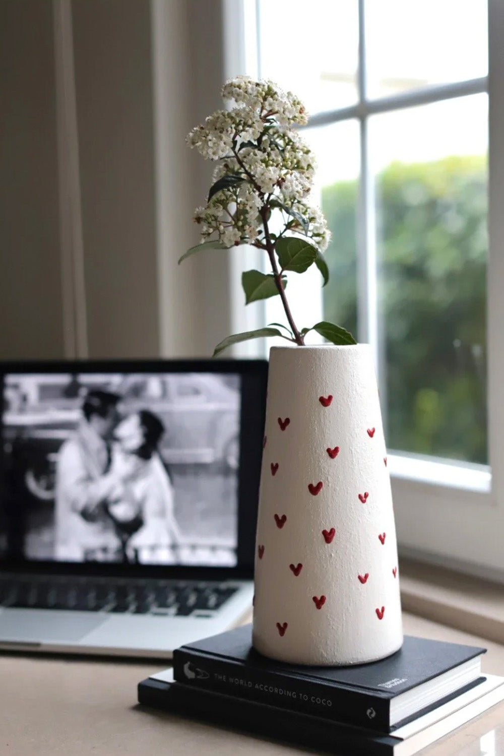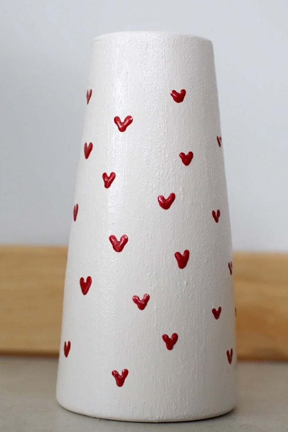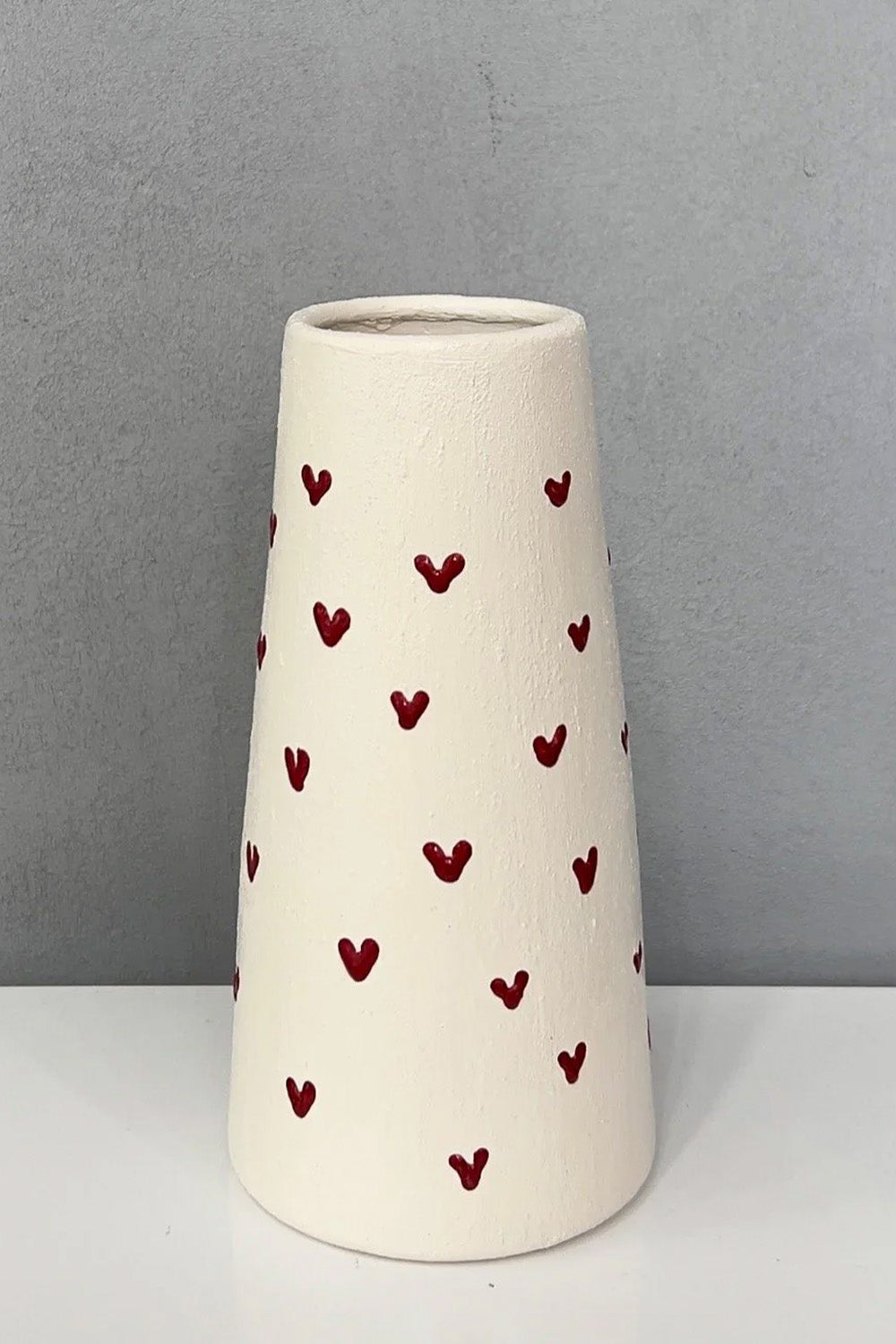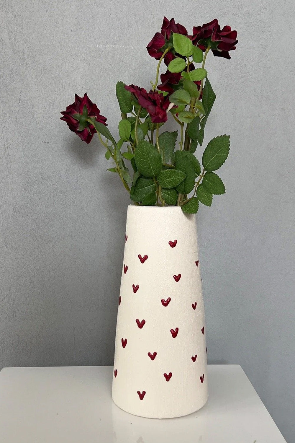 Derya Kurdoğlu'nun özel tasarımı olan bu üzeri kabartma küçük kırmızı kalpli seramik vazo, dekorasyonunuzu büyüleyici bir hale getirmek için ideal bir seçenek.