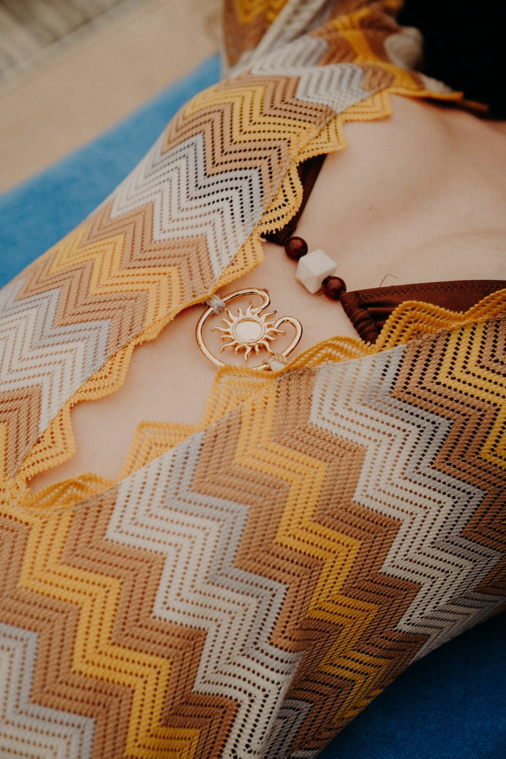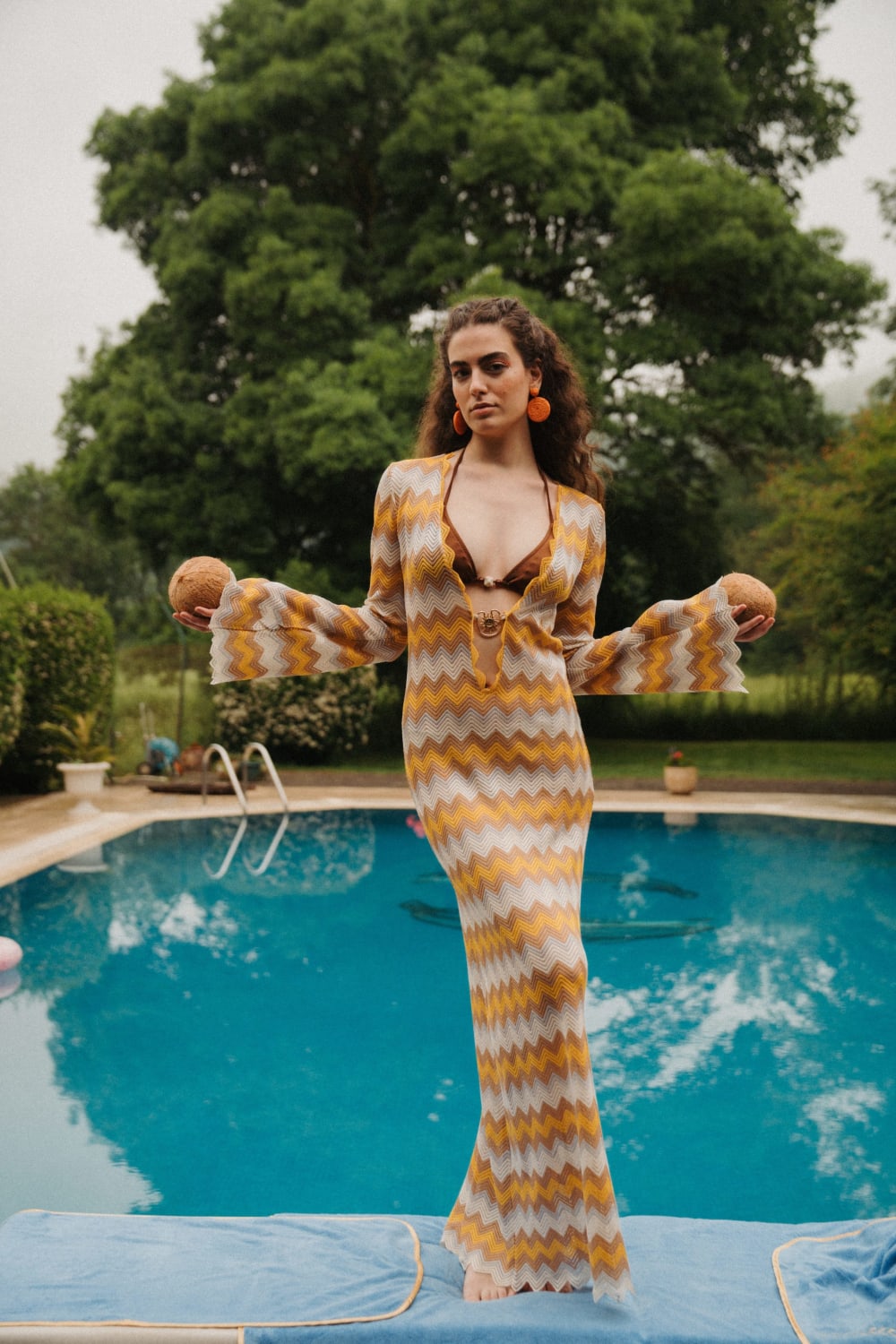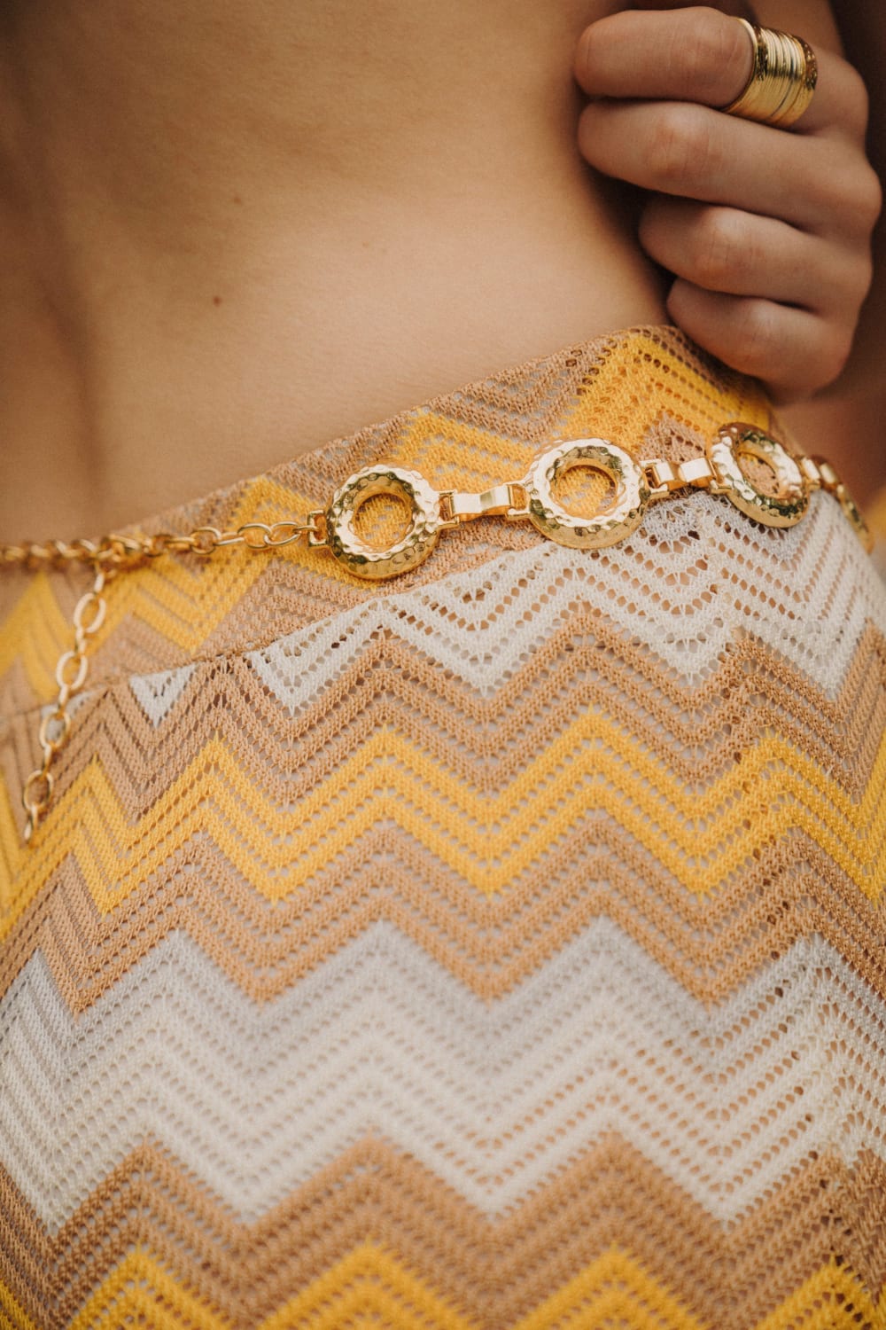 Göğüs dekolteli bir elbisedir.Gögüs kısmında gold aksesuar bulunmaktadır.