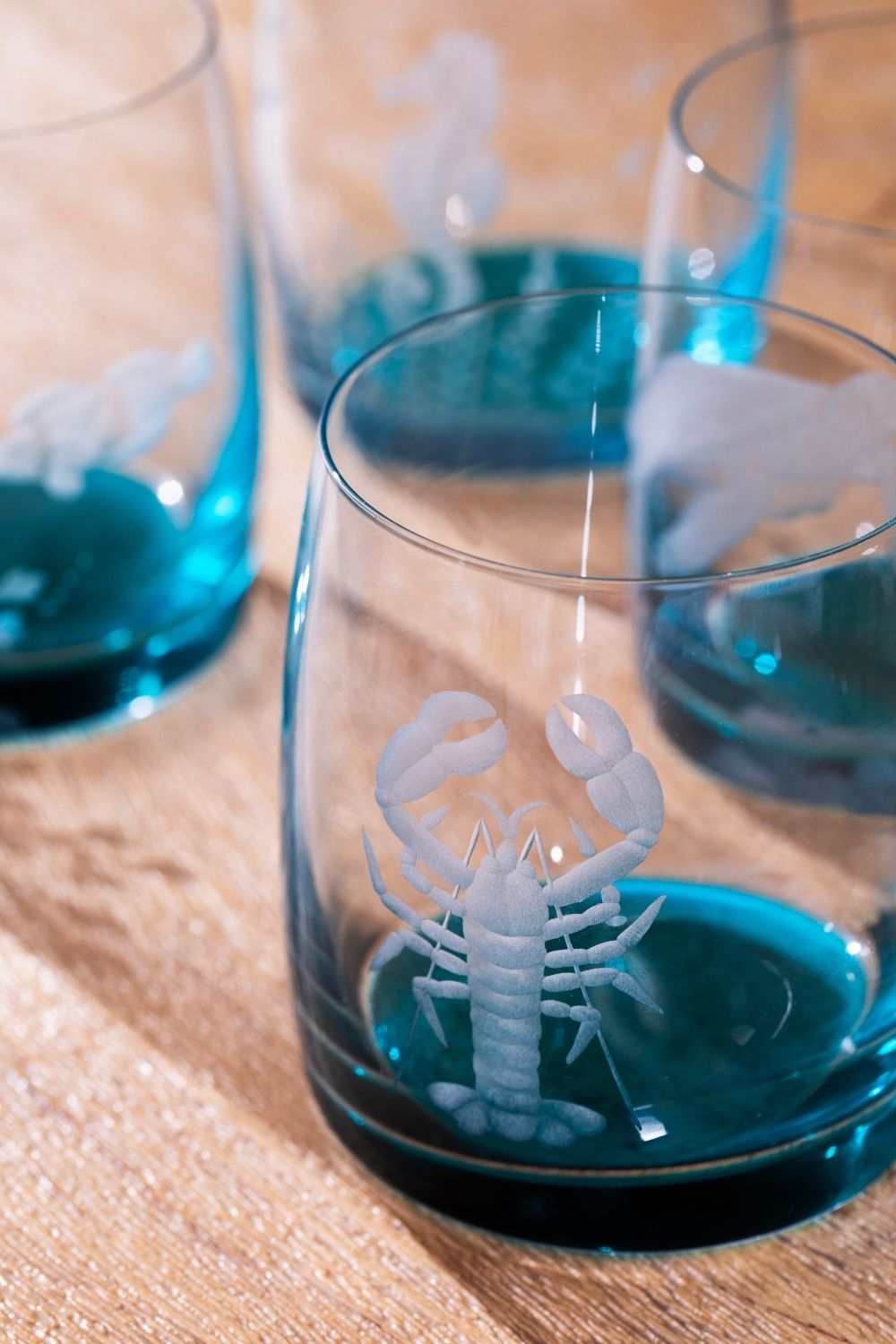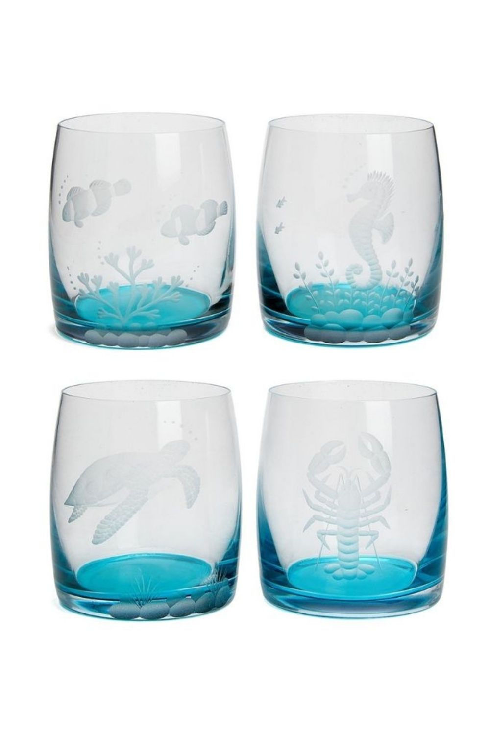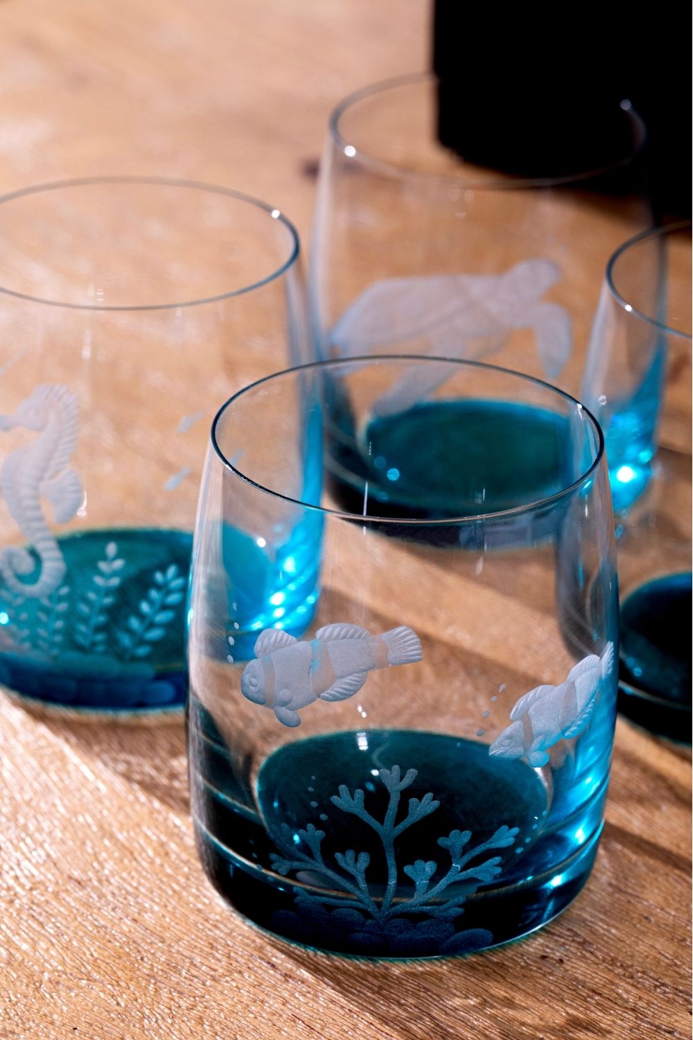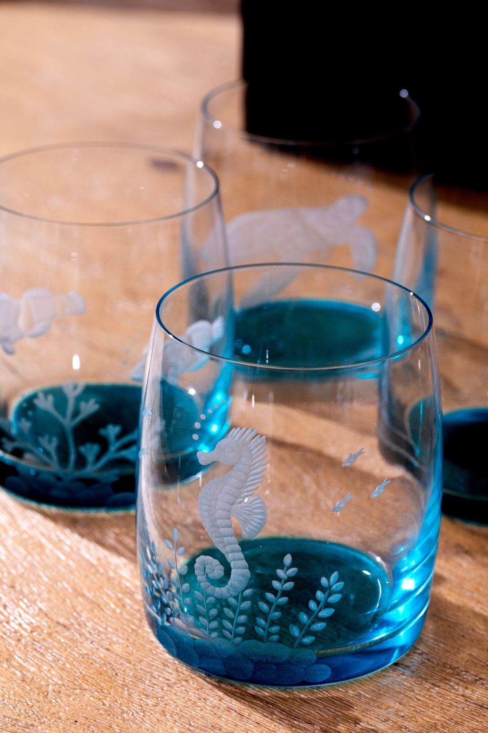 Kutu içeriği 4 adet gravürlü bardak (Denizatı desenli cam bardak, Palyaço balığı desenli cam bardak, Istakoz desenli cam bardak, Caretta desenli cam bardak)
